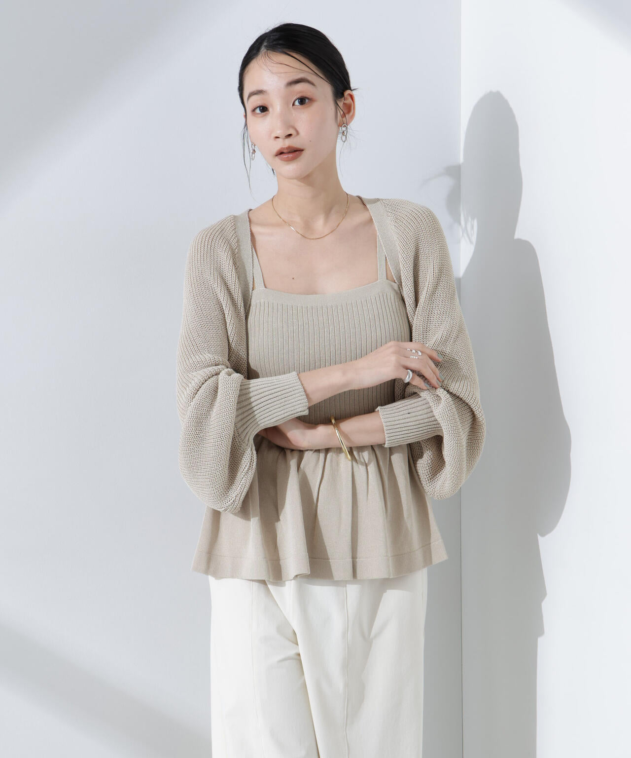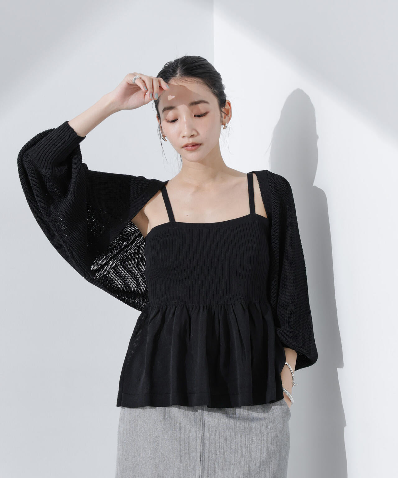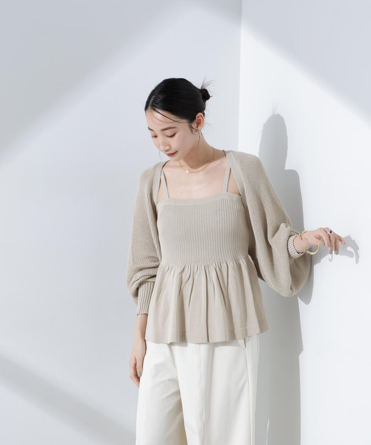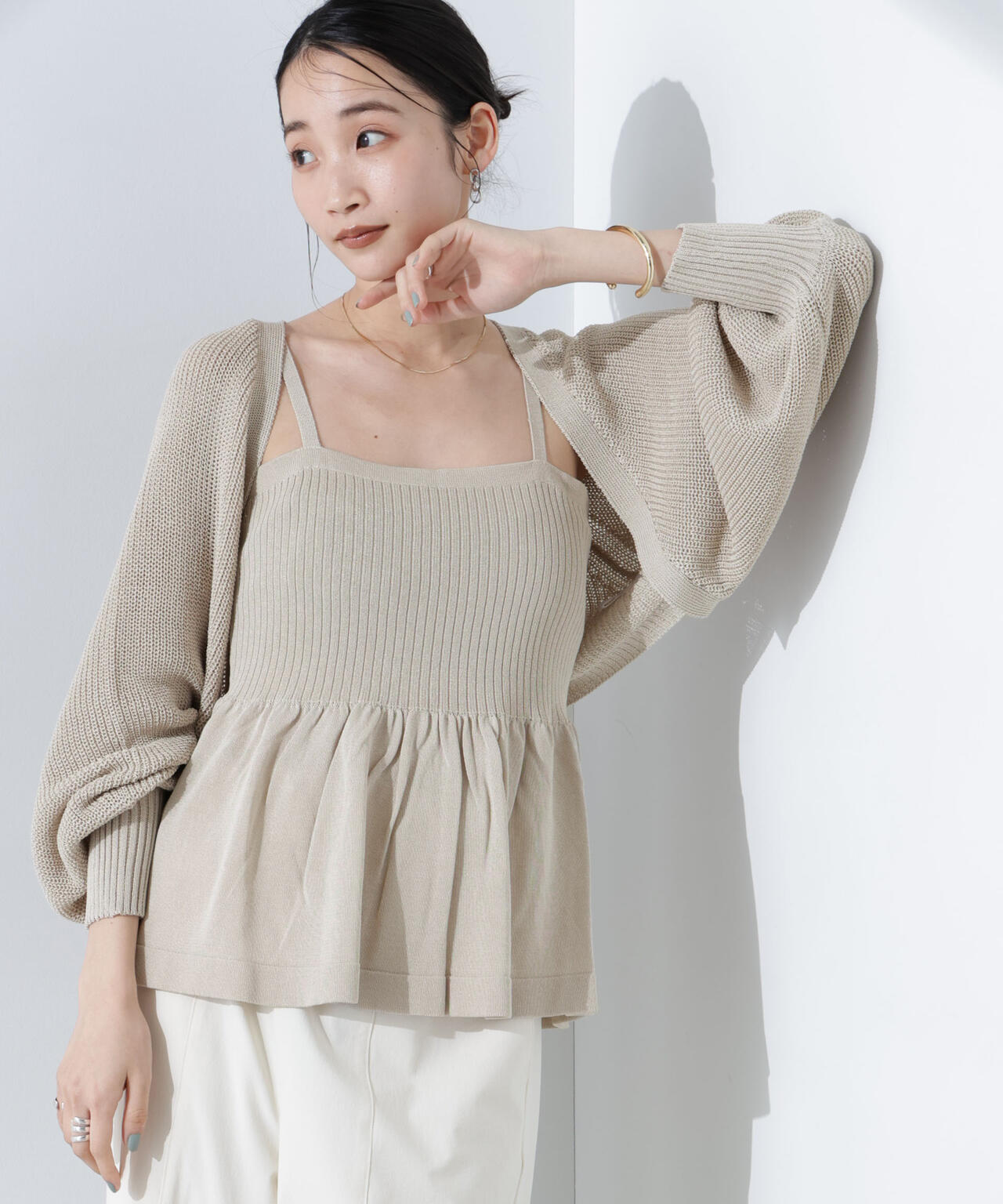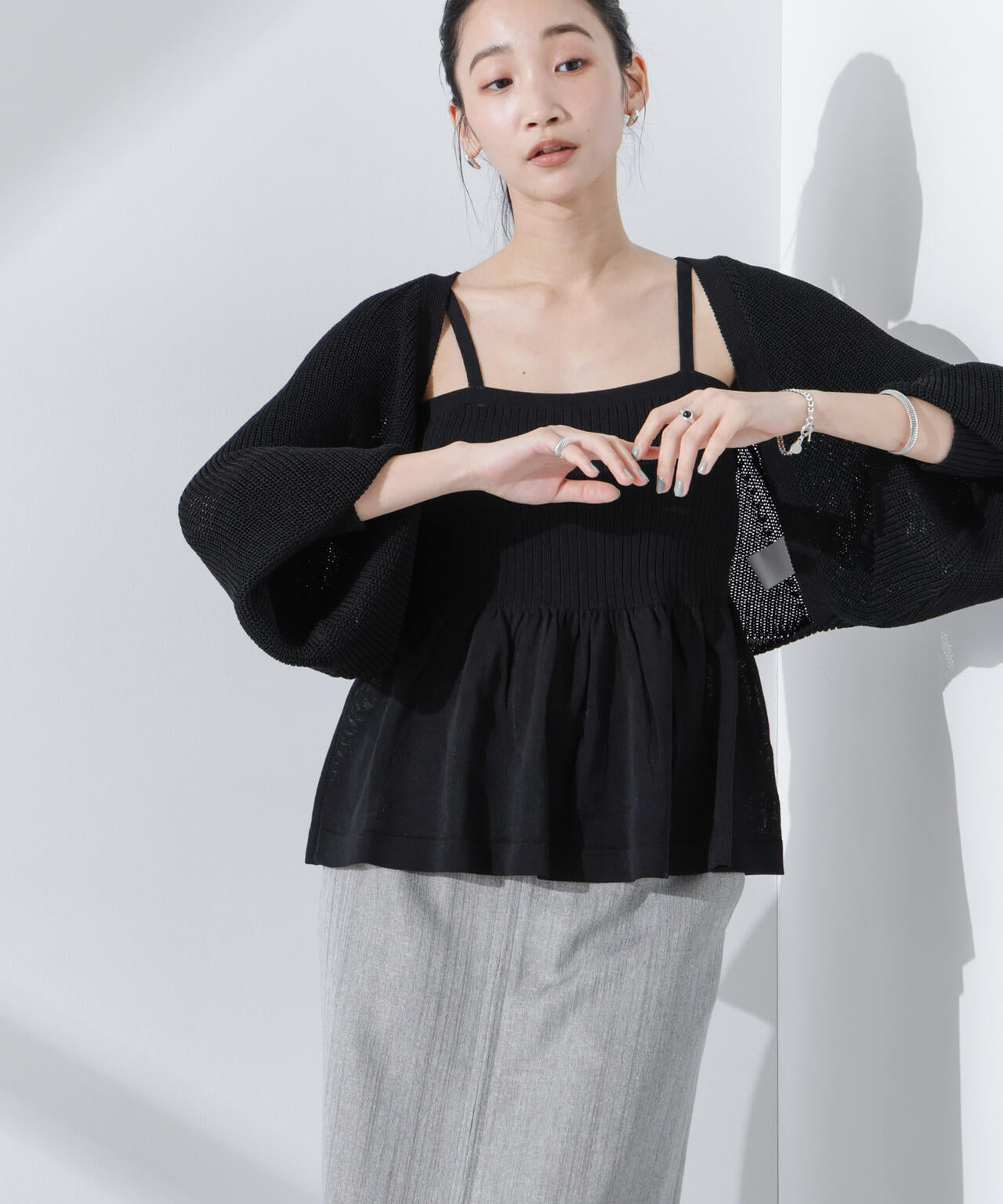 キャッチーなペプラムシルエットのキャミソールと、ショート丈ボレロのニットアンサンブル。セットで着用してトレンドスタイルが様になるだけでなく、それぞれ単品でも着回しやすく、コーディネートの幅が広がる万能アイテムです。