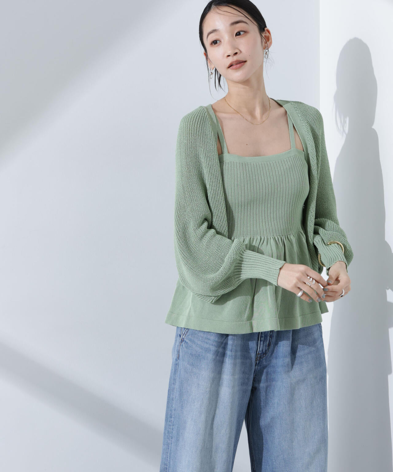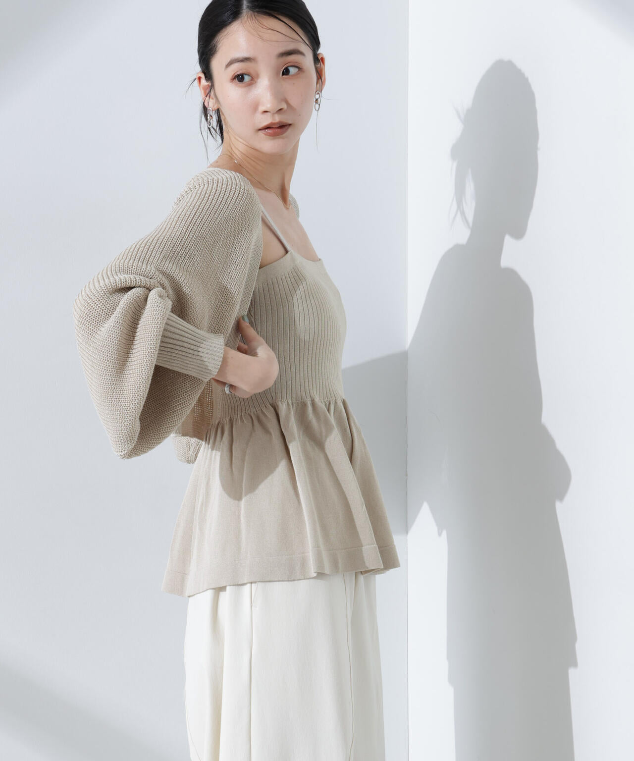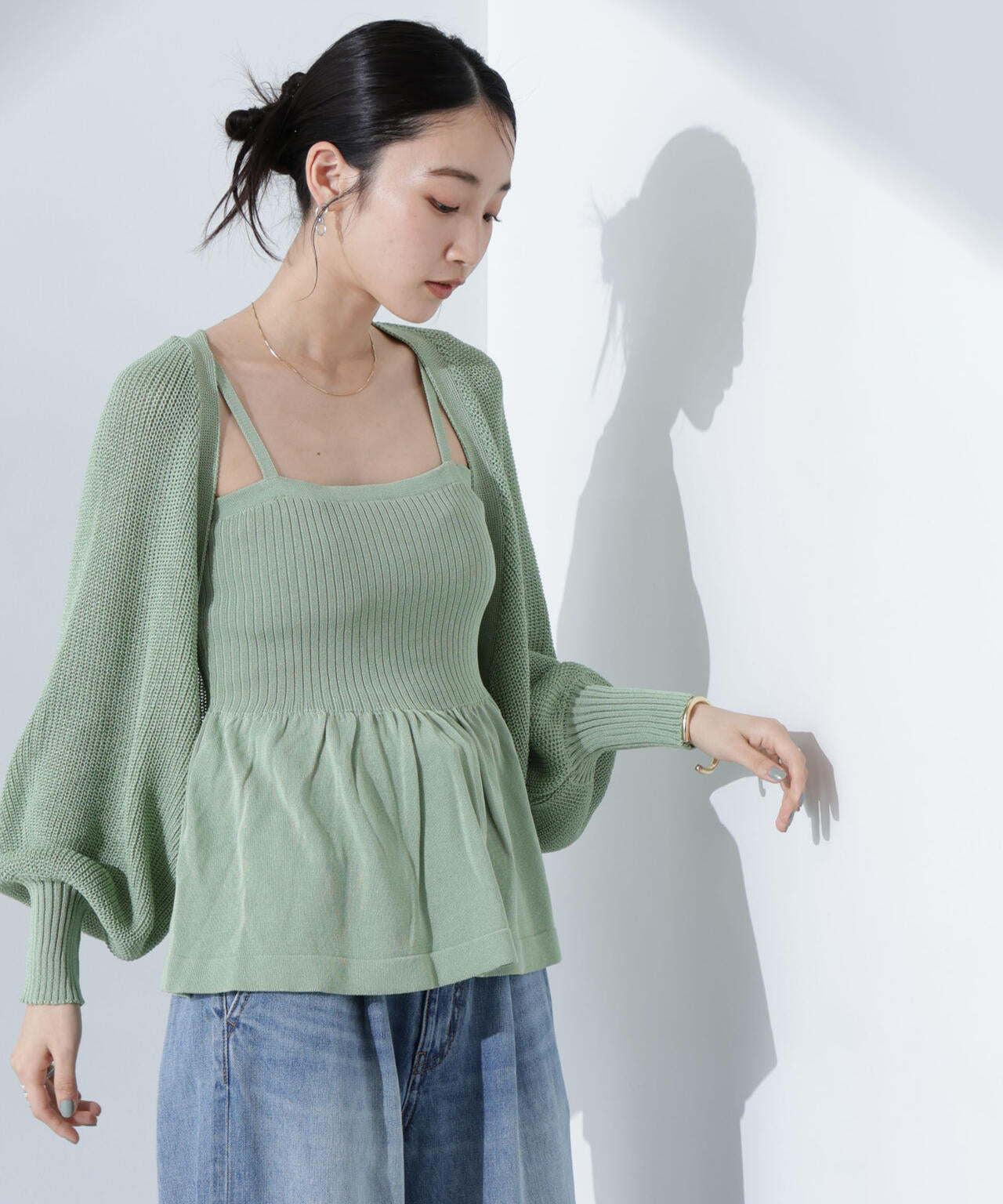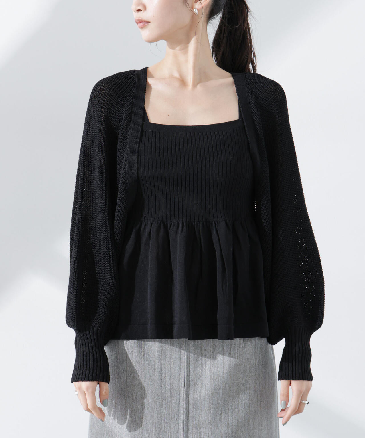 キャッチーなペプラムシルエットのキャミソールと、ショート丈ボレロのニットアンサンブル。セットで着用してトレンドスタイルが様になるだけでなく、それぞれ単品でも着回しやすく、コーディネートの幅が広がる万能アイテムです。