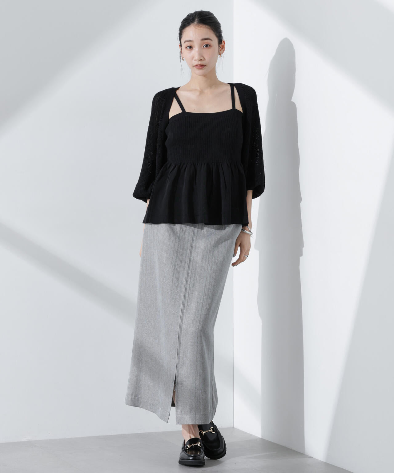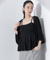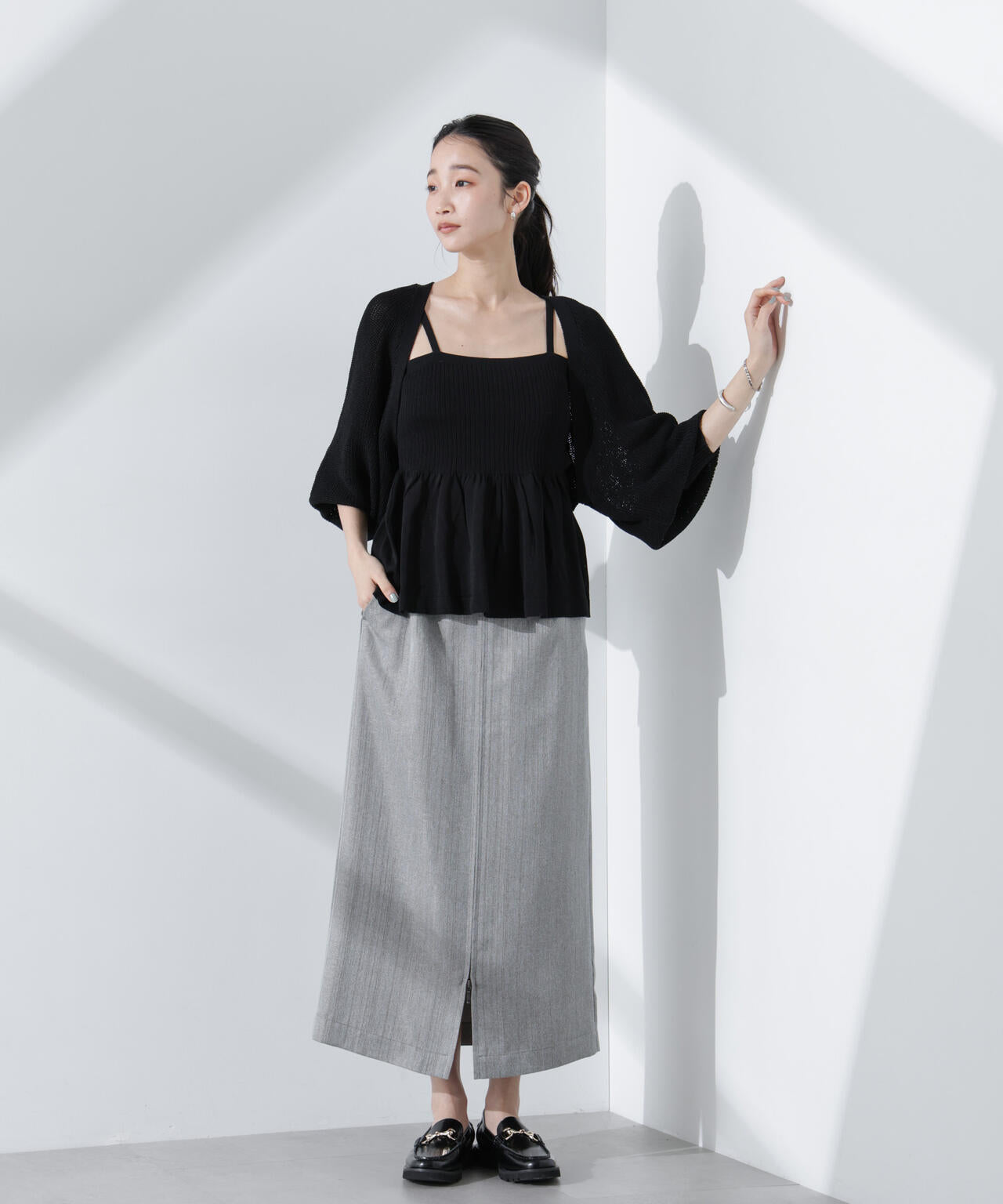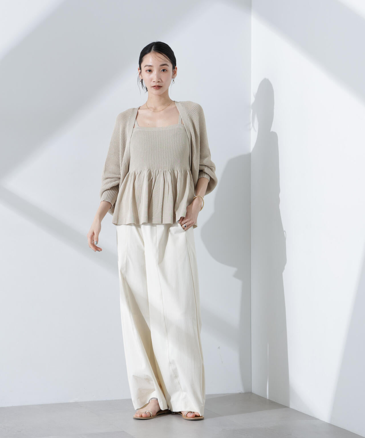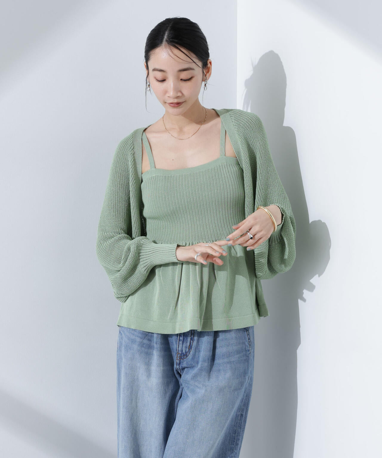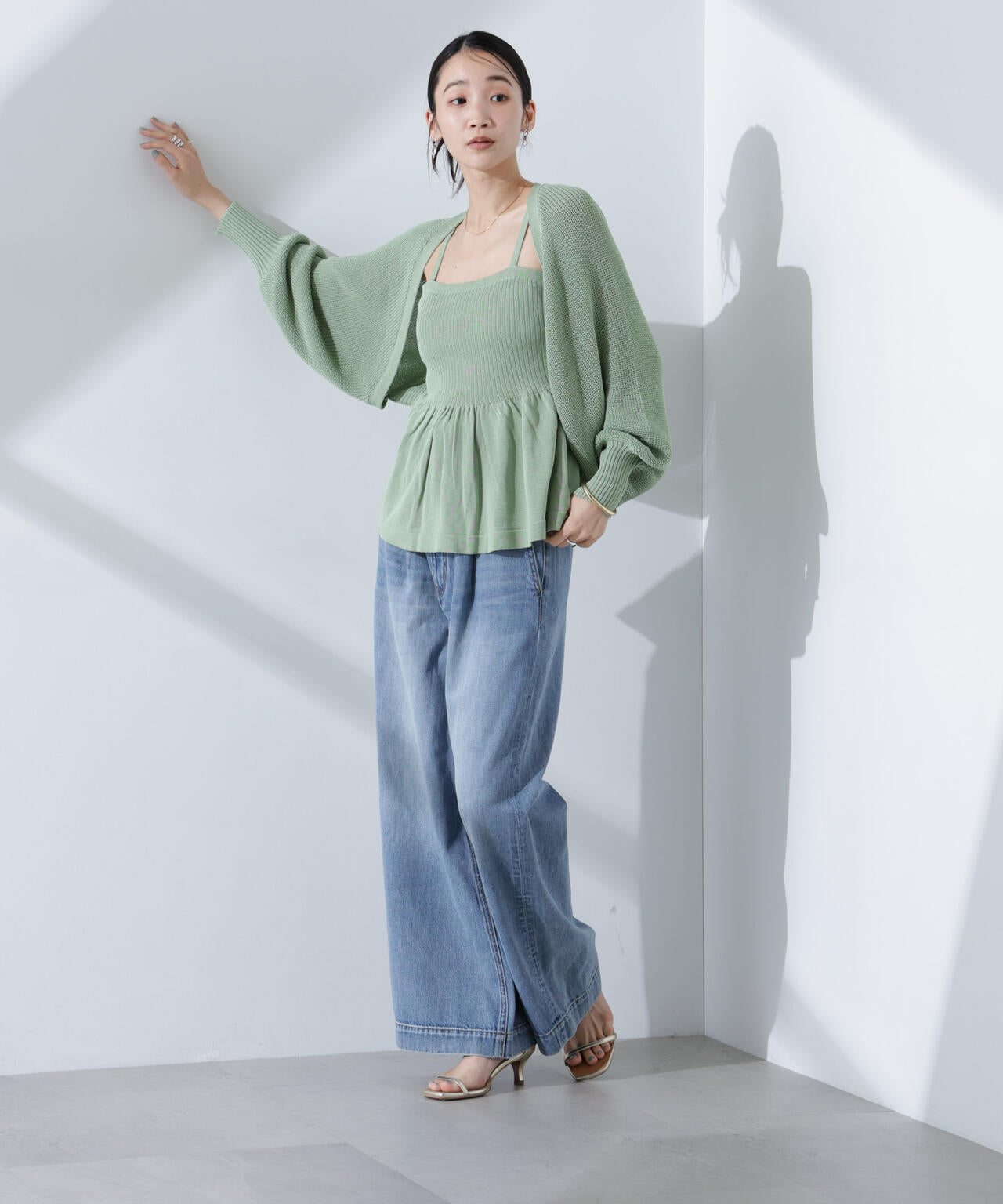 キャッチーなペプラムシルエットのキャミソールと、ショート丈ボレロのニットアンサンブル。セットで着用してトレンドスタイルが様になるだけでなく、それぞれ単品でも着回しやすく、コーディネートの幅が広がる万能アイテムです。