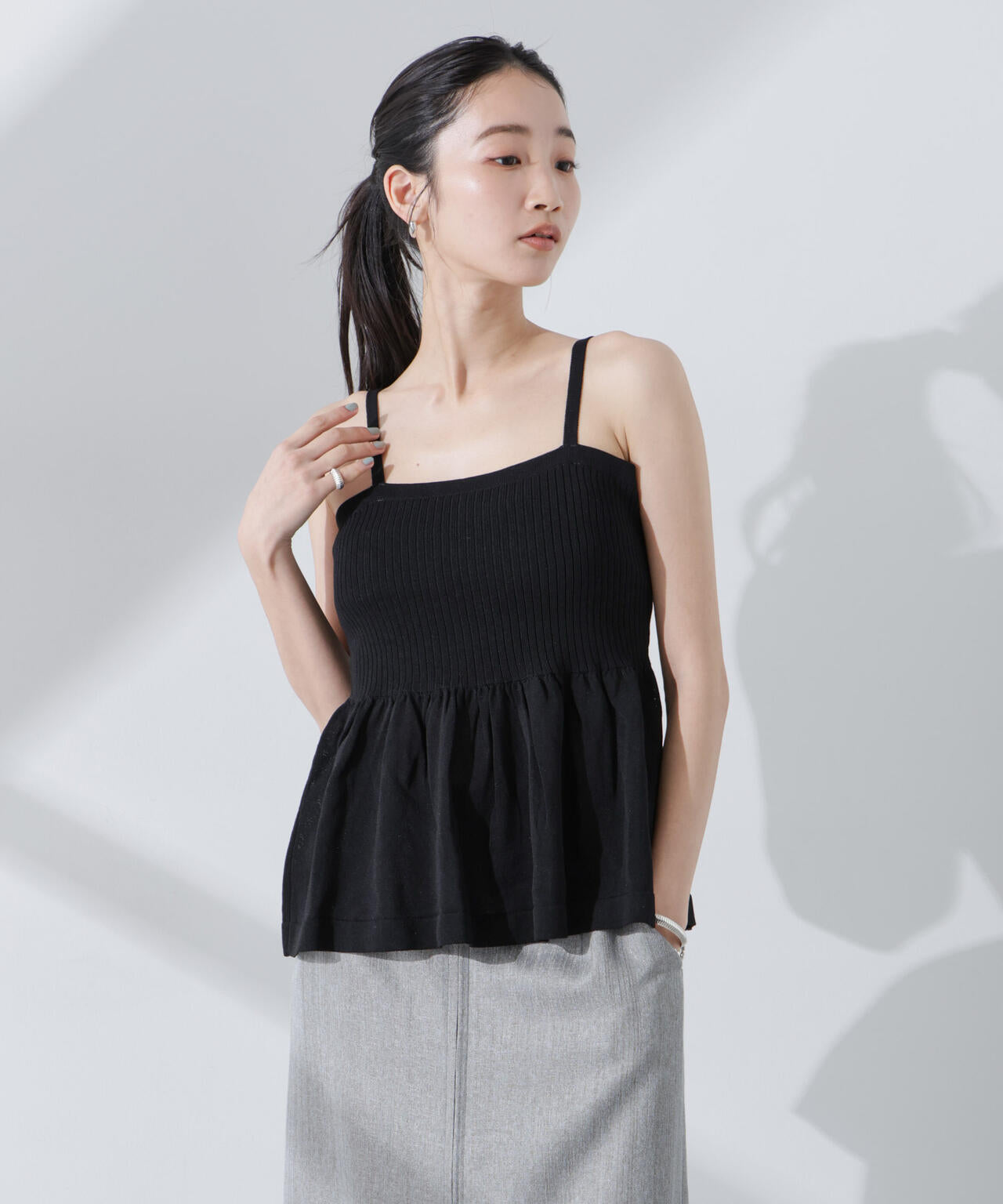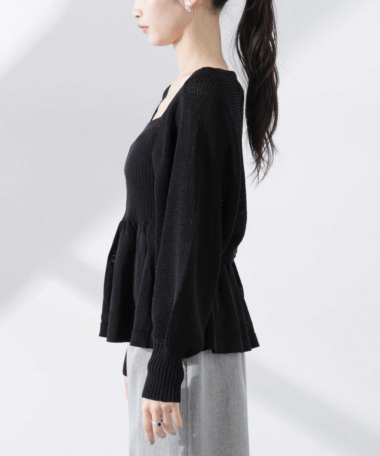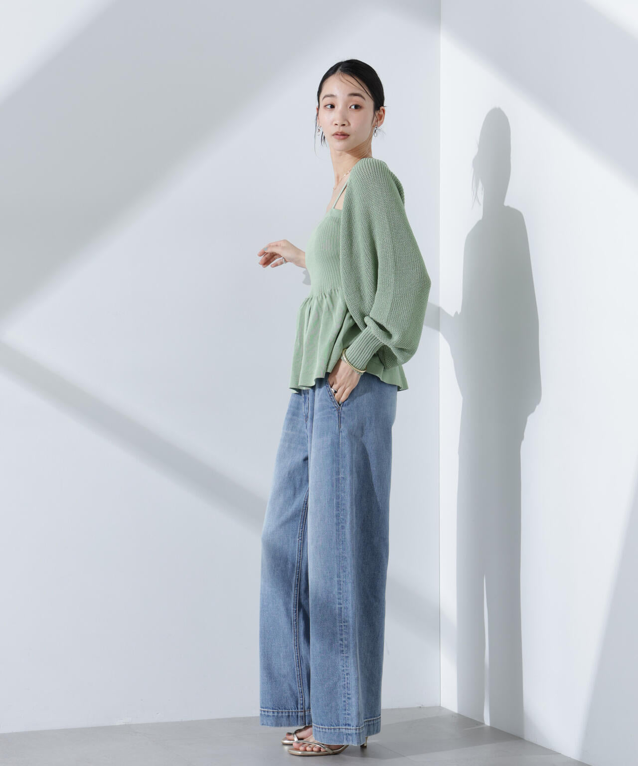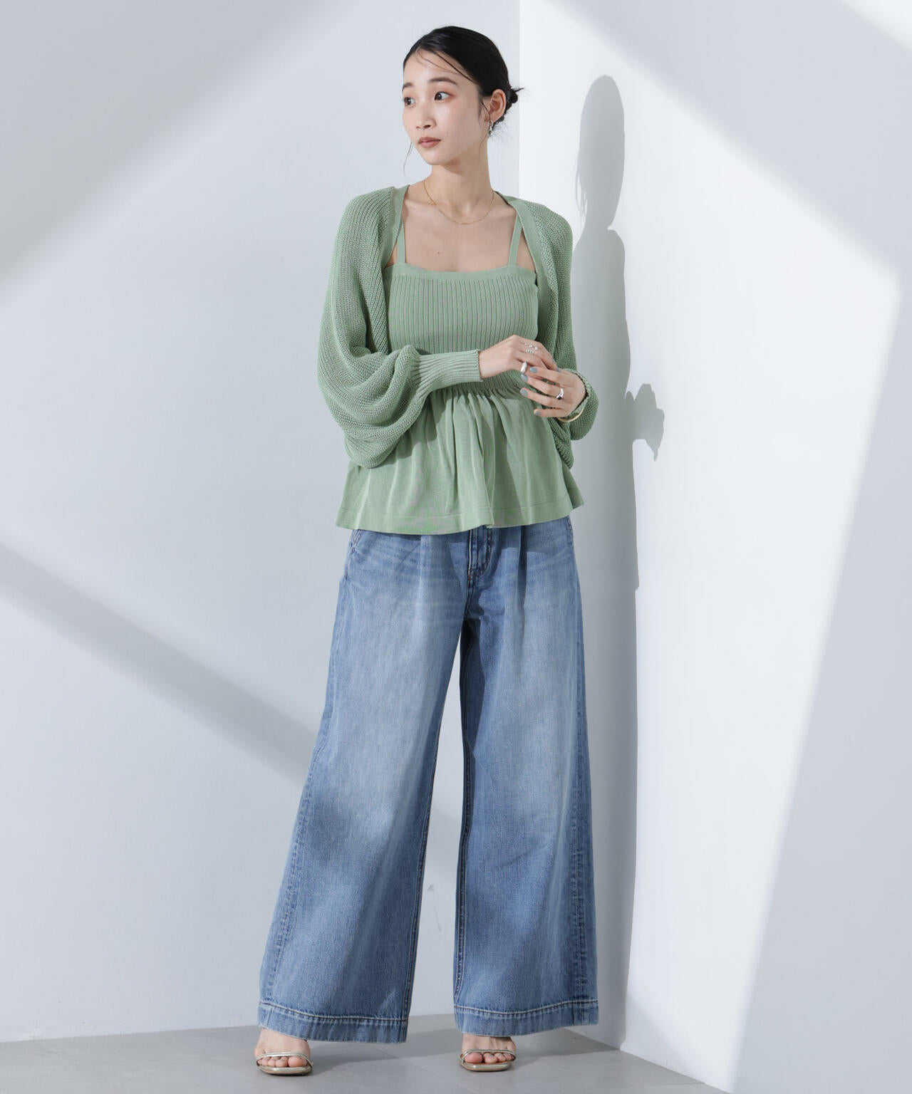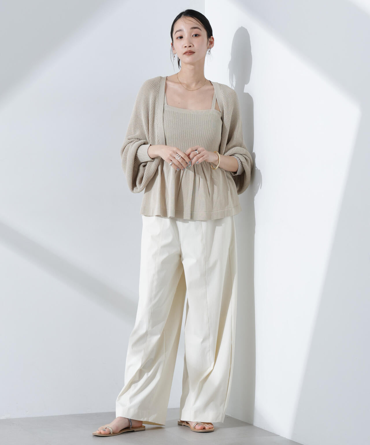 キャッチーなペプラムシルエットのキャミソールと、ショート丈ボレロのニットアンサンブル。セットで着用してトレンドスタイルが様になるだけでなく、それぞれ単品でも着回しやすく、コーディネートの幅が広がる万能アイテムです。