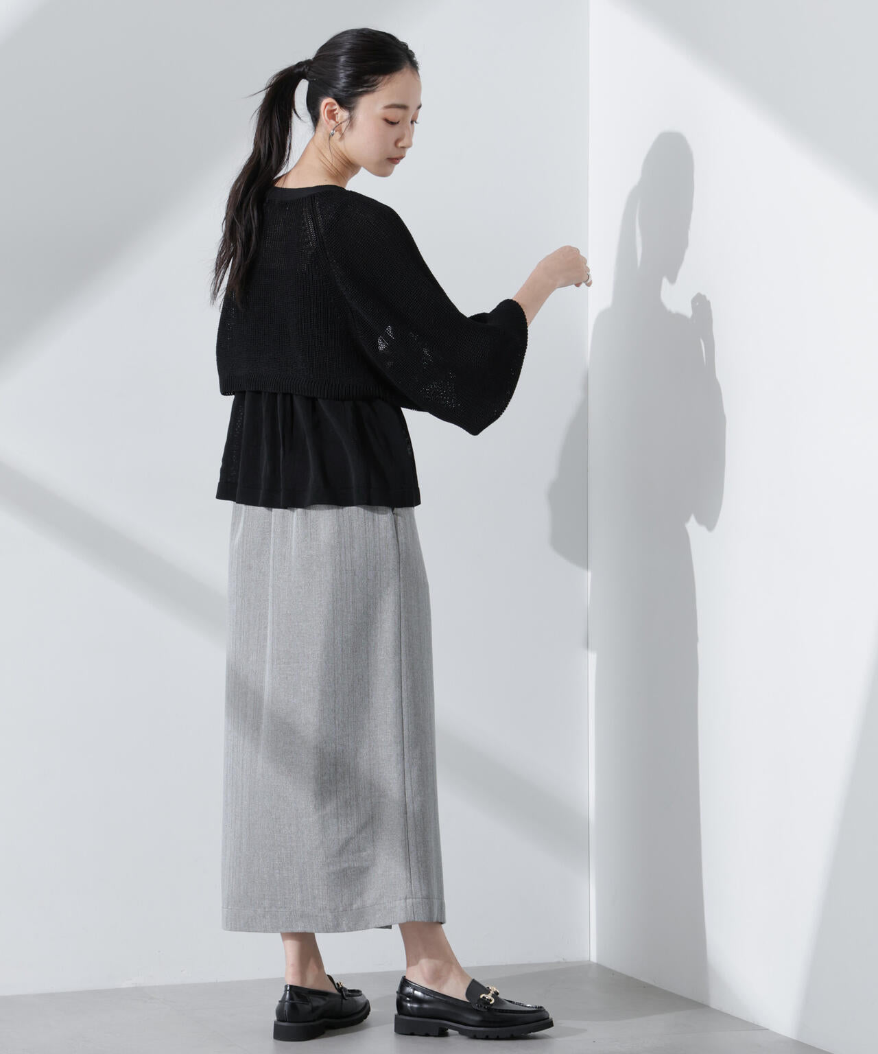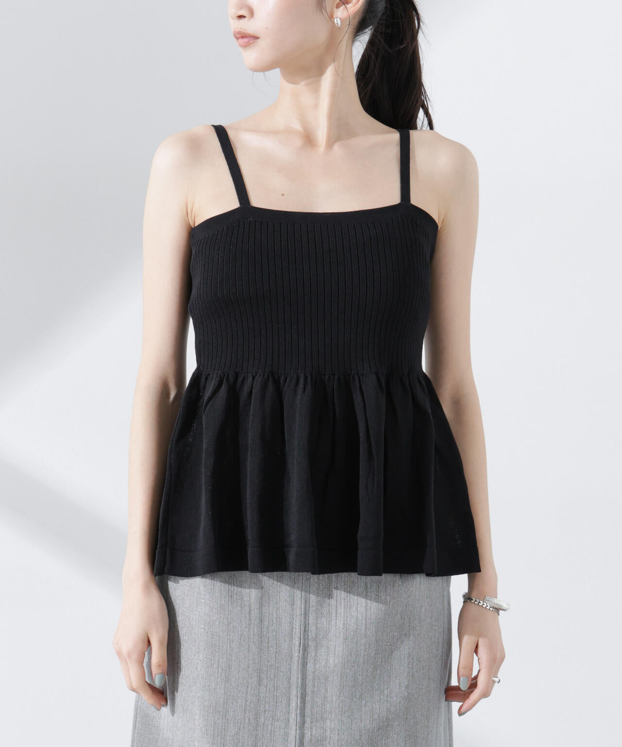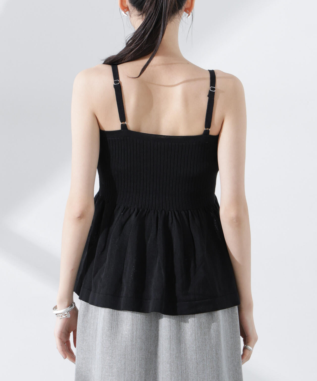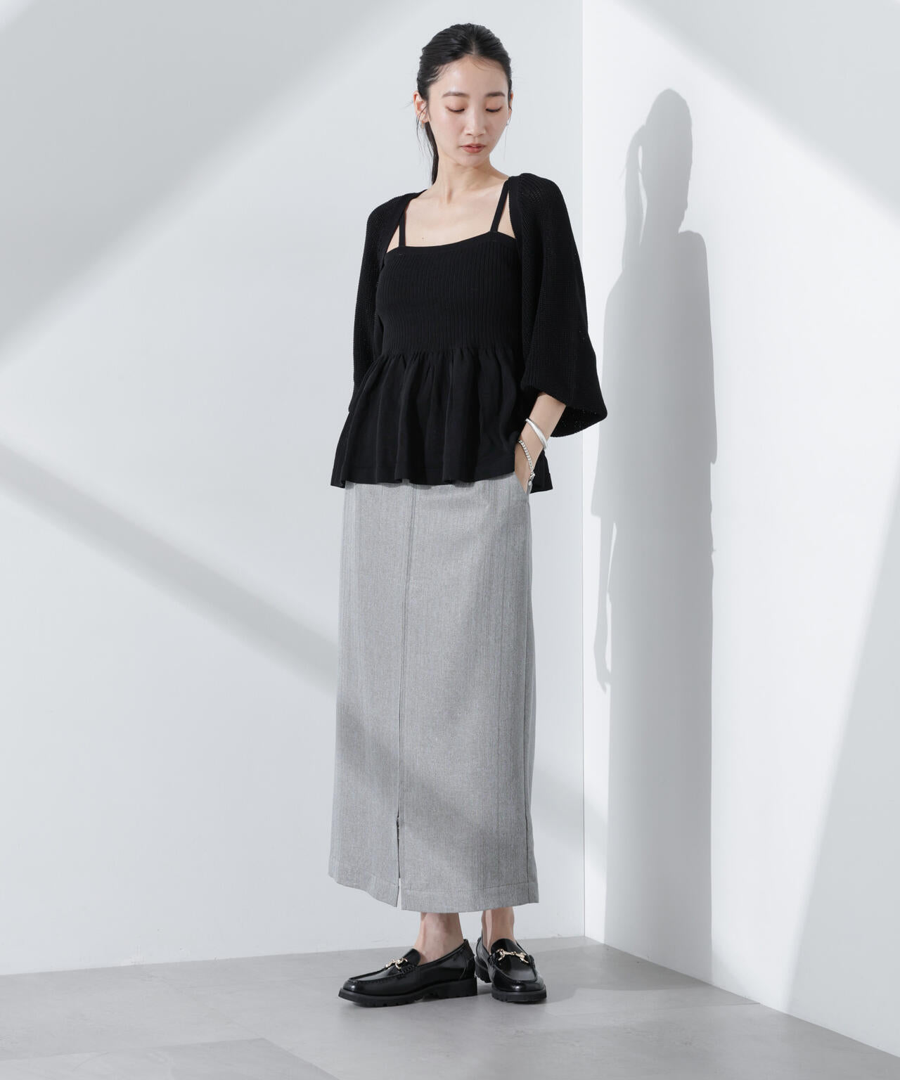 キャッチーなペプラムシルエットのキャミソールと、ショート丈ボレロのニットアンサンブル。セットで着用してトレンドスタイルが様になるだけでなく、それぞれ単品でも着回しやすく、コーディネートの幅が広がる万能アイテムです。