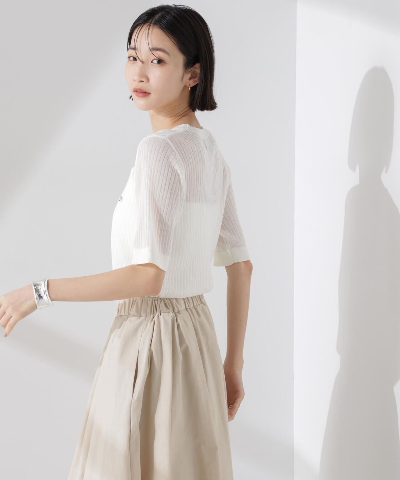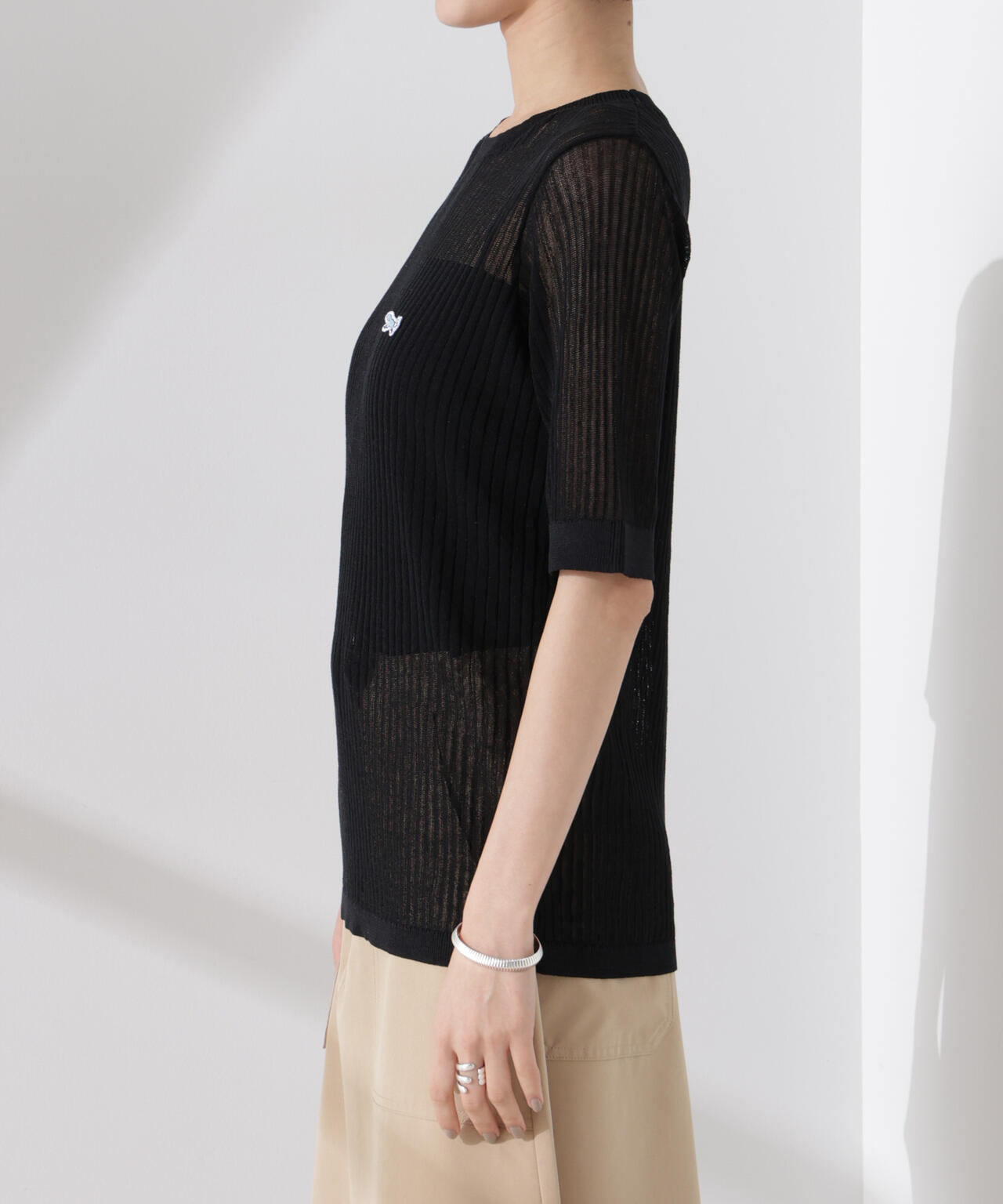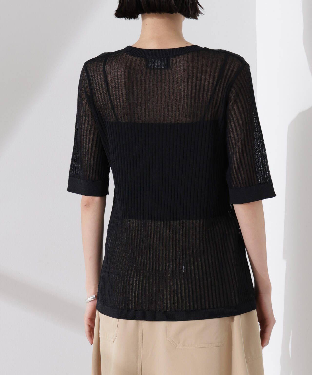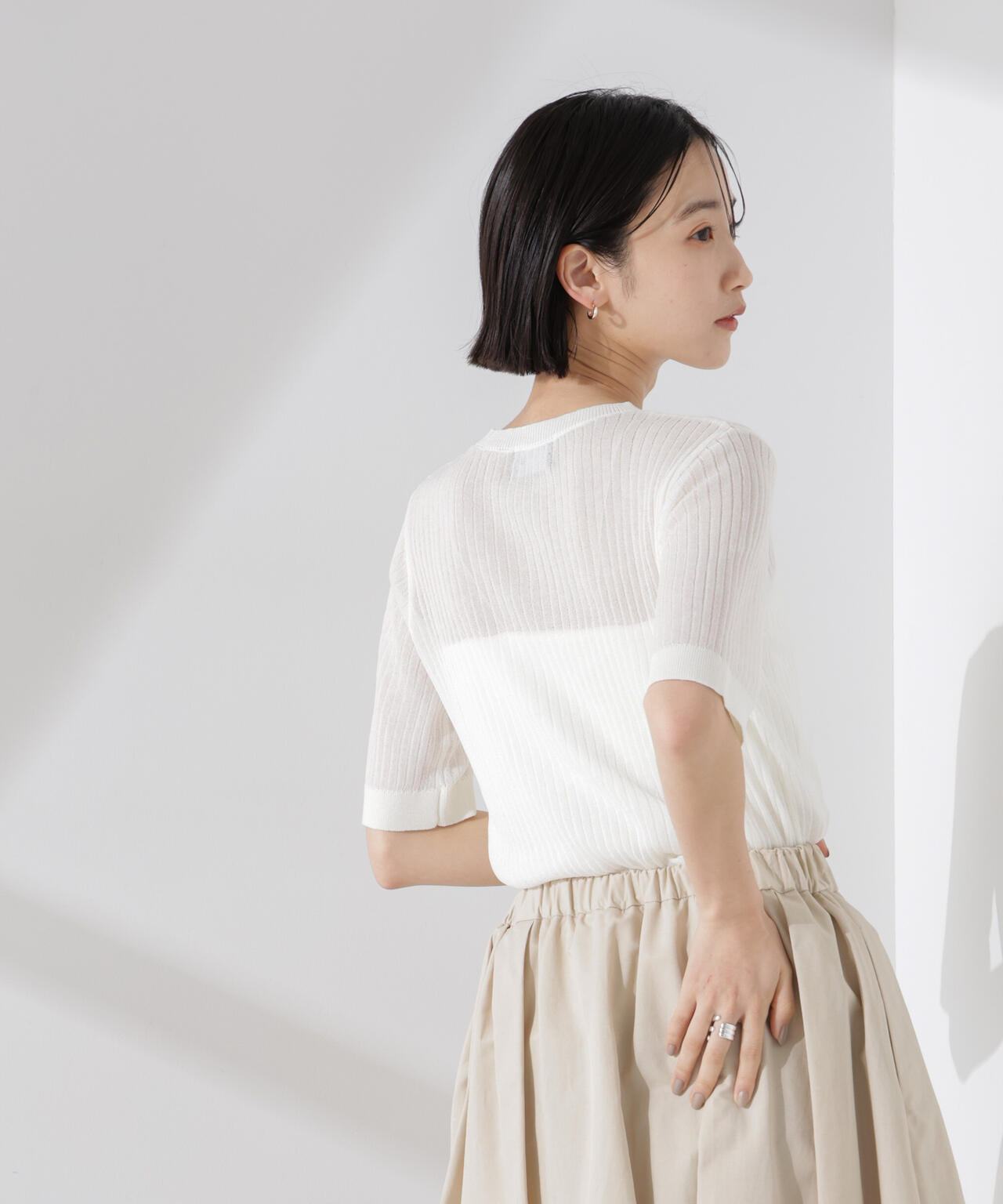 程良いシアーの透け感とリブデザインが上品な雰囲気のニットトップス。身体のラインを拾わないややゆとりのあるシルエットで、インナーも合わせやすいデザイン。ワイドパンツやフレアスカート等、シンプルなボトムスと相性の良い一着です。