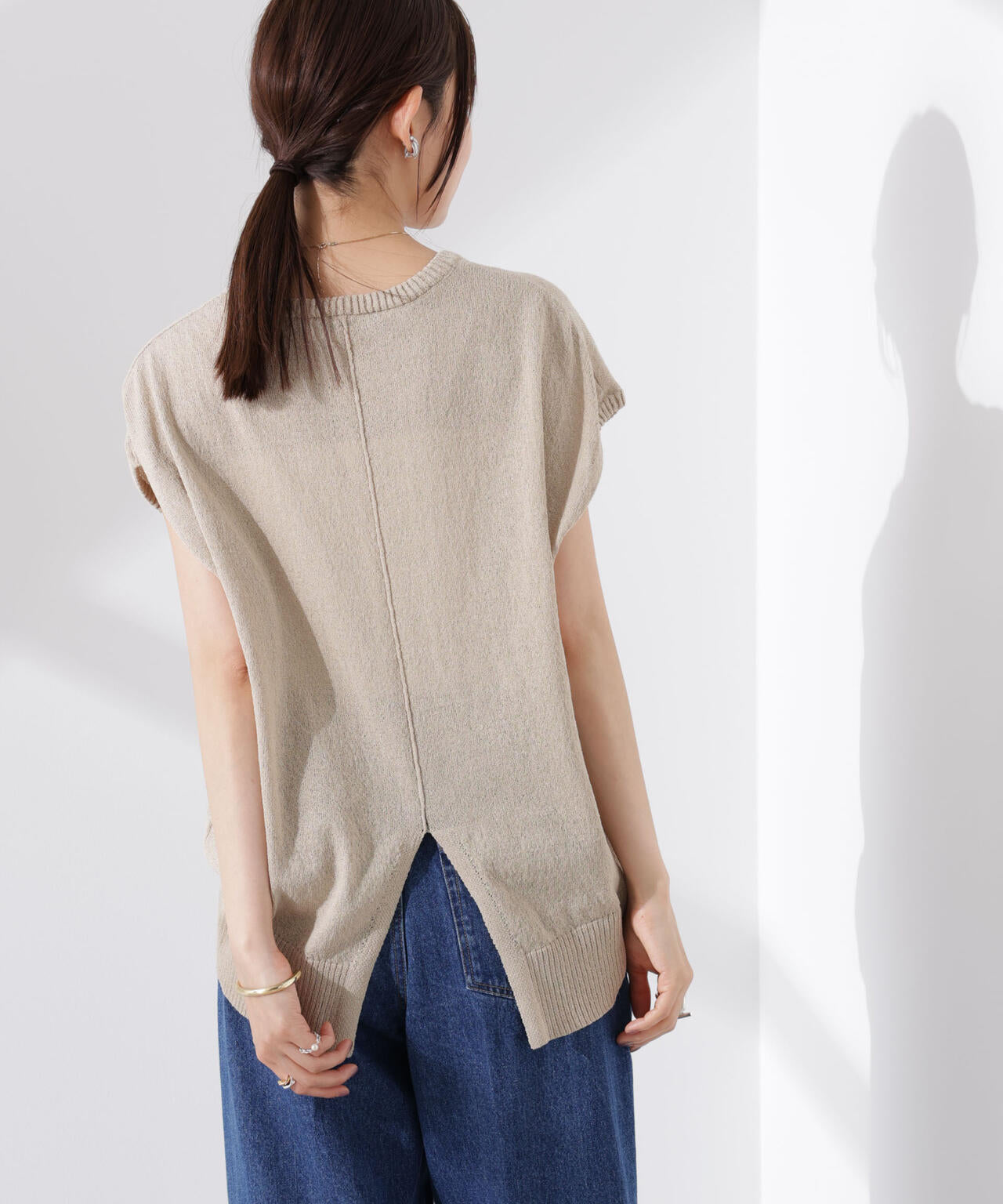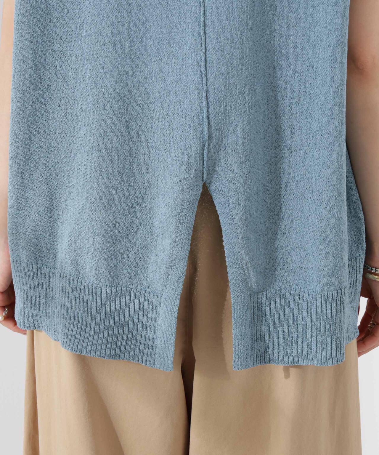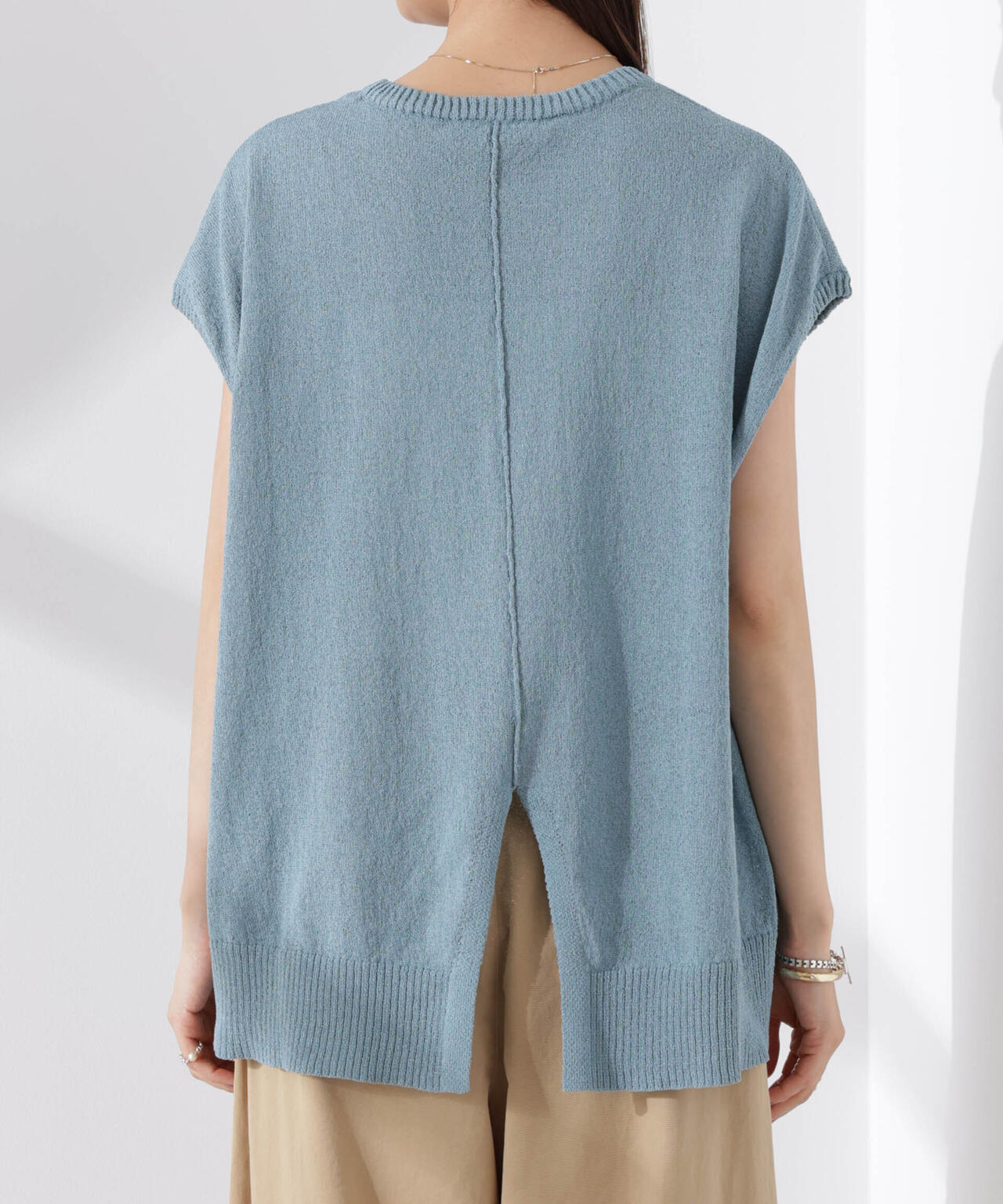程良いシアー感がアクセントになった清涼感のあるサマーニット。バックスリットがポイントで夏のレイヤードスタイルにぴったりなアイテム。ポリエステルの軽量で通気性の良い素材使用し、夏でも快適に着ることができる一枚です。