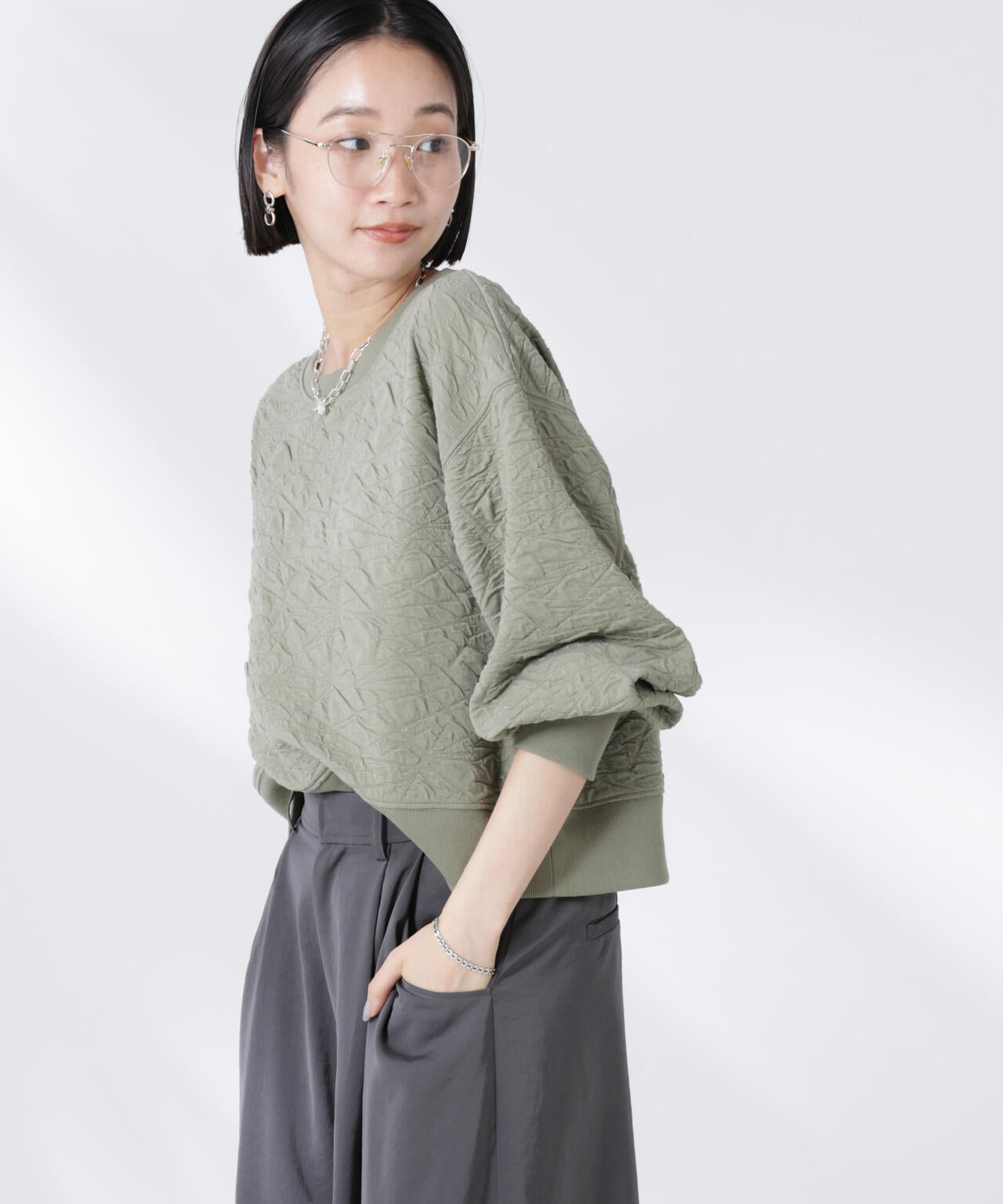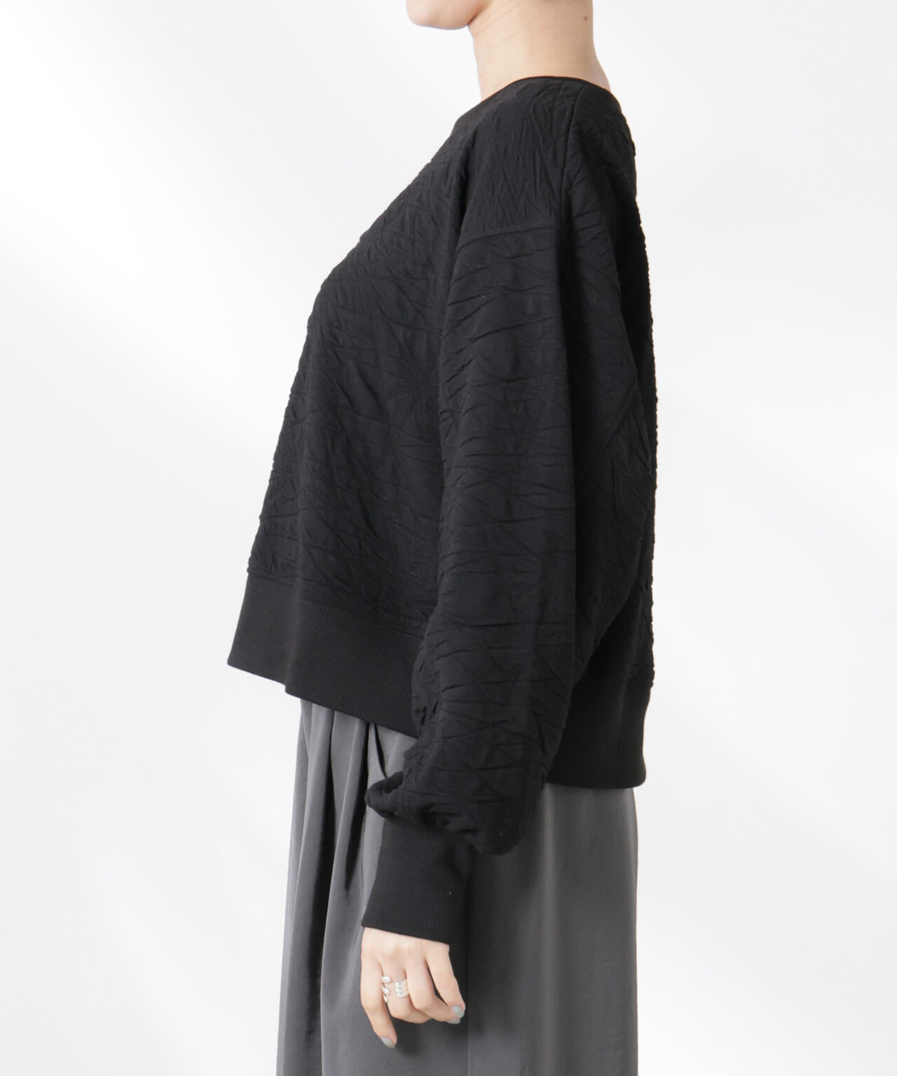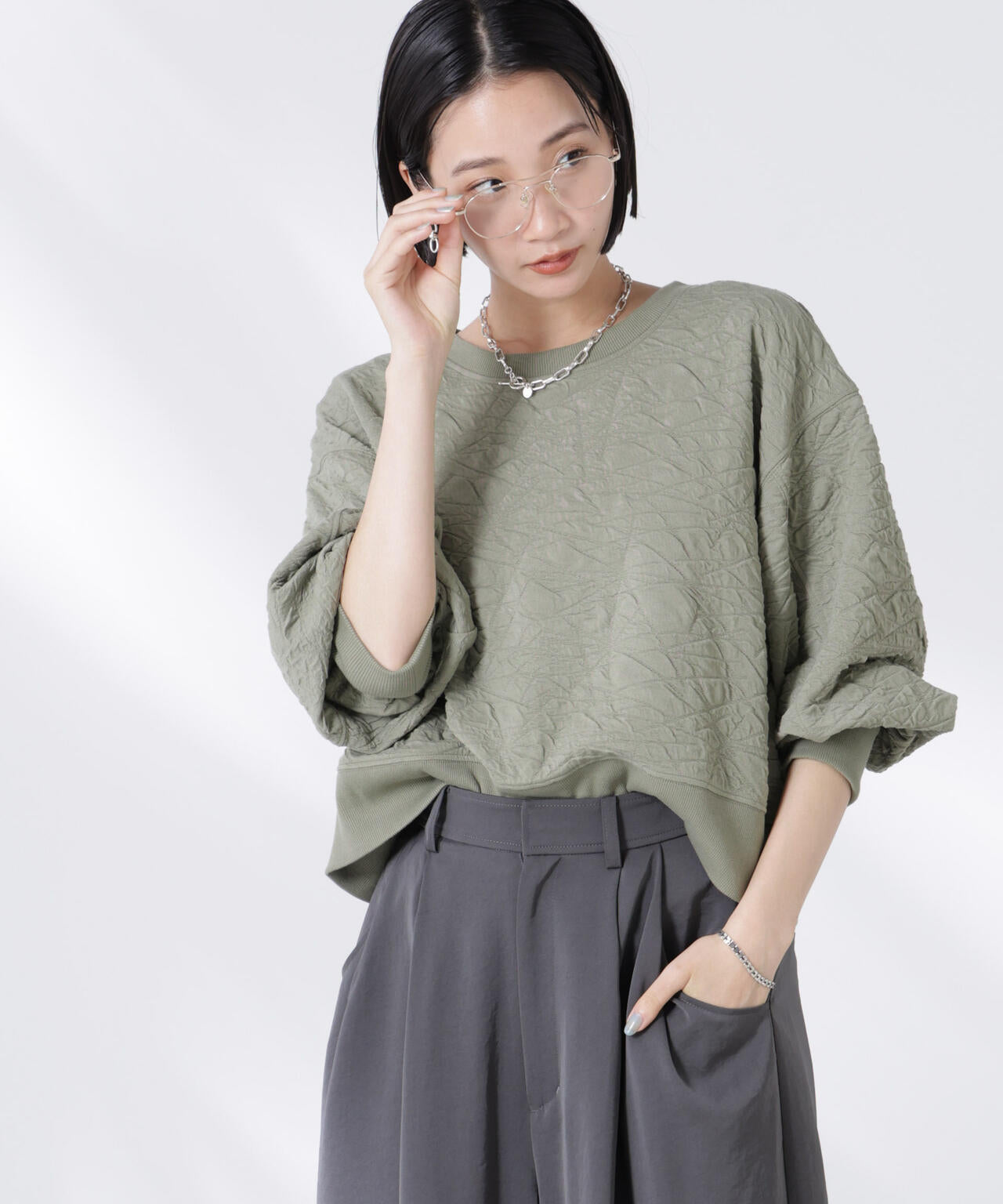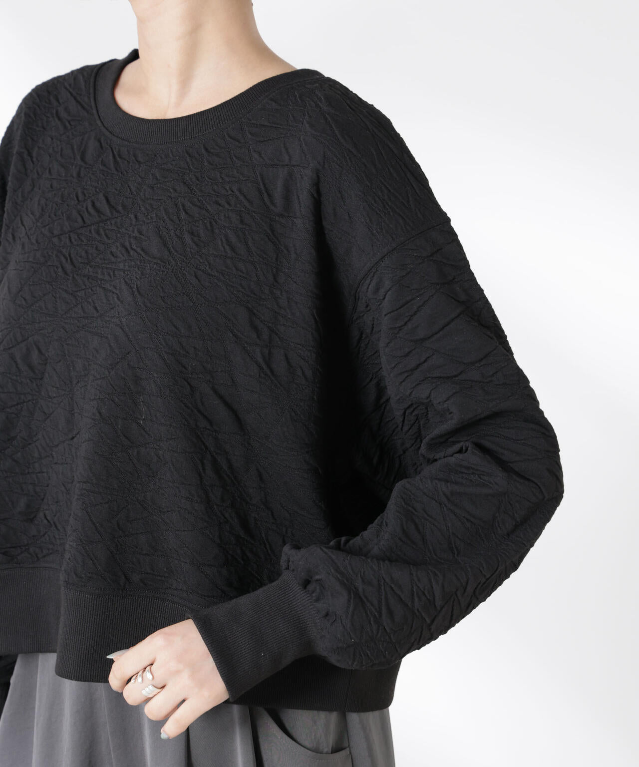 ポコポコした素材が魅力のクルーネックプルオーバー。ドロップショルダーで肩と身幅にゆとりを持たせた着心地のよいサイズ感で、やや短めのクロップド丈がスタイルアップに貢献。程よい凹凸感がコーディネートのアクセントにもなるデイリーに着回したいアイテムです!
