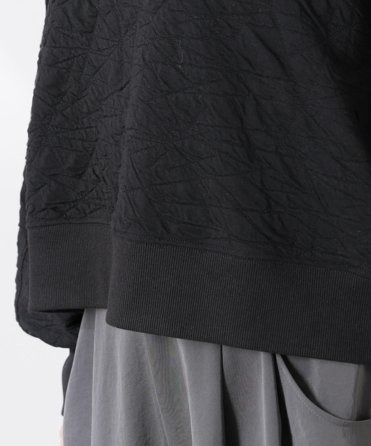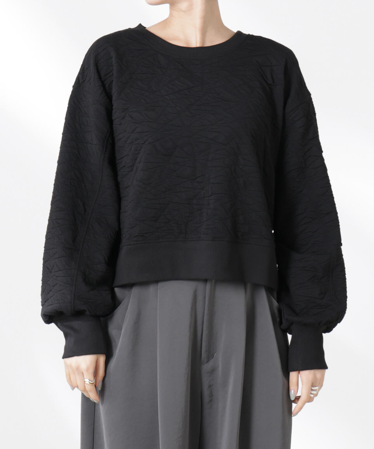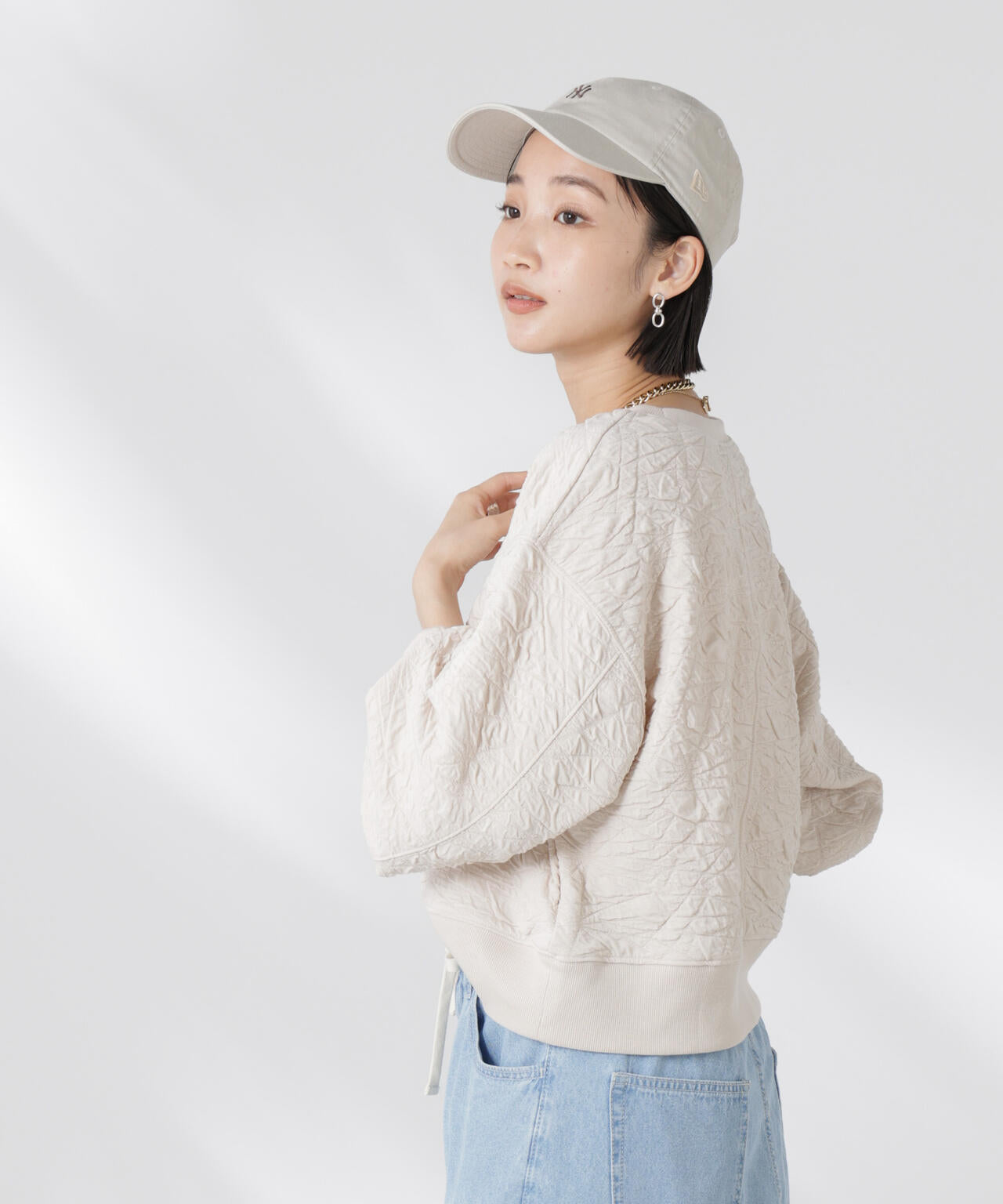 ポコポコした素材が魅力のクルーネックプルオーバー。ドロップショルダーで肩と身幅にゆとりを持たせた着心地のよいサイズ感で、やや短めのクロップド丈がスタイルアップに貢献。程よい凹凸感がコーディネートのアクセントにもなるデイリーに着回したいアイテムです!