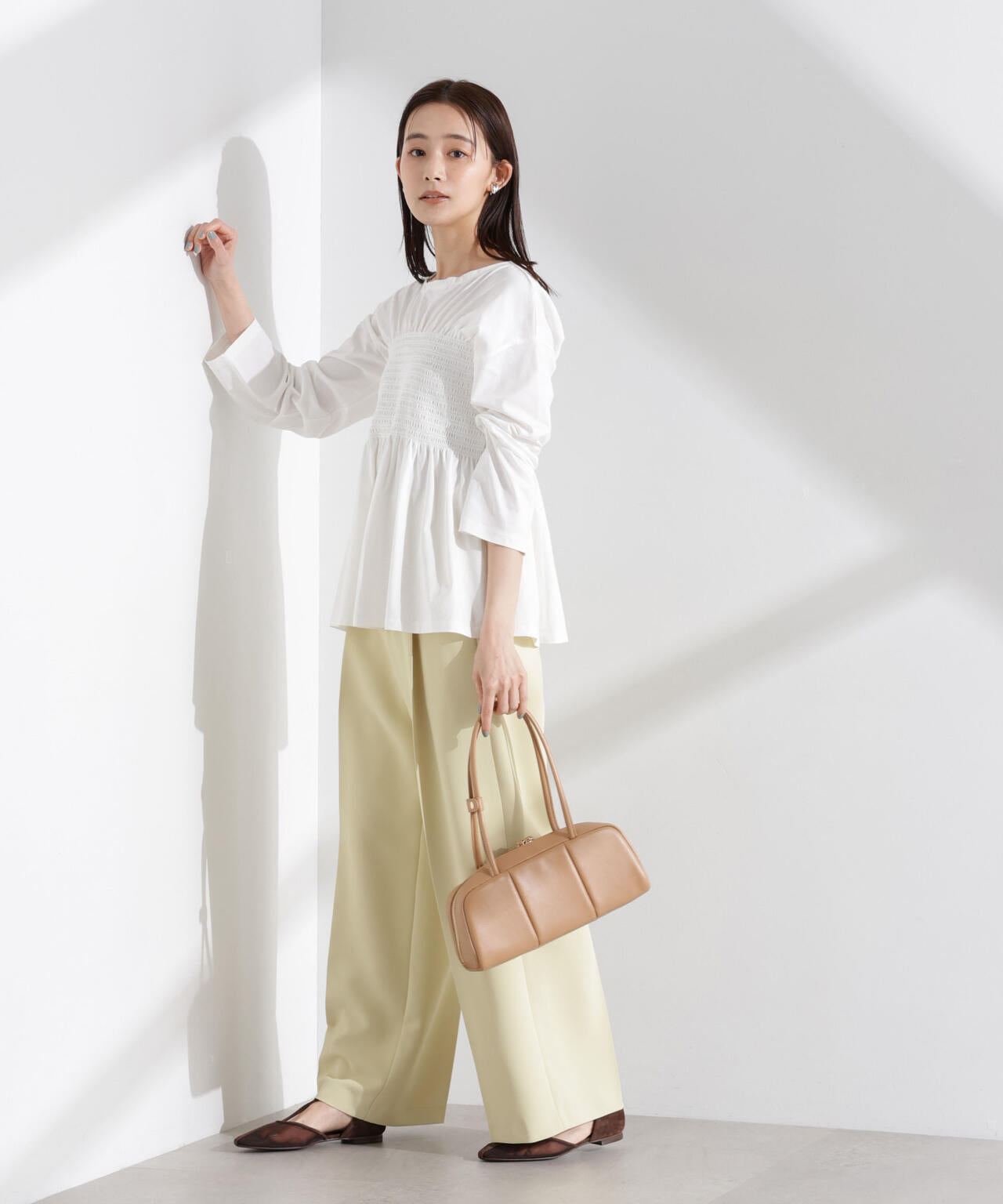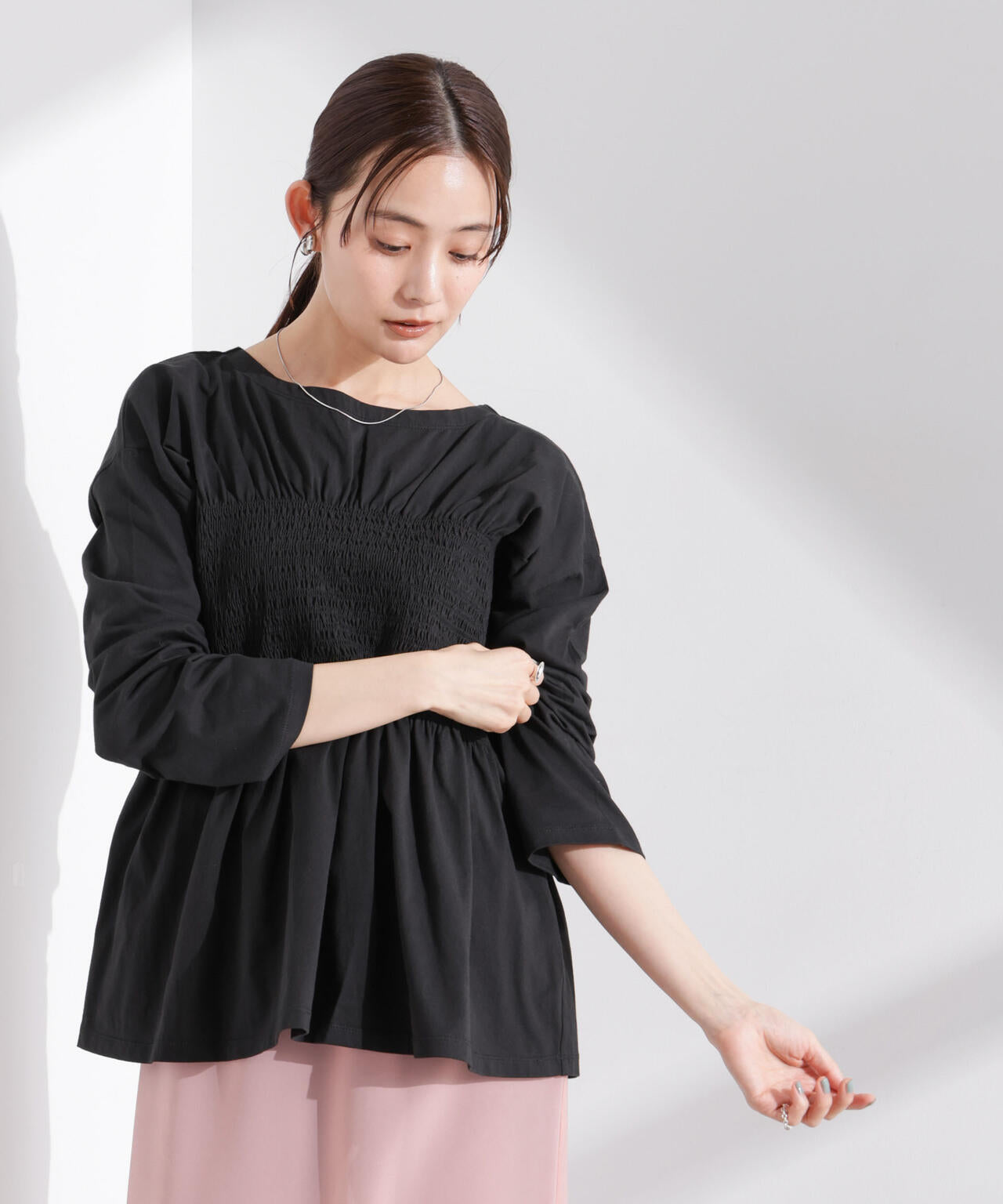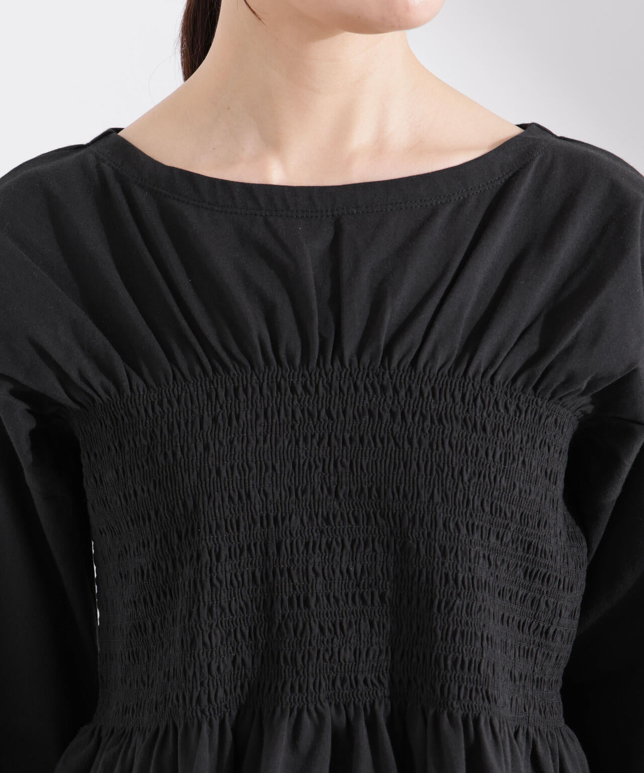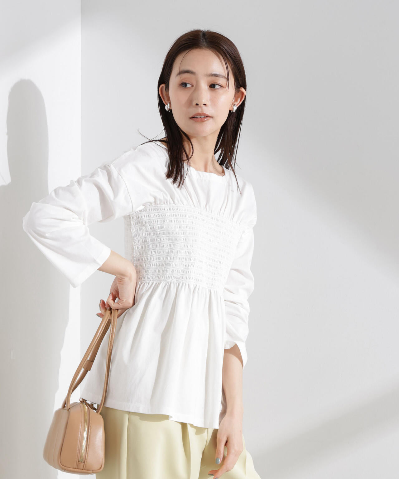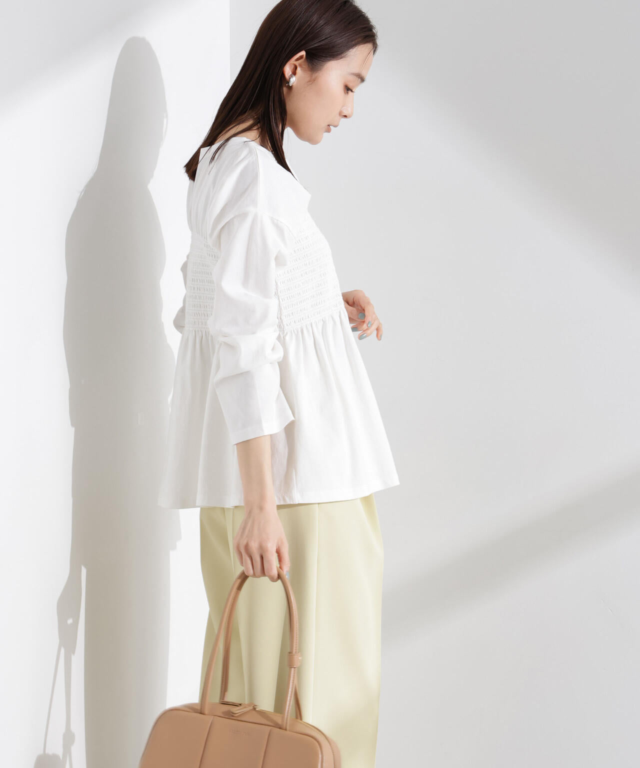 胸元にビスチェのようなシャーリング加工を施した、ブラウスライクなカットソー。女性らしくトレンドライクなルックスに仕上げてくれるので、シンプルなボトムと合わせるだけで様になります。
