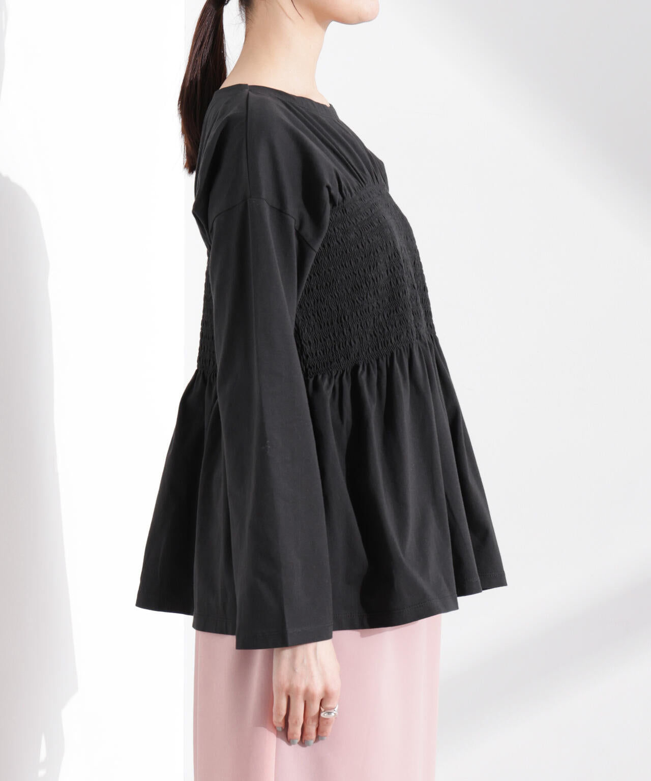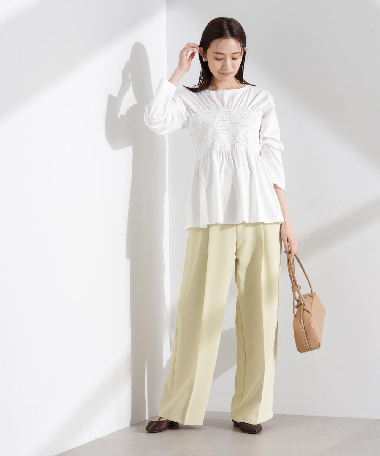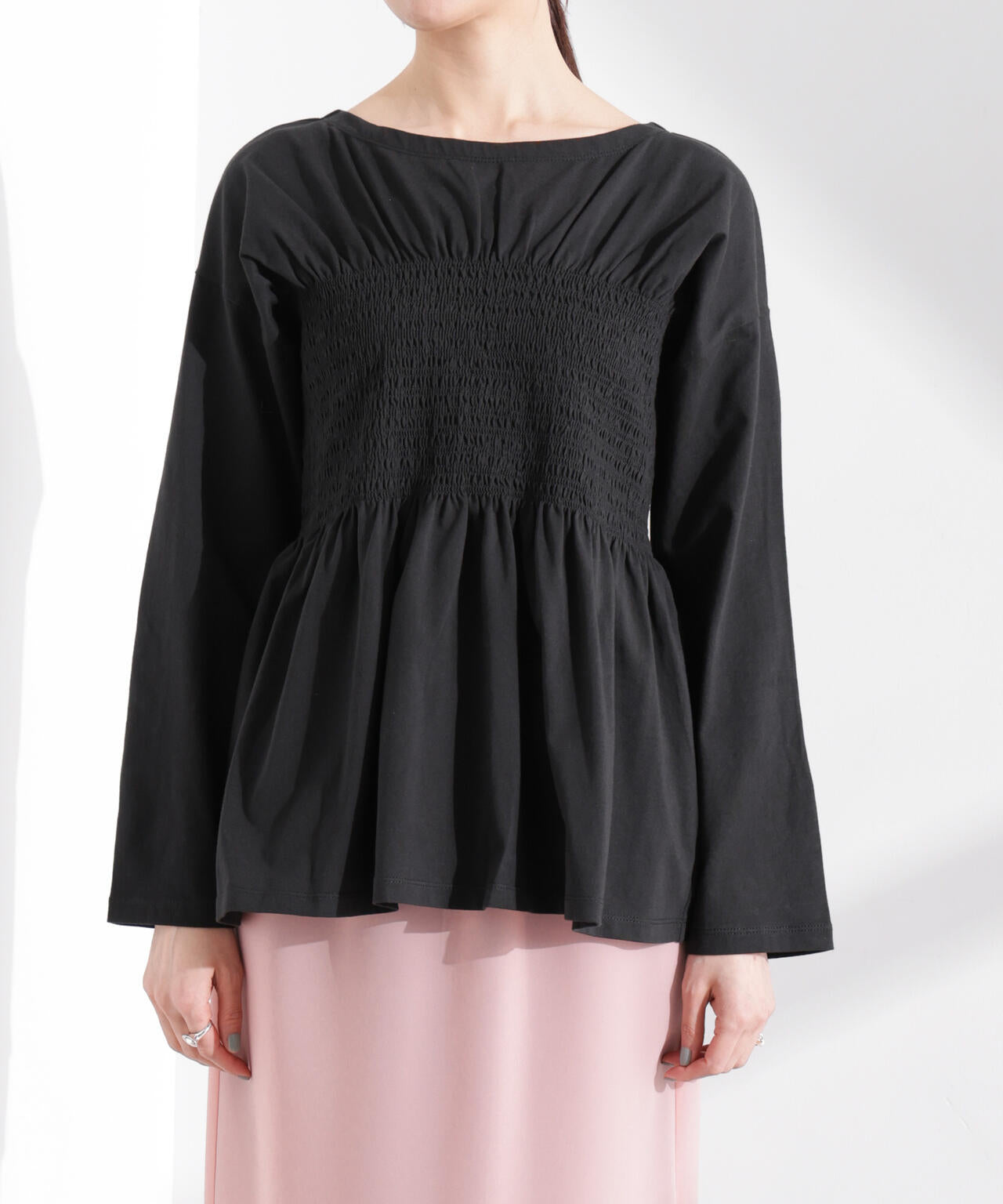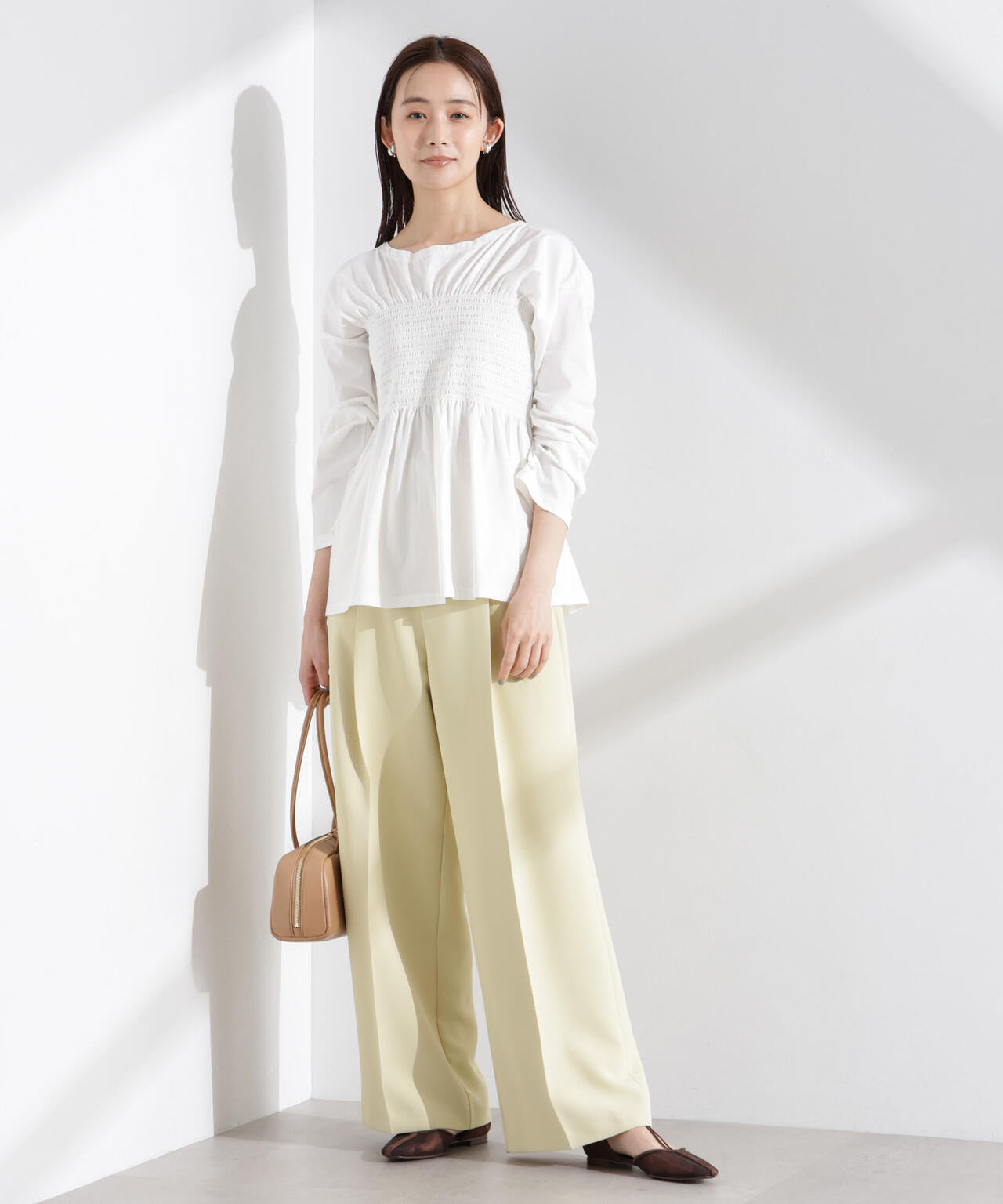 胸元にビスチェのようなシャーリング加工を施した、ブラウスライクなカットソー。女性らしくトレンドライクなルックスに仕上げてくれるので、シンプルなボトムと合わせるだけで様になります。