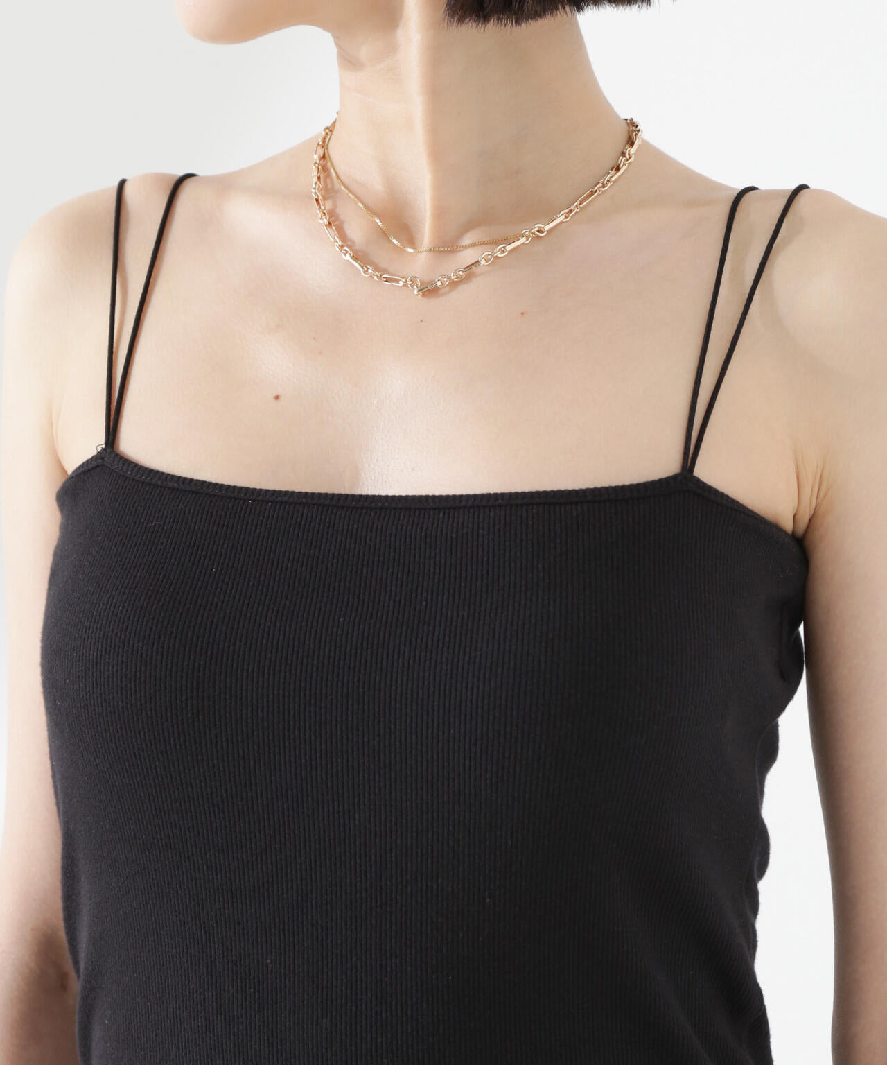レイヤードスタイルに欠かせない、カップ付きキャミソール。女性らしさが引き立つ細身のダブルストラップに、ベアトップのようなシルエットでトレンド感あるルックスに仕上げました。パッド部分はぐるりゴムを入れた安定感のある着心地で、デイリーの着回しに重宝します!