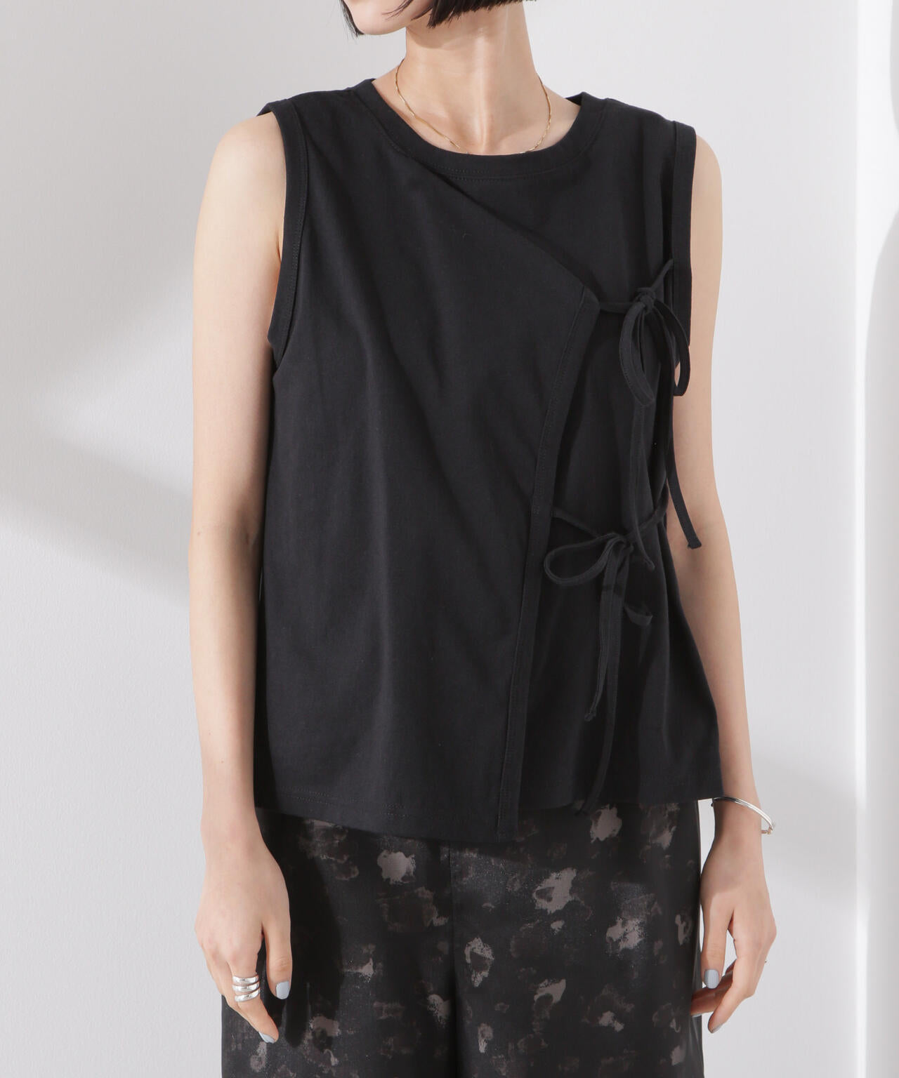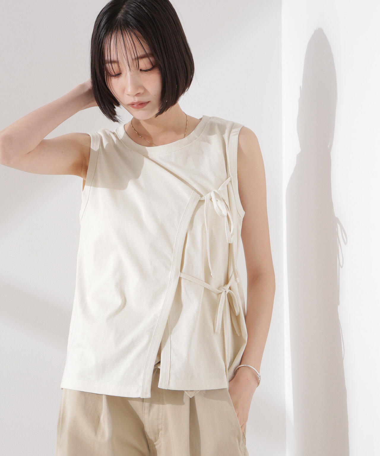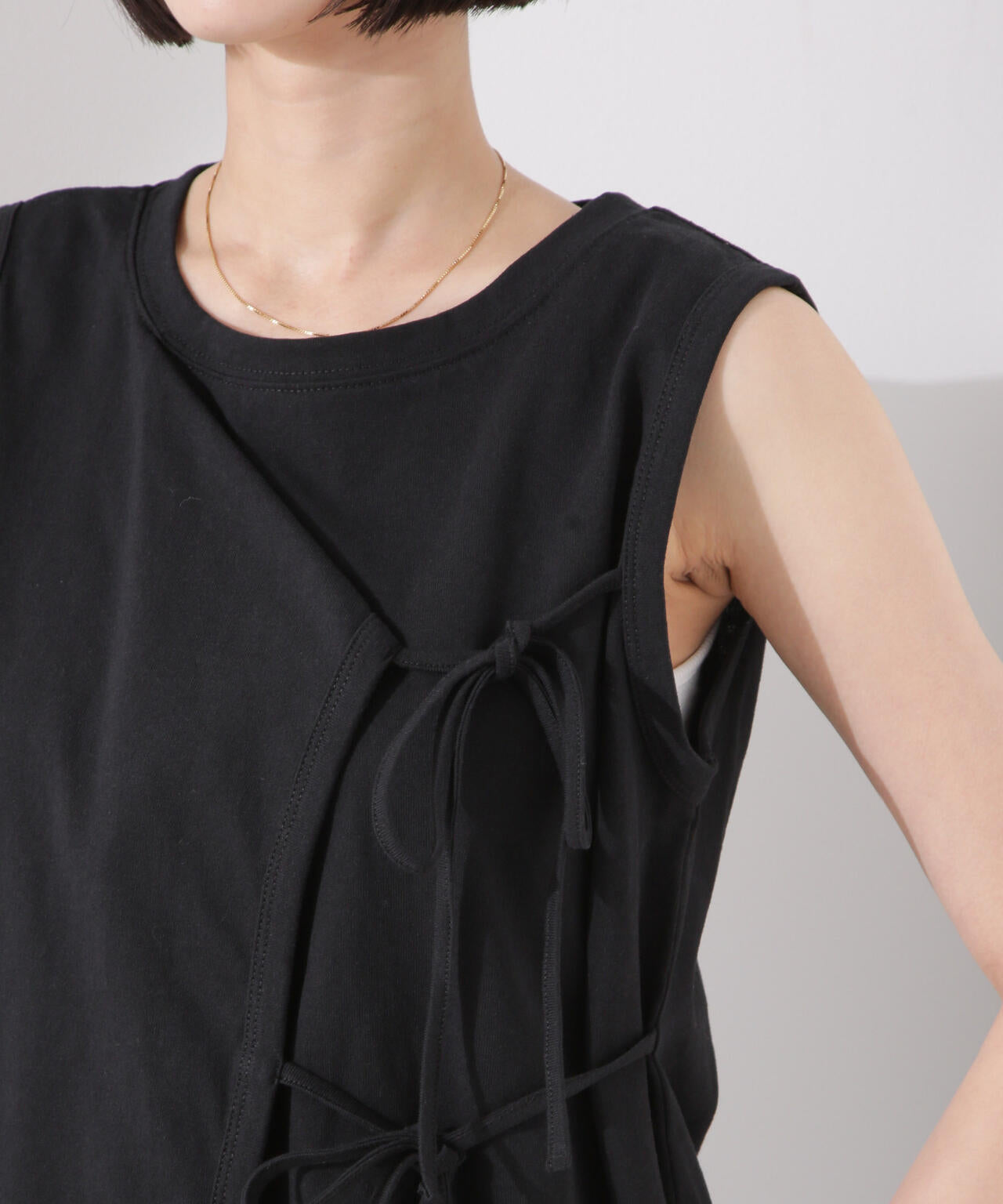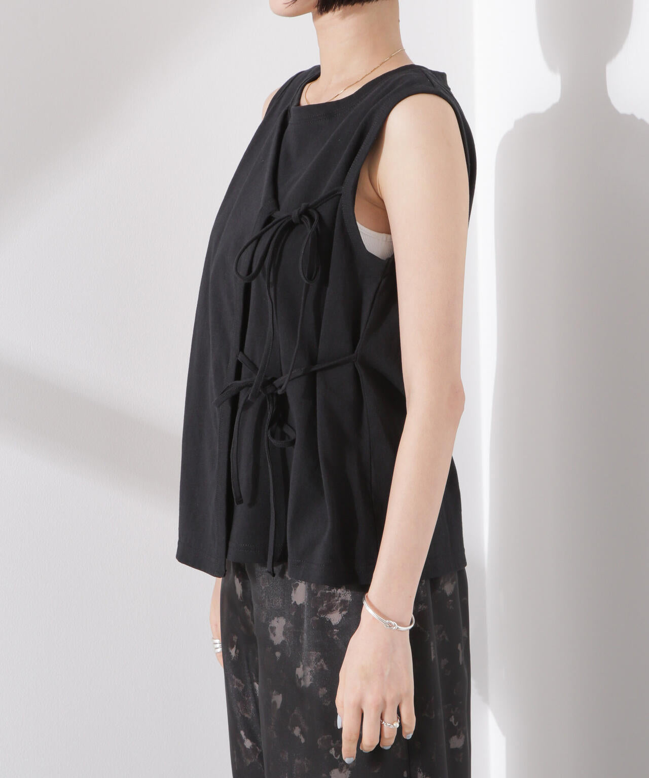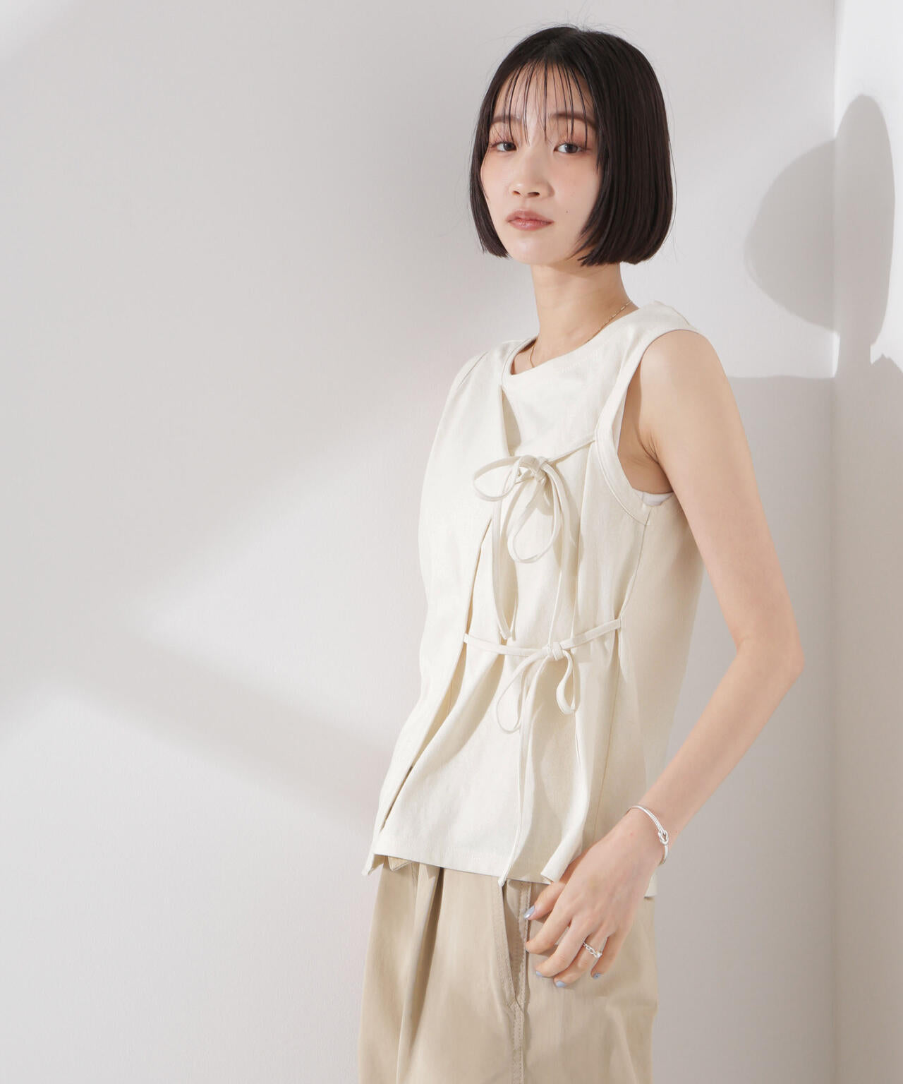 ・フロントに施されたリボンディテールが女性らしい印象のノースリーブトップス