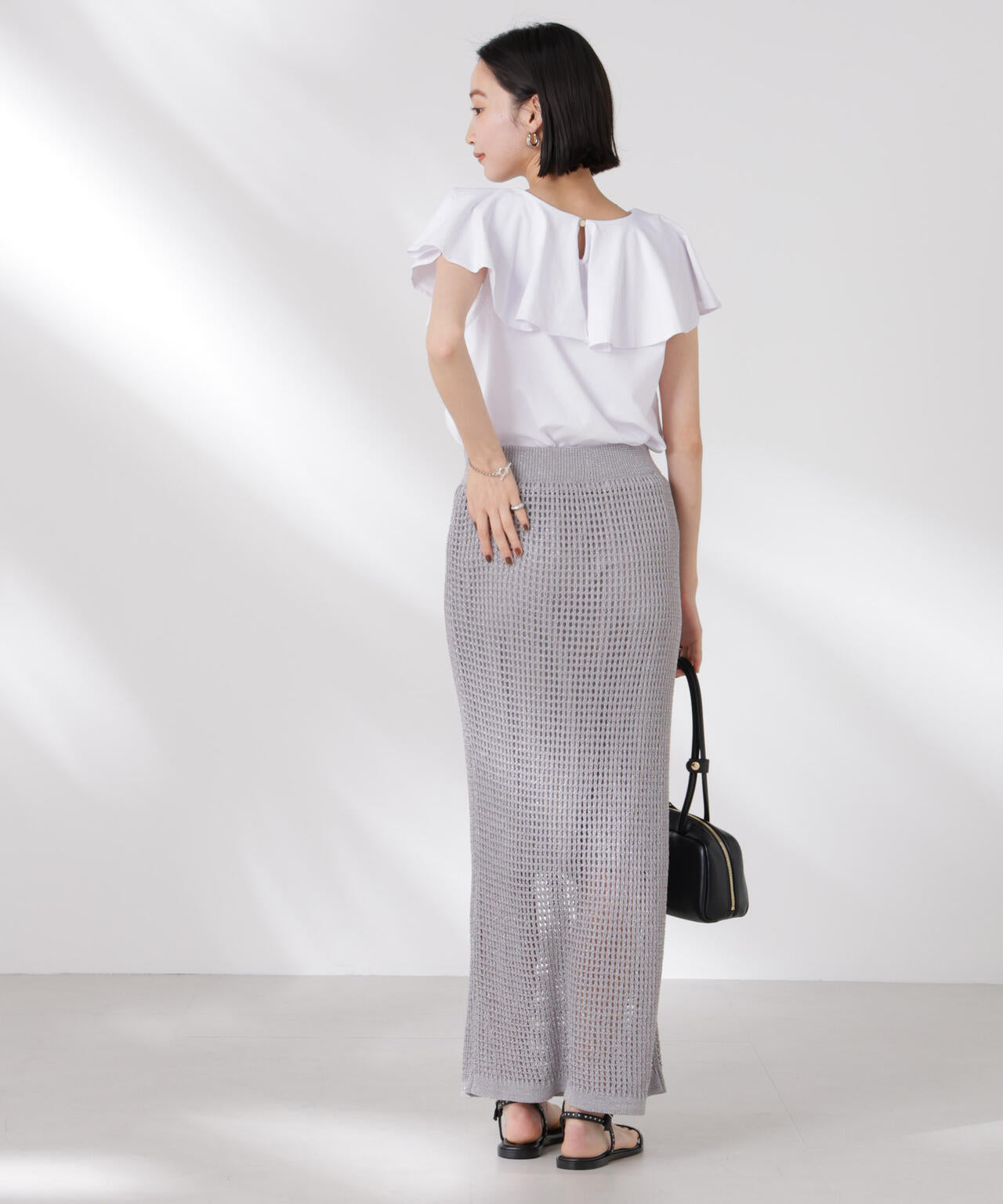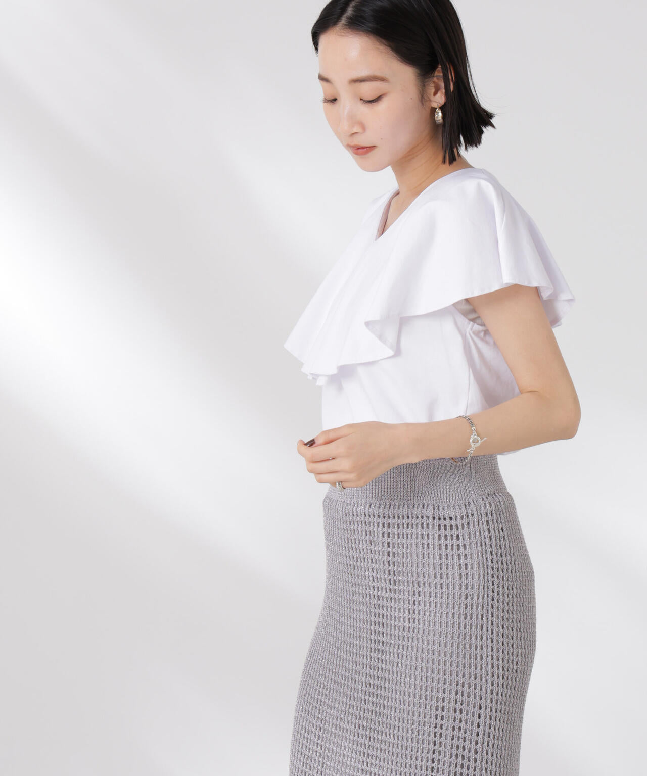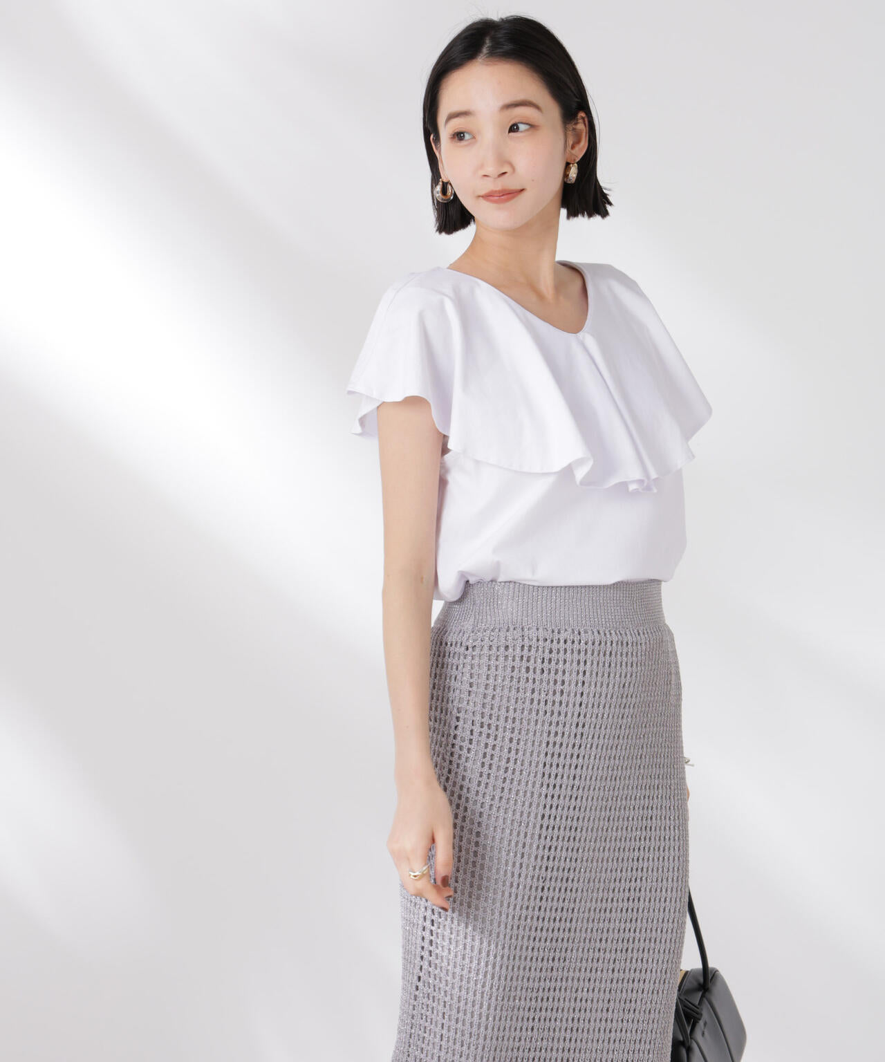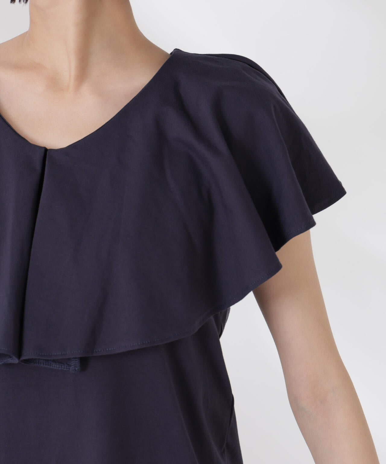・ノースリーブながら肩先を自然とカバーしてくれるラッフル衿