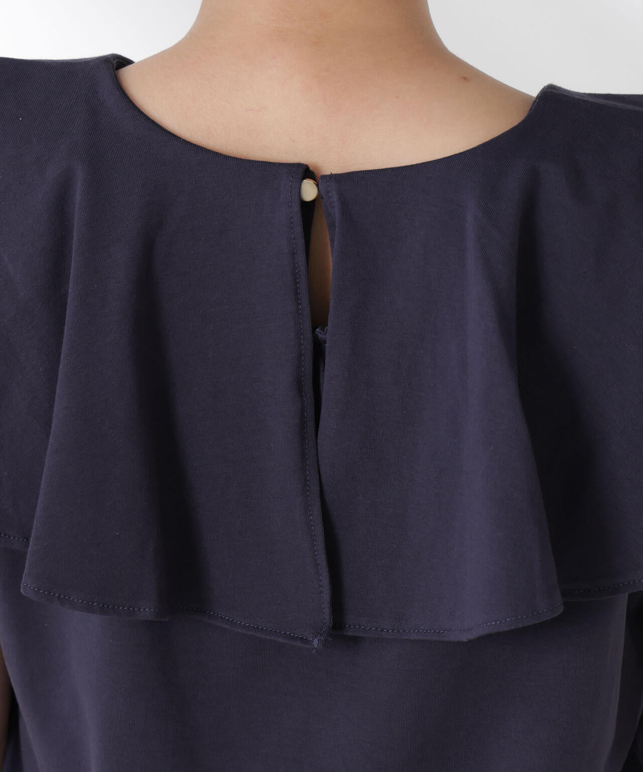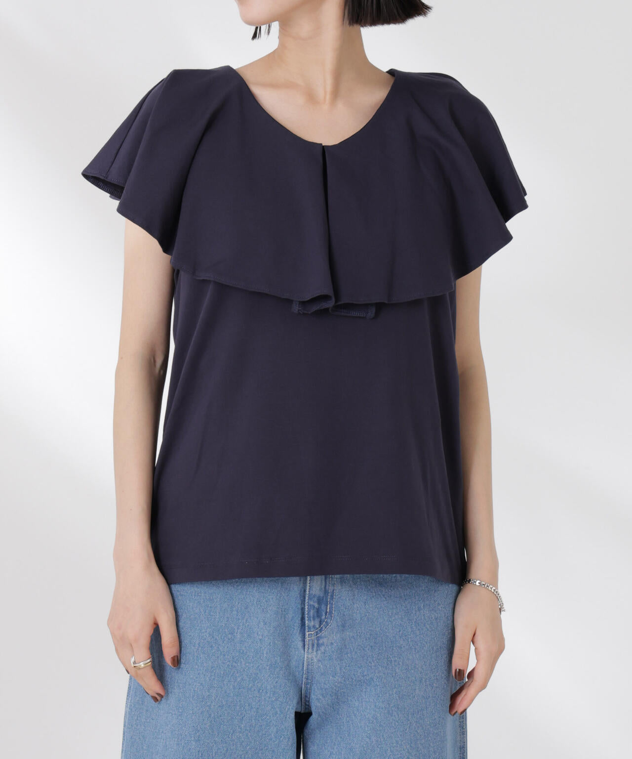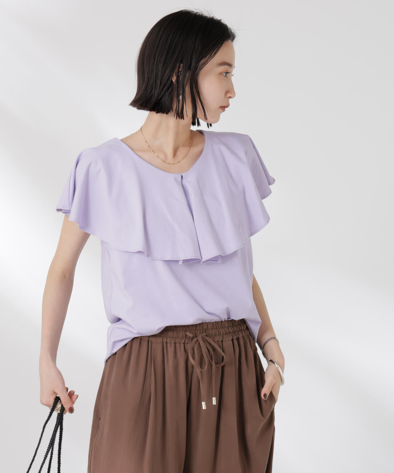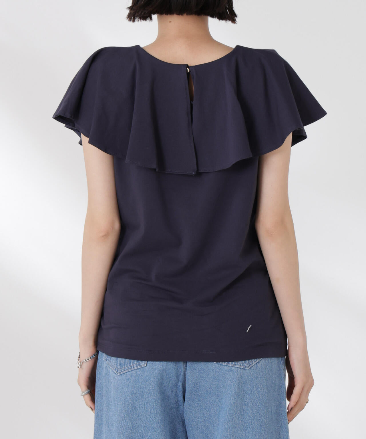 大ぶりのラッフルカラーが目をひくデザインカットソー。キレイめなデザインでデニムパンツからスラックス、Iラインスカート等幅広いボトムスと好相性でブラウスライクなアイテムです。