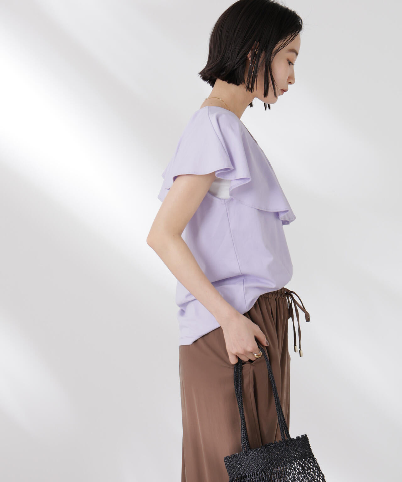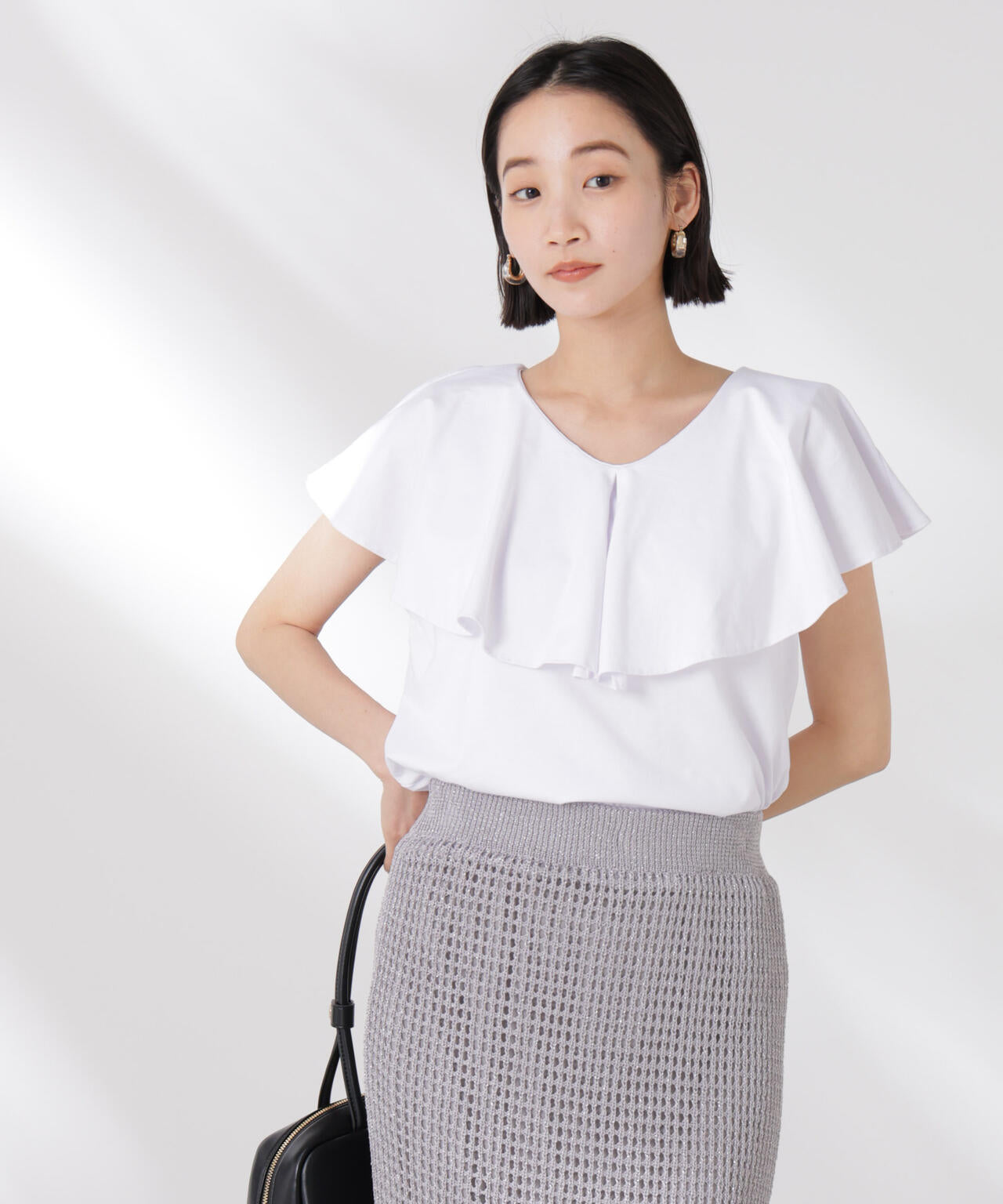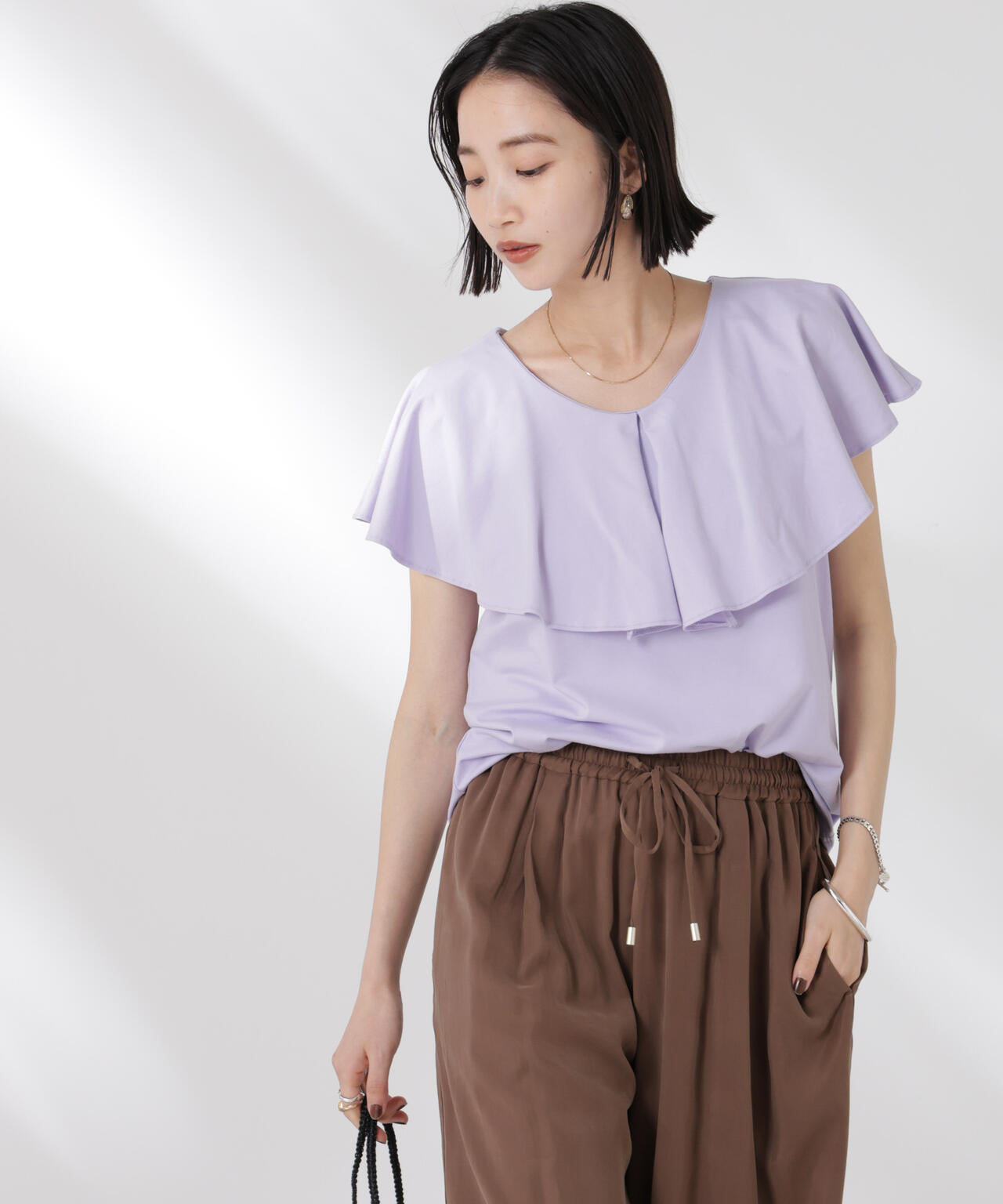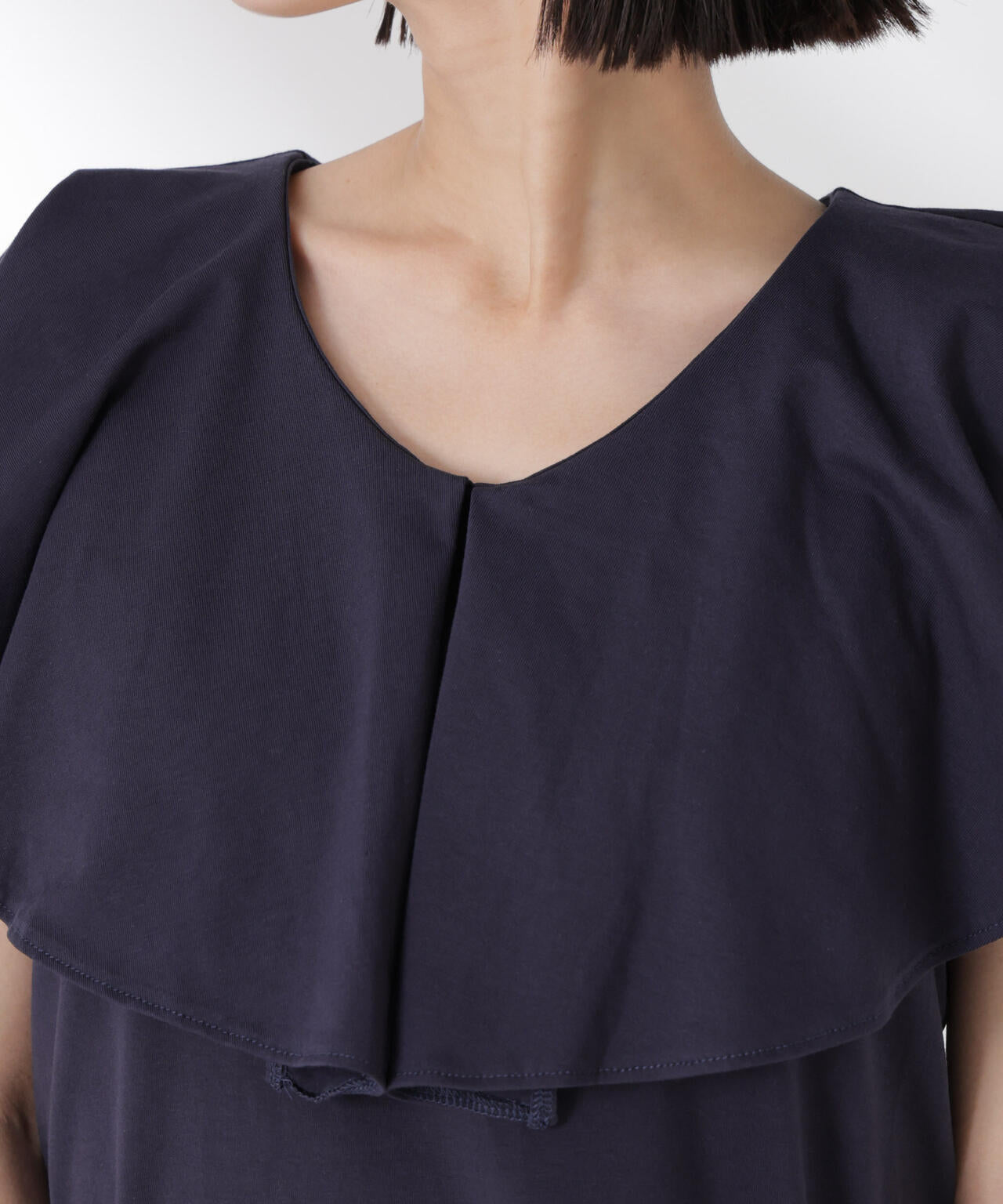 大ぶりのラッフルカラーが目をひくデザインカットソー。キレイめなデザインでデニムパンツからスラックス、Iラインスカート等幅広いボトムスと好相性でブラウスライクなアイテムです。