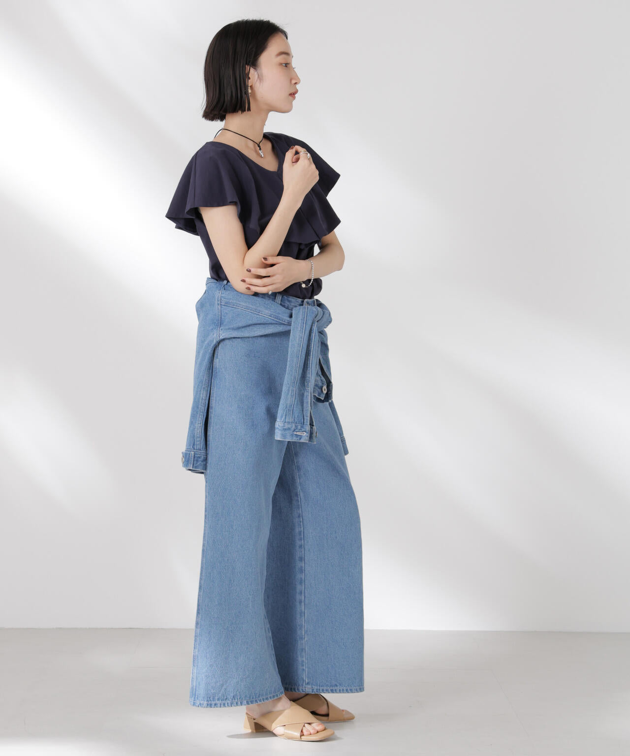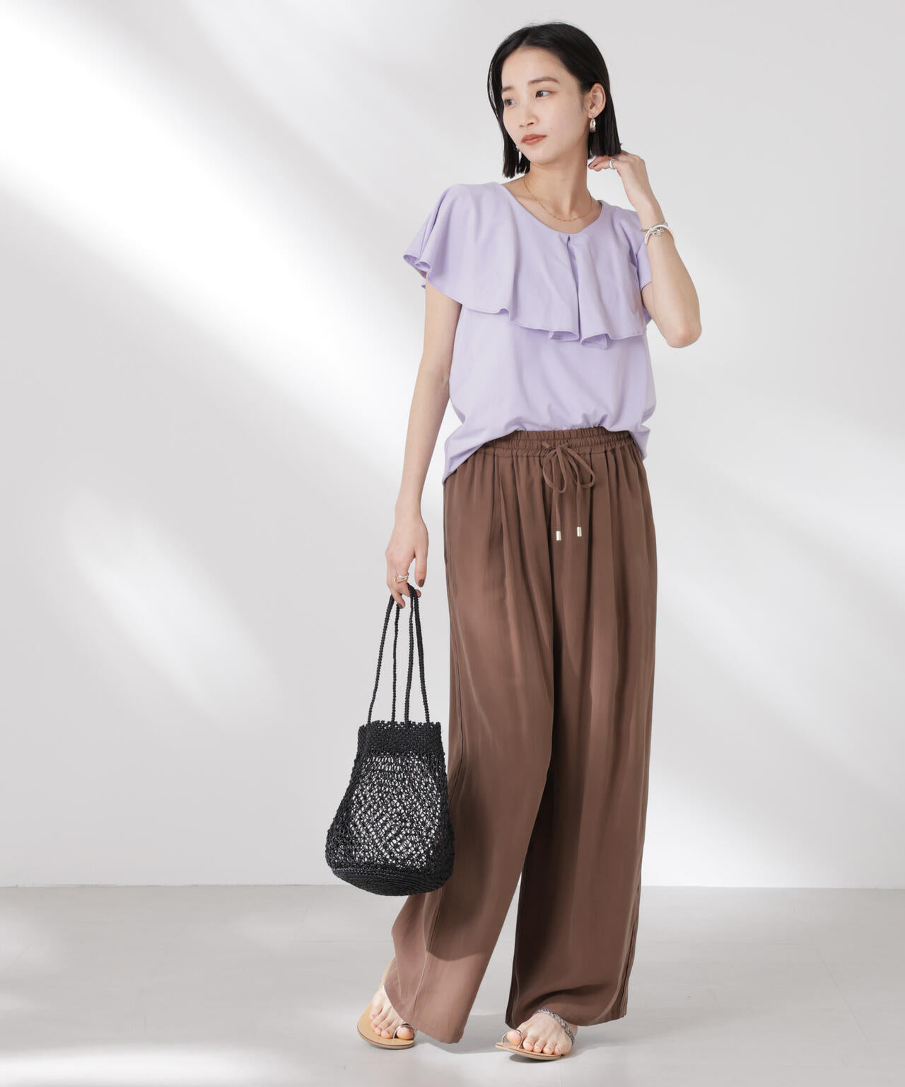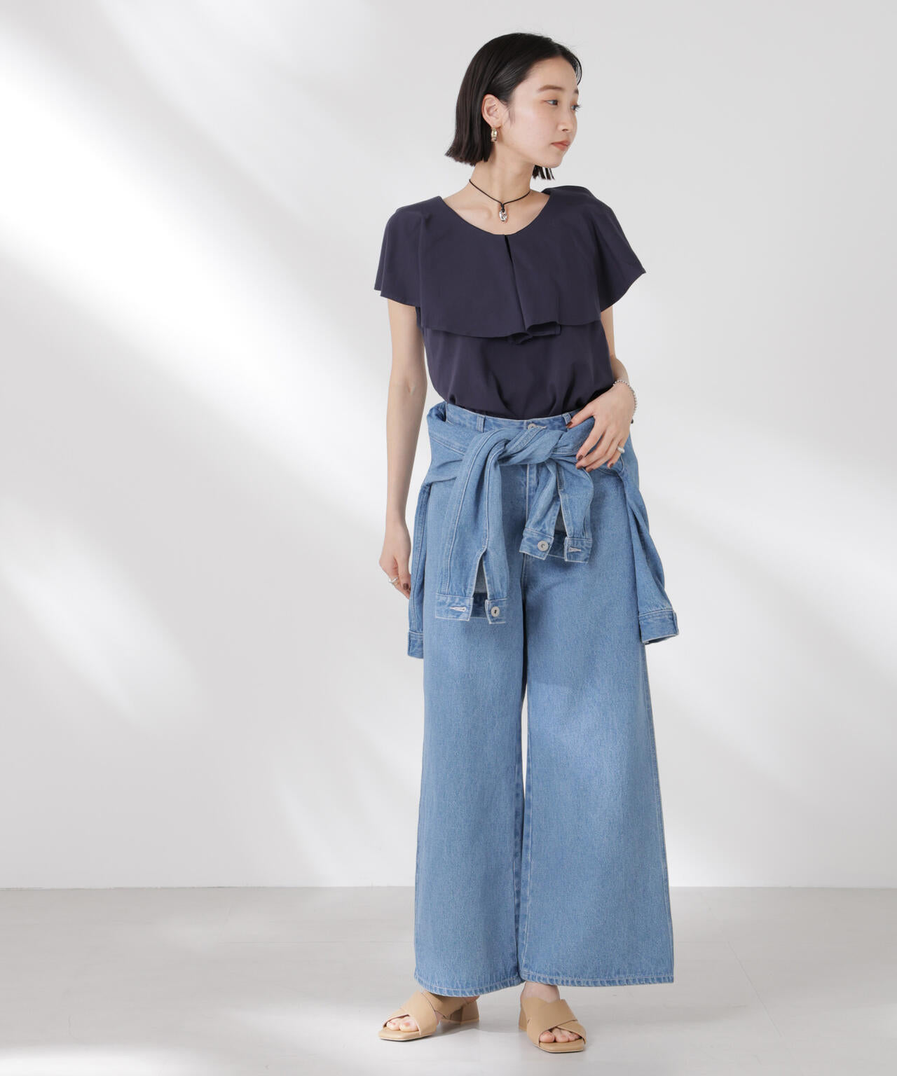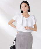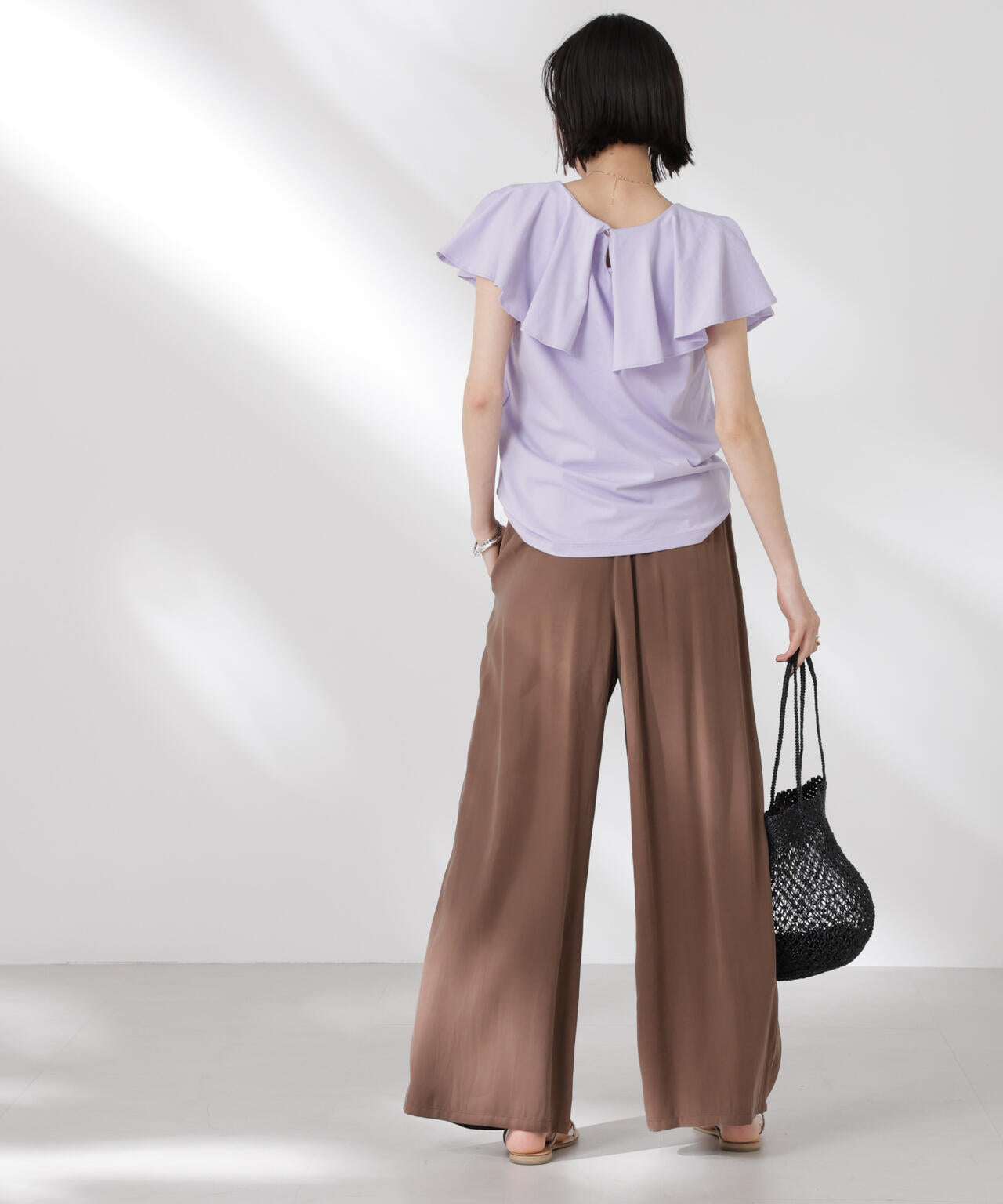 大ぶりのラッフルカラーが目をひくデザインカットソー。キレイめなデザインでデニムパンツからスラックス、Iラインスカート等幅広いボトムスと好相性でブラウスライクなアイテムです。