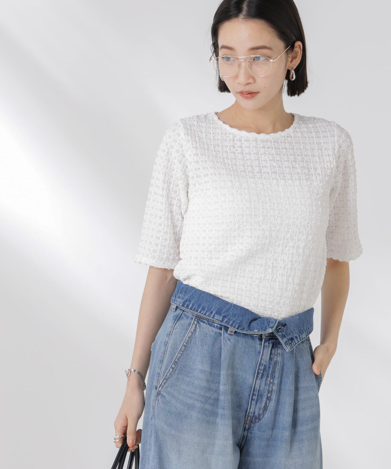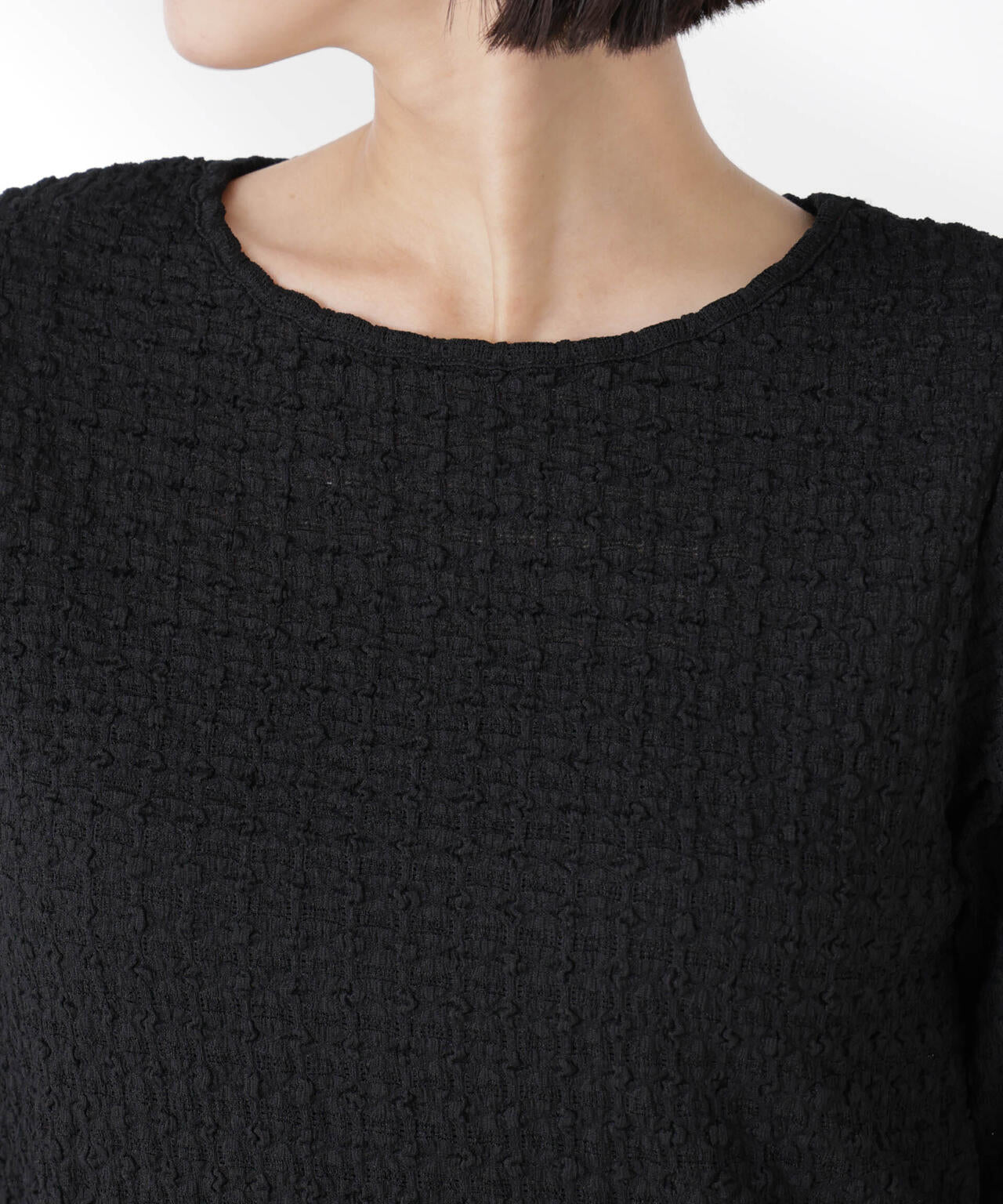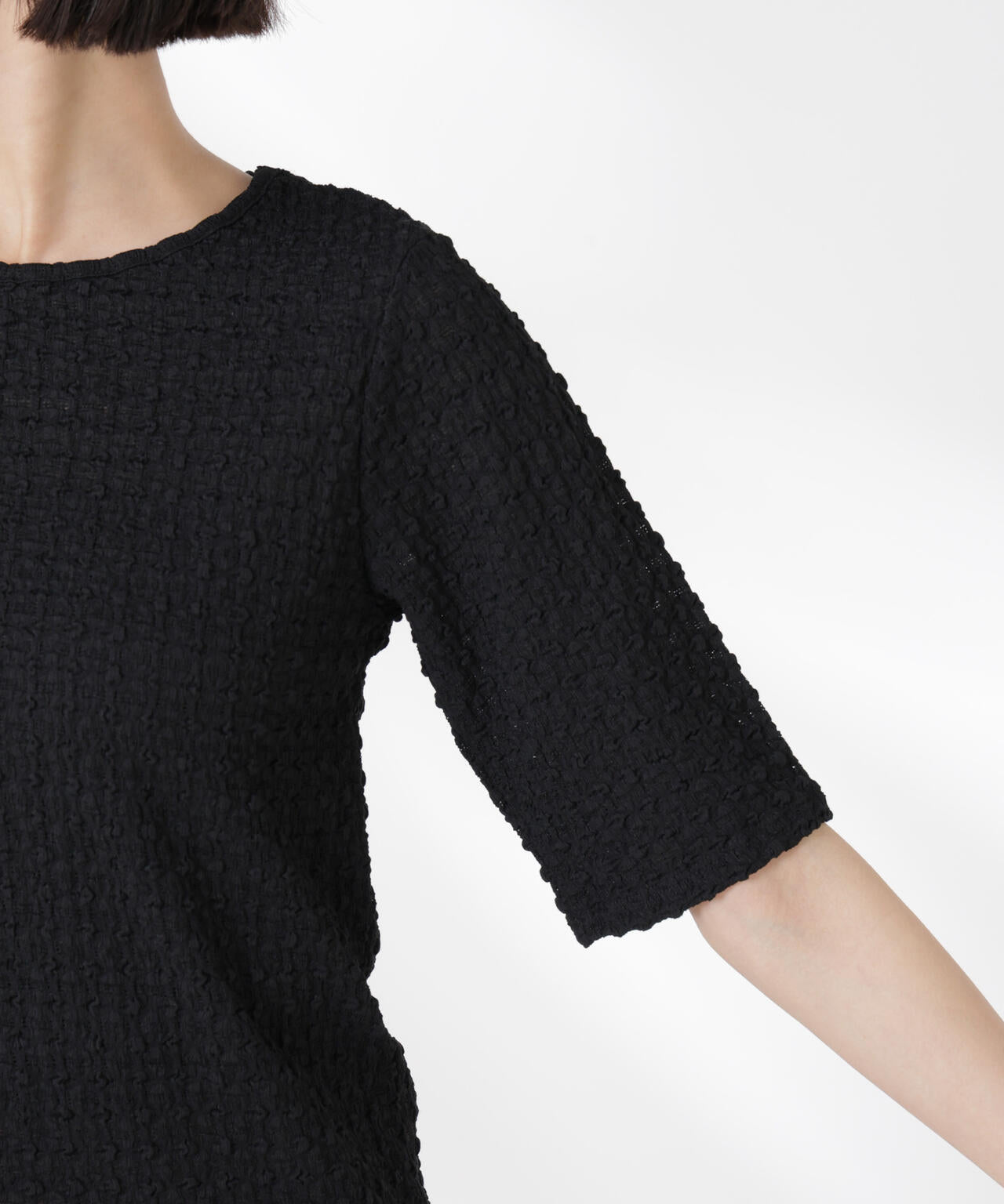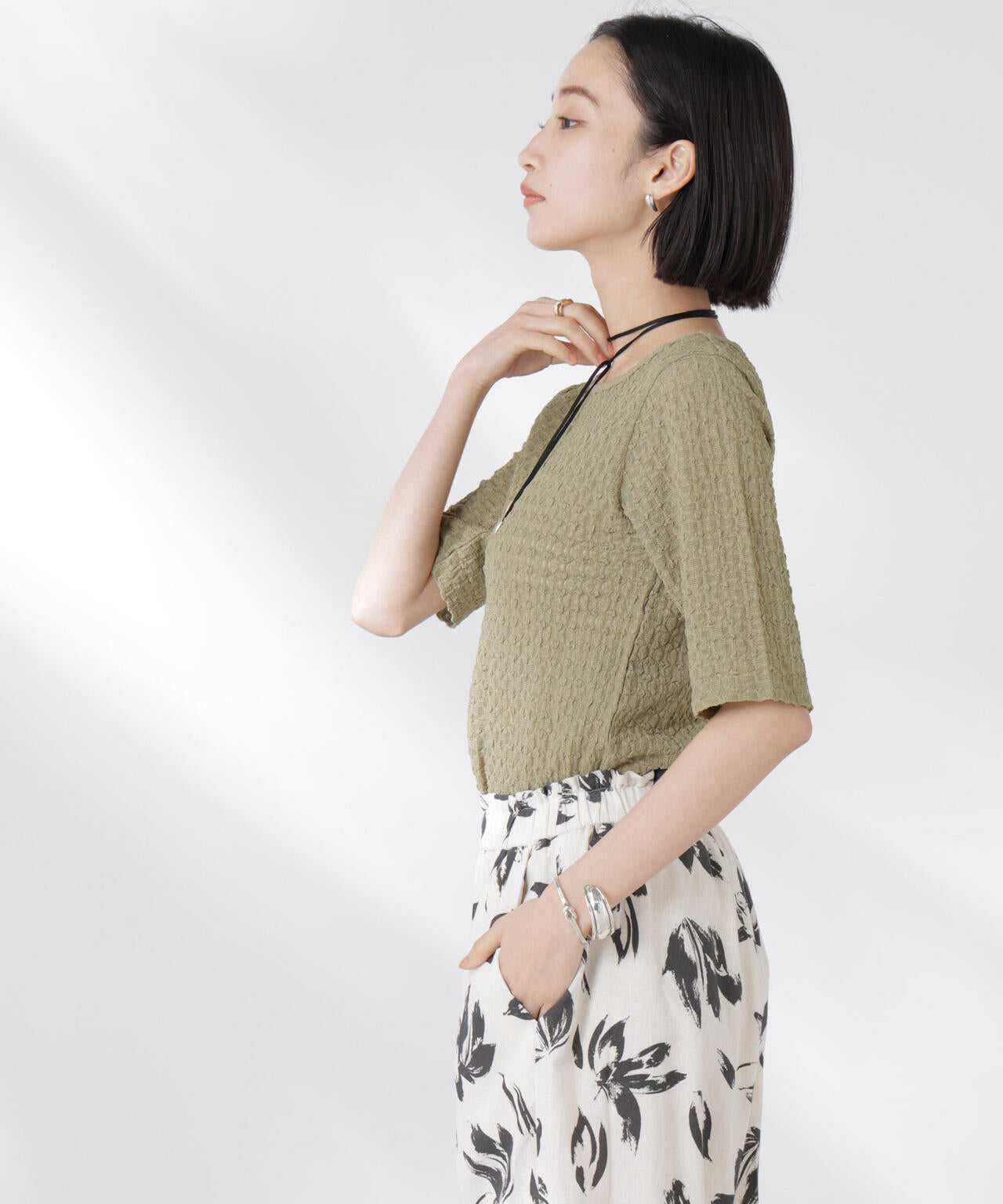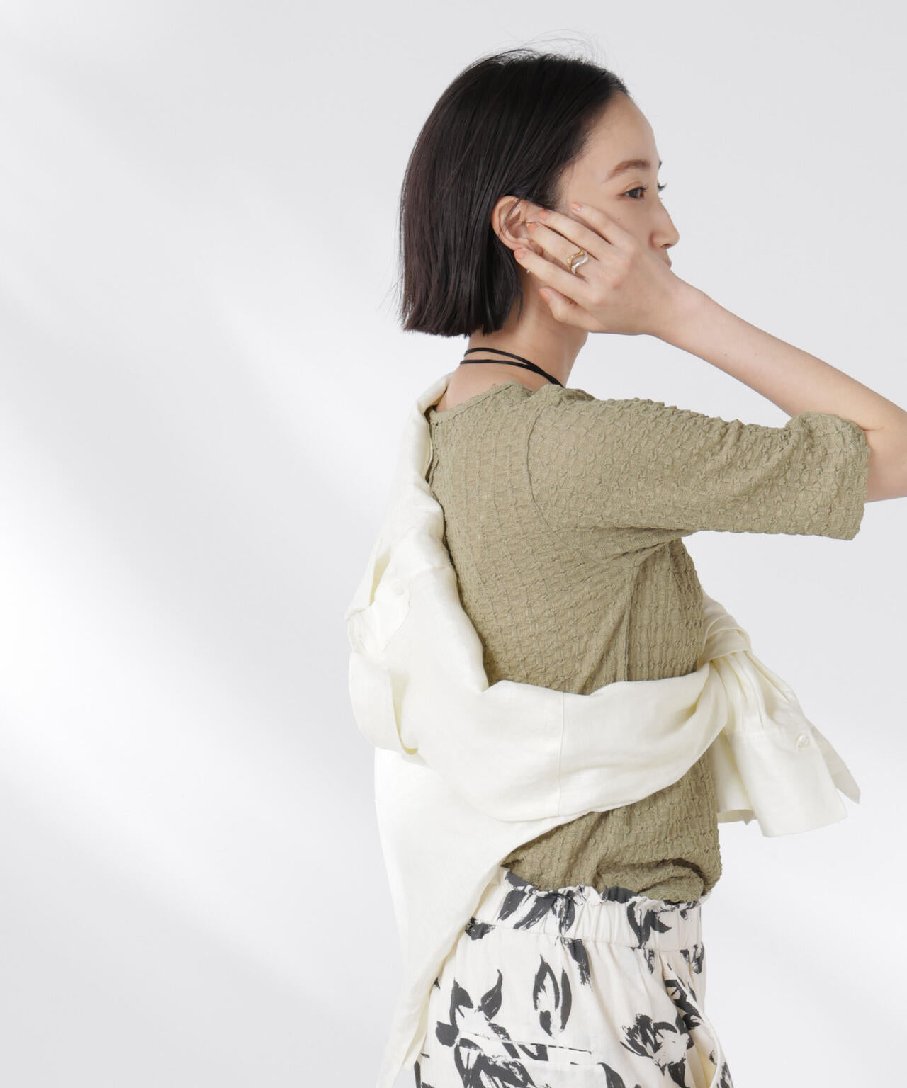 ポコポコした立体感のあるカットソー素材で仕立てたシンプルなクルーネックTシャツ。タイト過ぎずワイド過ぎずの程良いサイズ感で、一枚でもインナーとしても活躍してくれます。