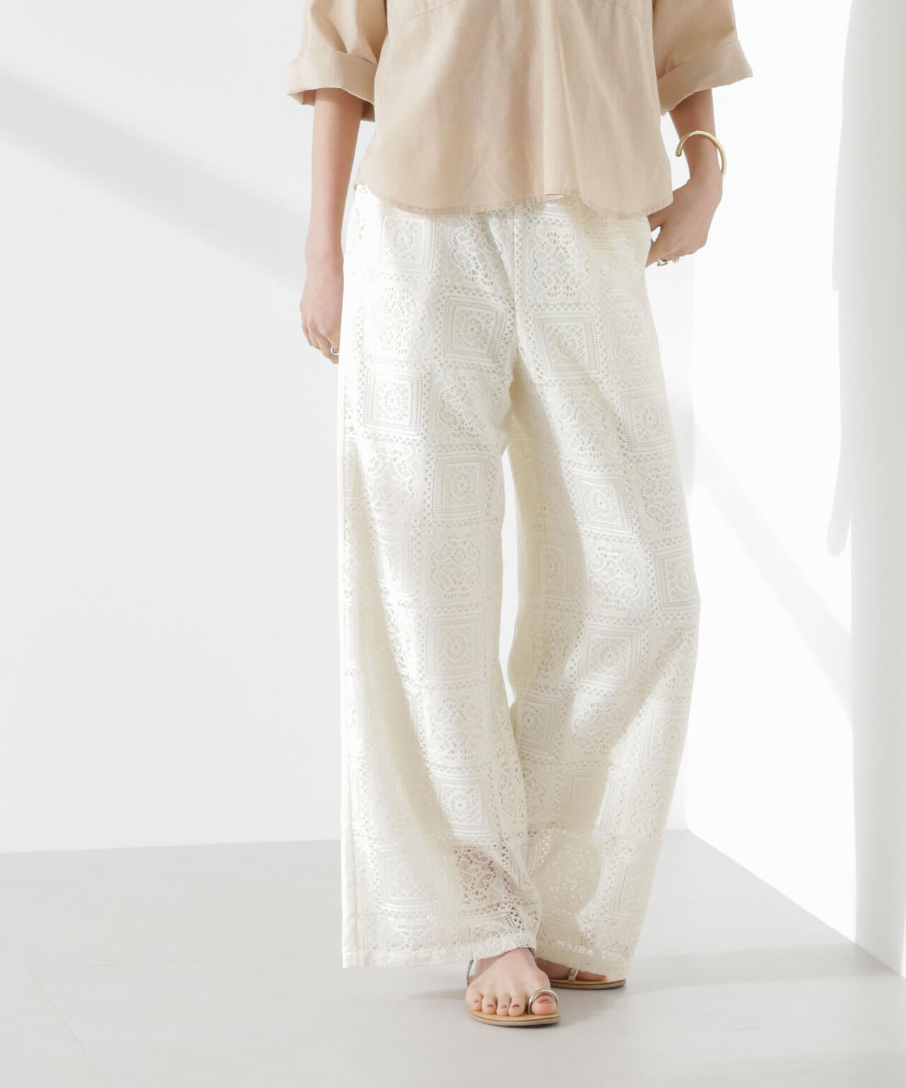 ・甘すぎない繊細な雰囲気のレースで仕立てたロングパンツ
