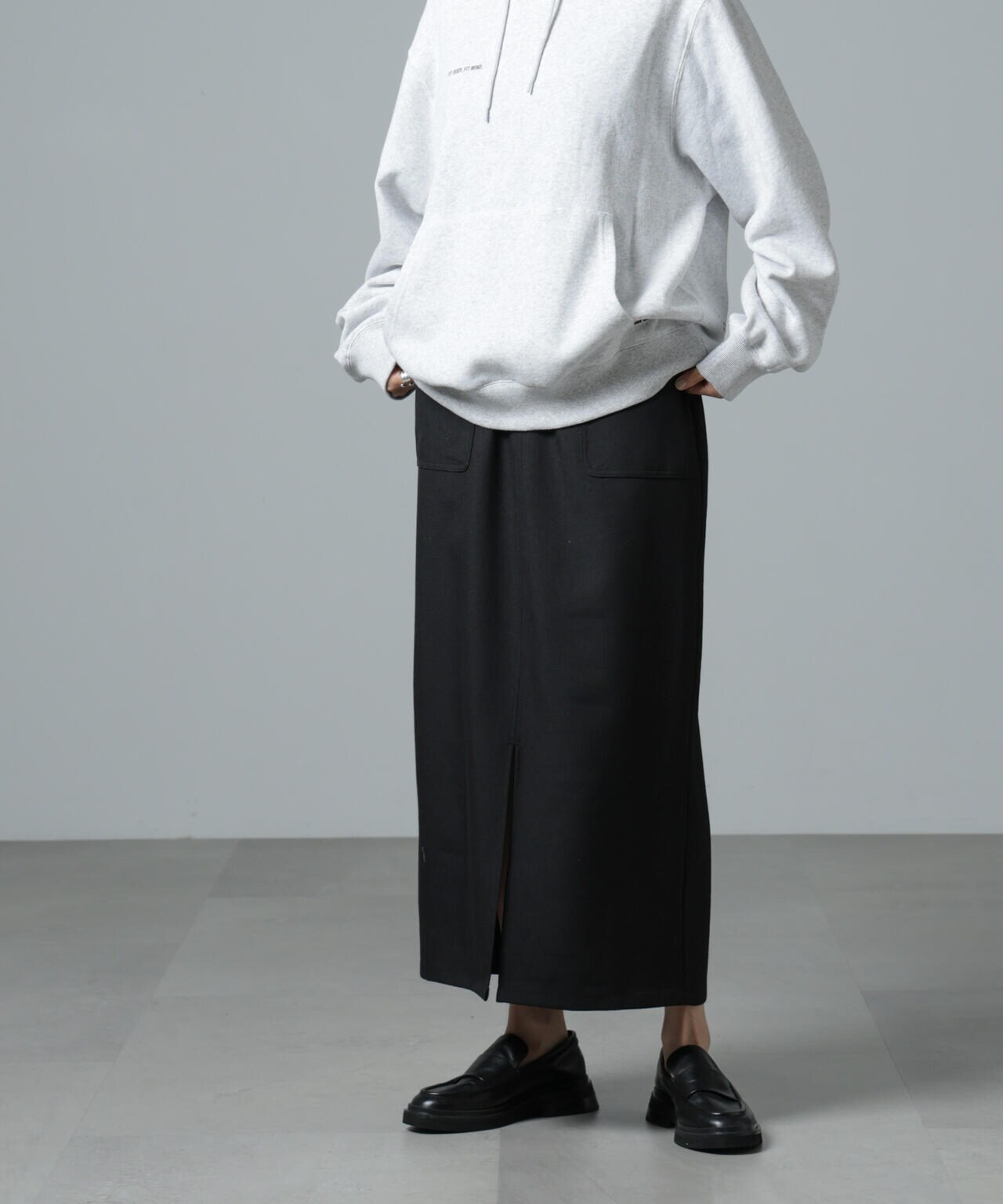 カジュアルからキレイ目まで、着回し力が万能なスカート。シーズンレスで着用できる素材感で、オンオフ問わず合わせやすいデザイン。程よい伸縮性のある素材が特徴で、フロントに入ったスリットが足さばきもしやすくオススメな一枚です。