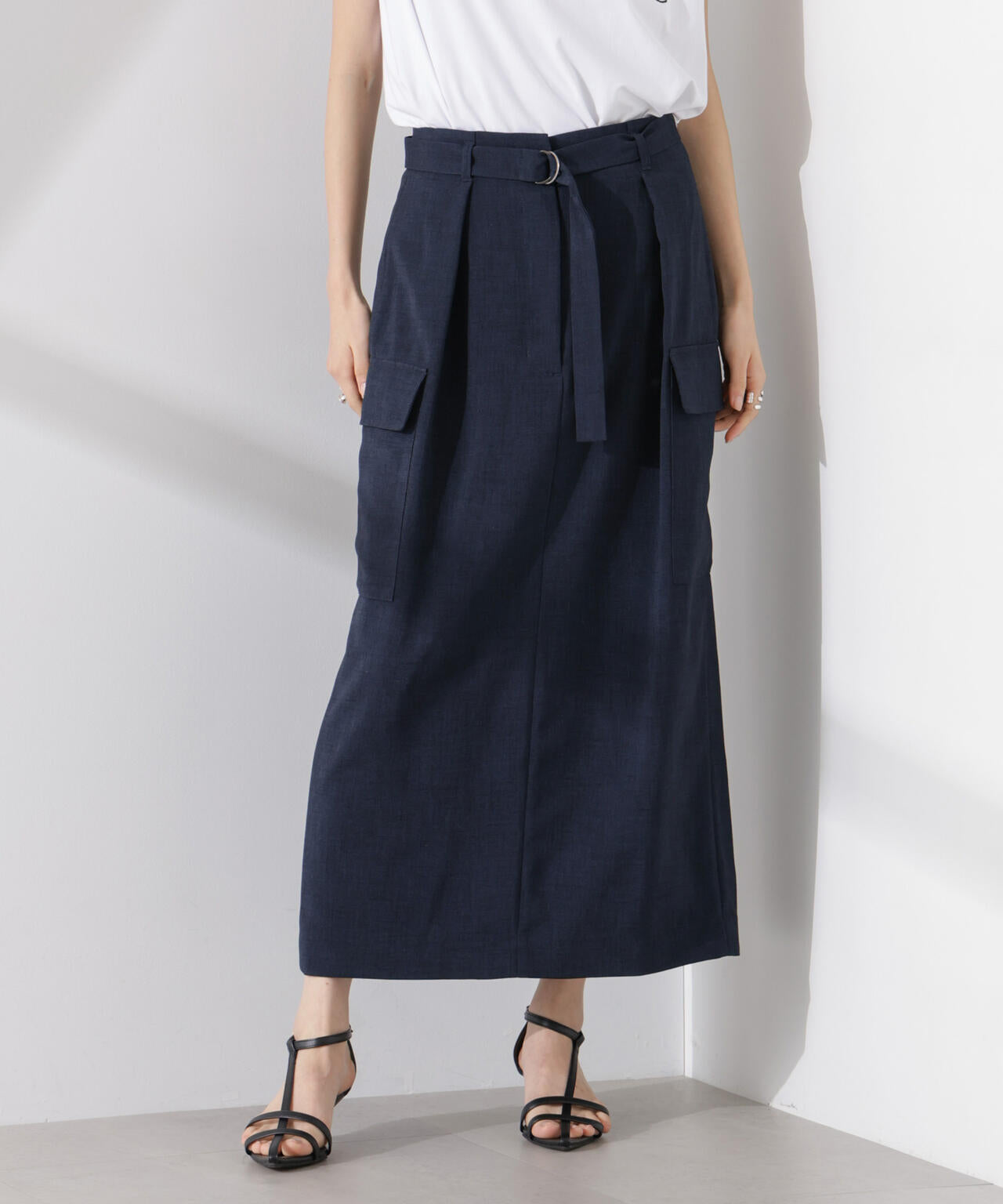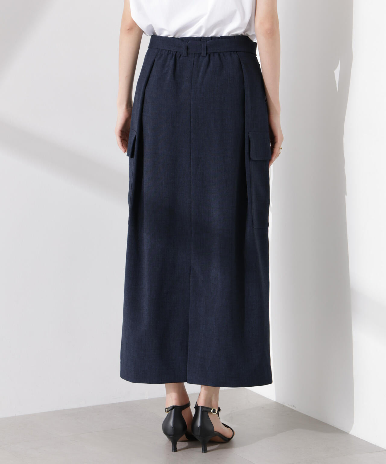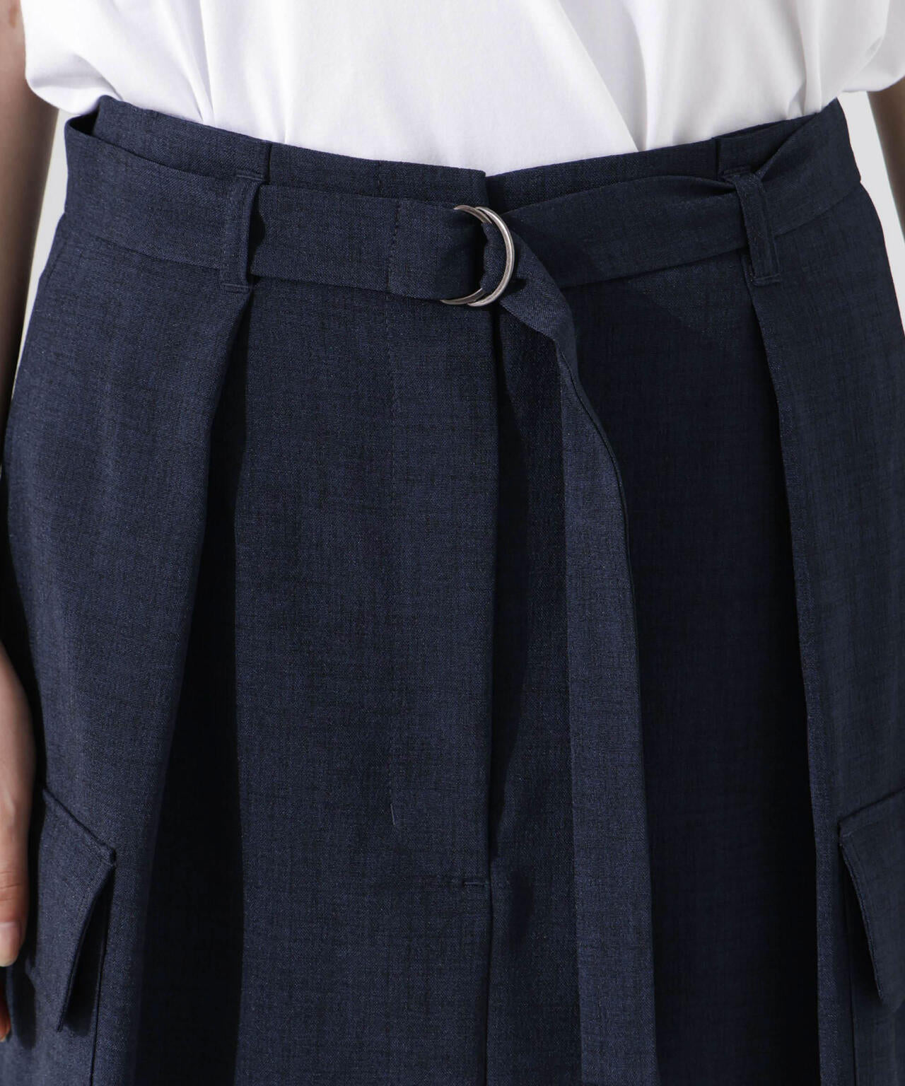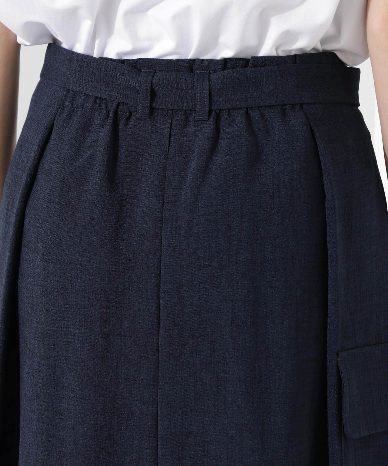 リネン見えする涼やかな素材で仕立てた、ミリタリーテイストのスカート。防シワ、UVカット、接触冷感、吸水速乾の多機能性を備えた快適な着心地で、ON/OFFで重宝しそう。