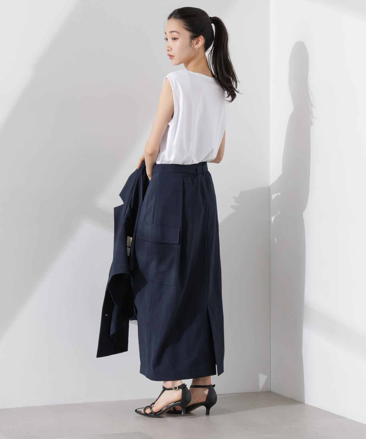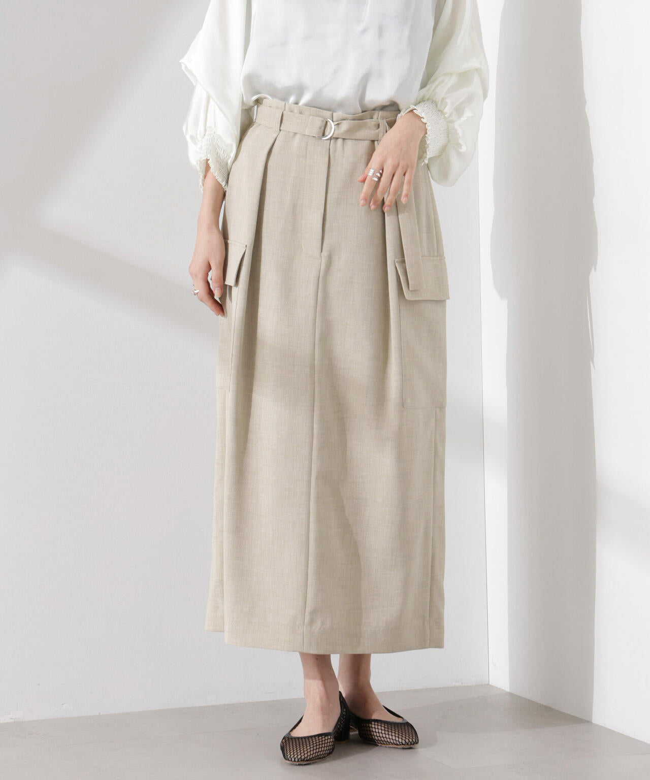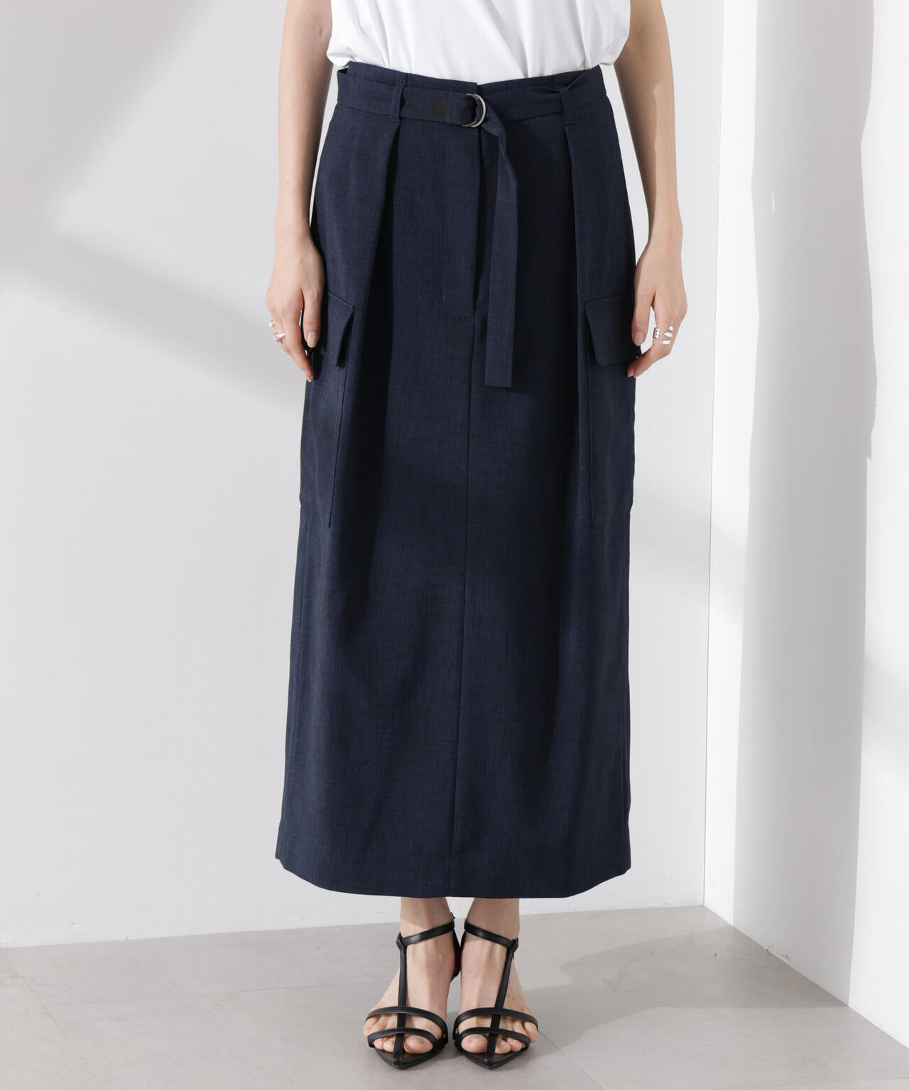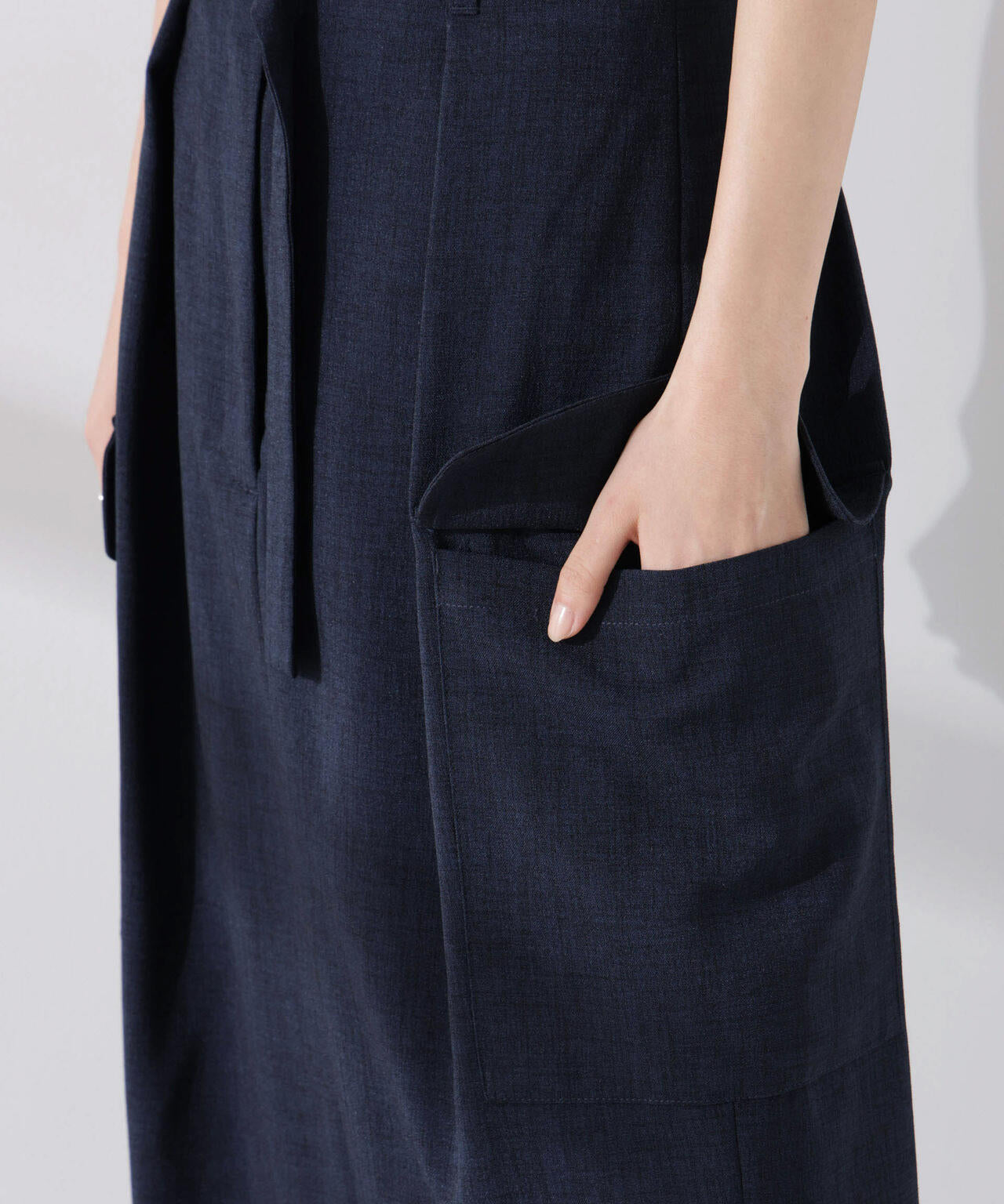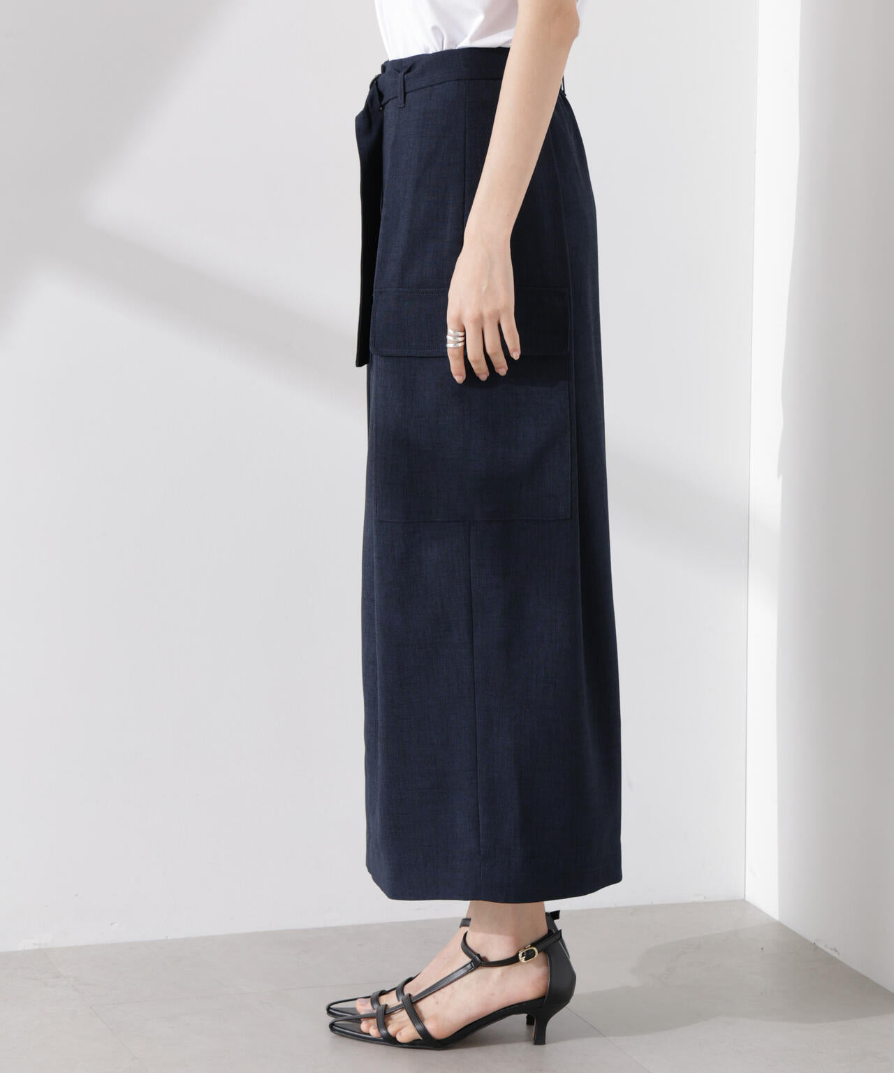 リネン見えする涼やかな素材で仕立てた、ミリタリーテイストのスカート。防シワ、UVカット、接触冷感、吸水速乾の多機能性を備えた快適な着心地で、ON/OFFで重宝しそう。