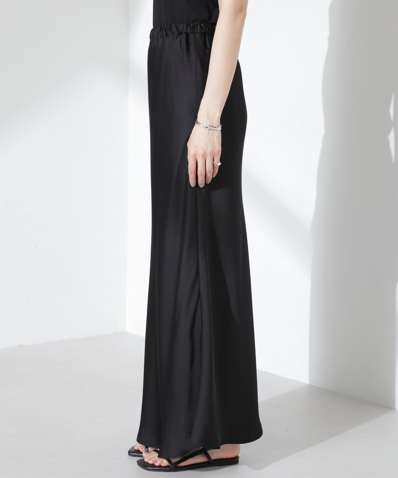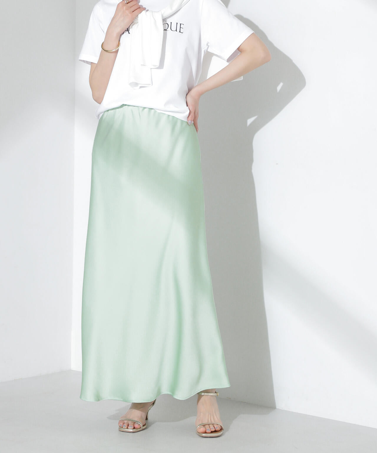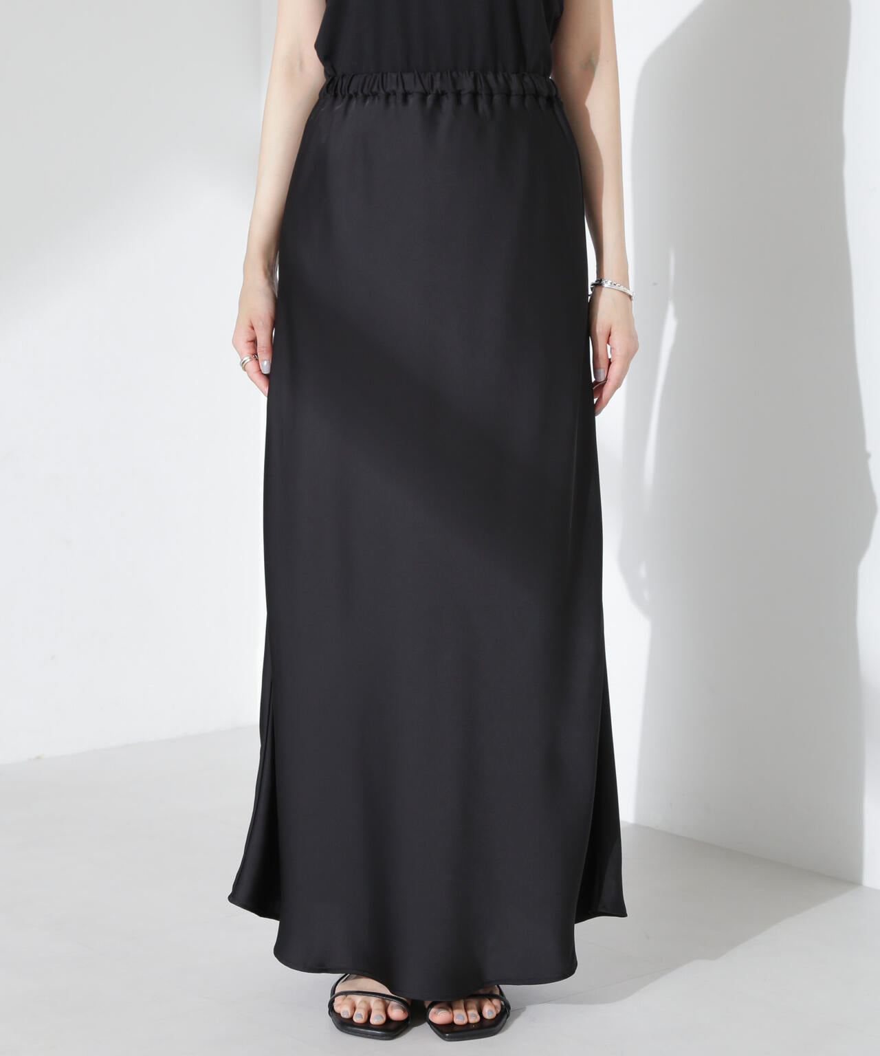裾に向かって入ったフレア感が上品なサテンマキシスカート。品のあるしなやかさがありつつ、ウエストゴムのイージー仕様も嬉しい!程よい光沢感が女性らしくオケージョンやセレモニーシーンにも活躍する一枚です。