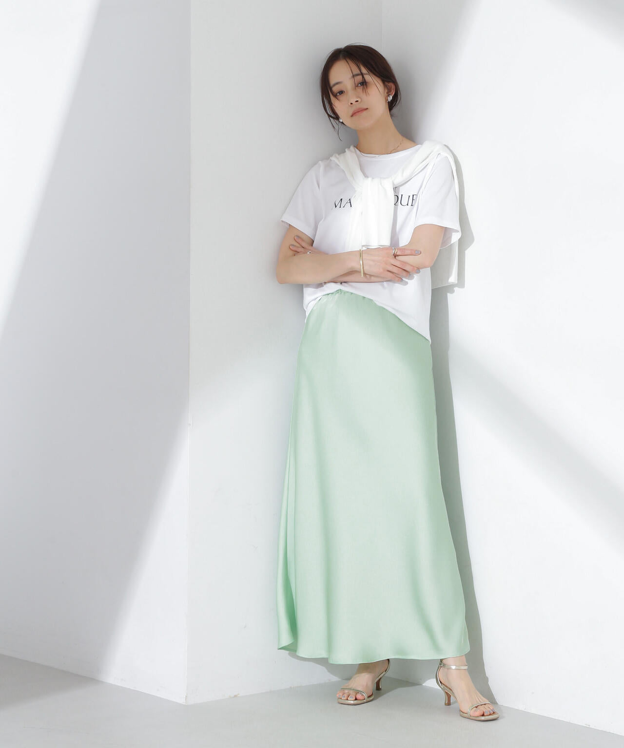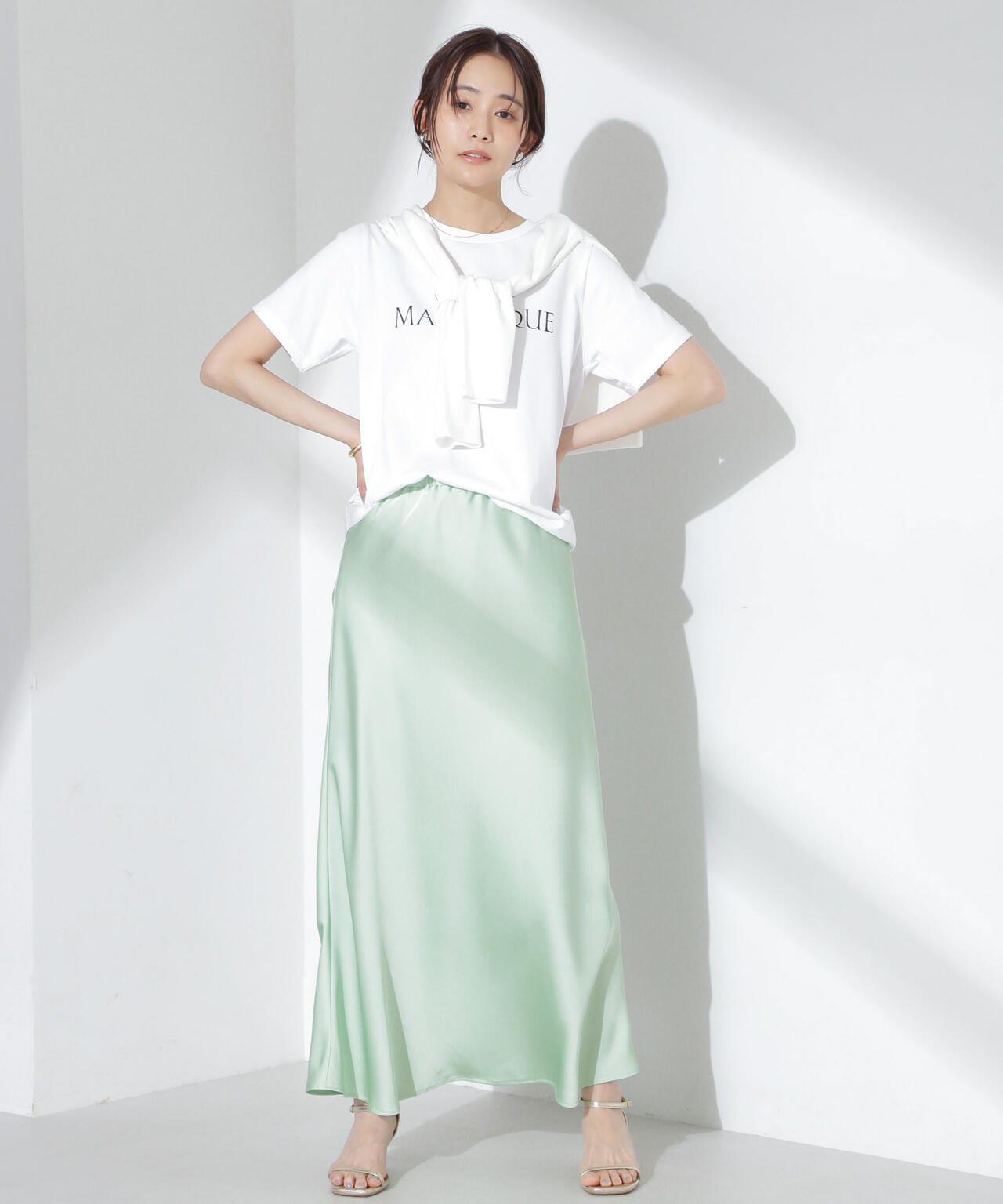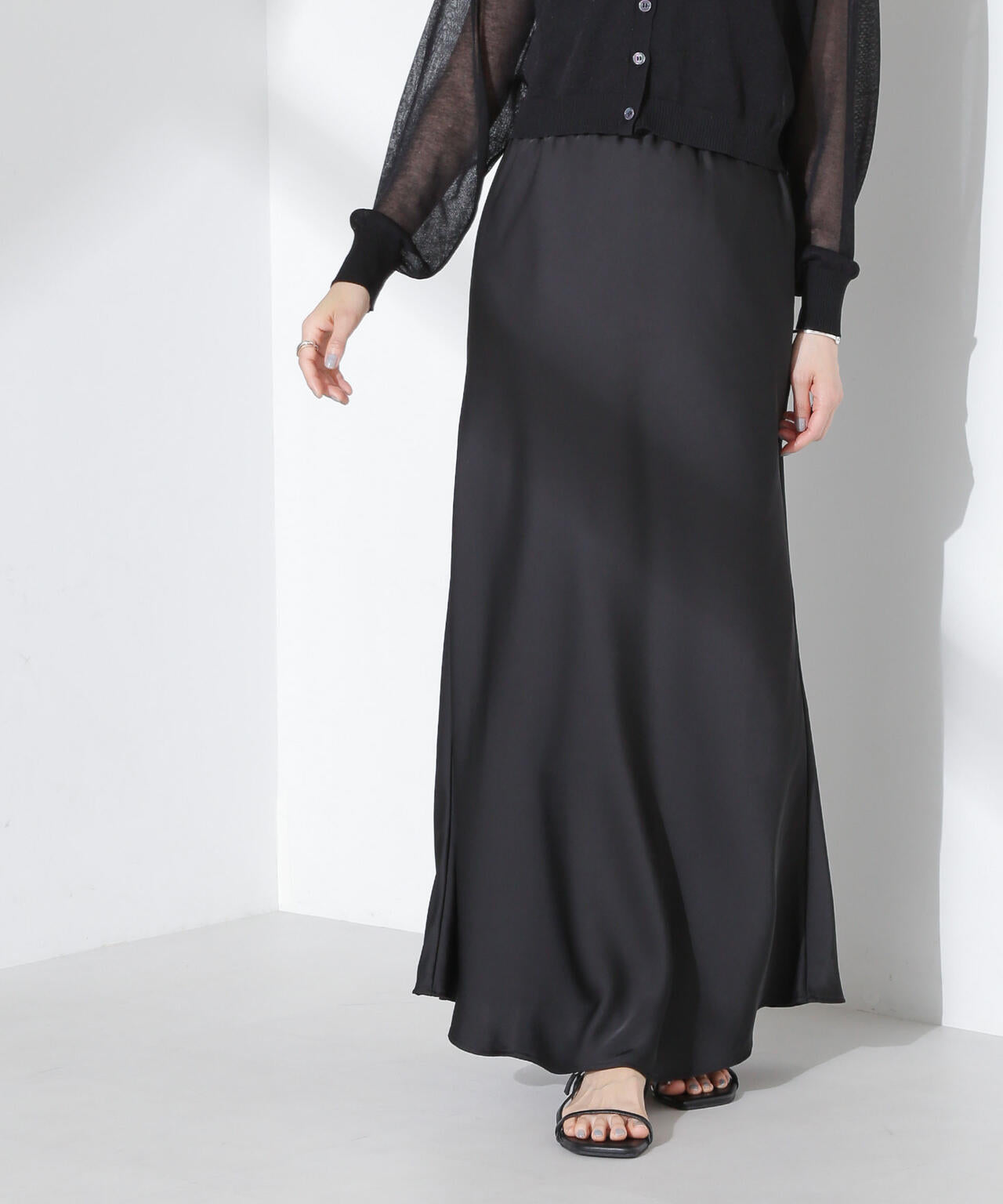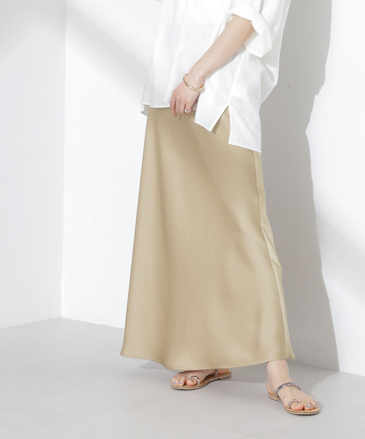 裾に向かって入ったフレア感が上品なサテンマキシスカート。品のあるしなやかさがありつつ、ウエストゴムのイージー仕様も嬉しい!程よい光沢感が女性らしくオケージョンやセレモニーシーンにも活躍する一枚です。