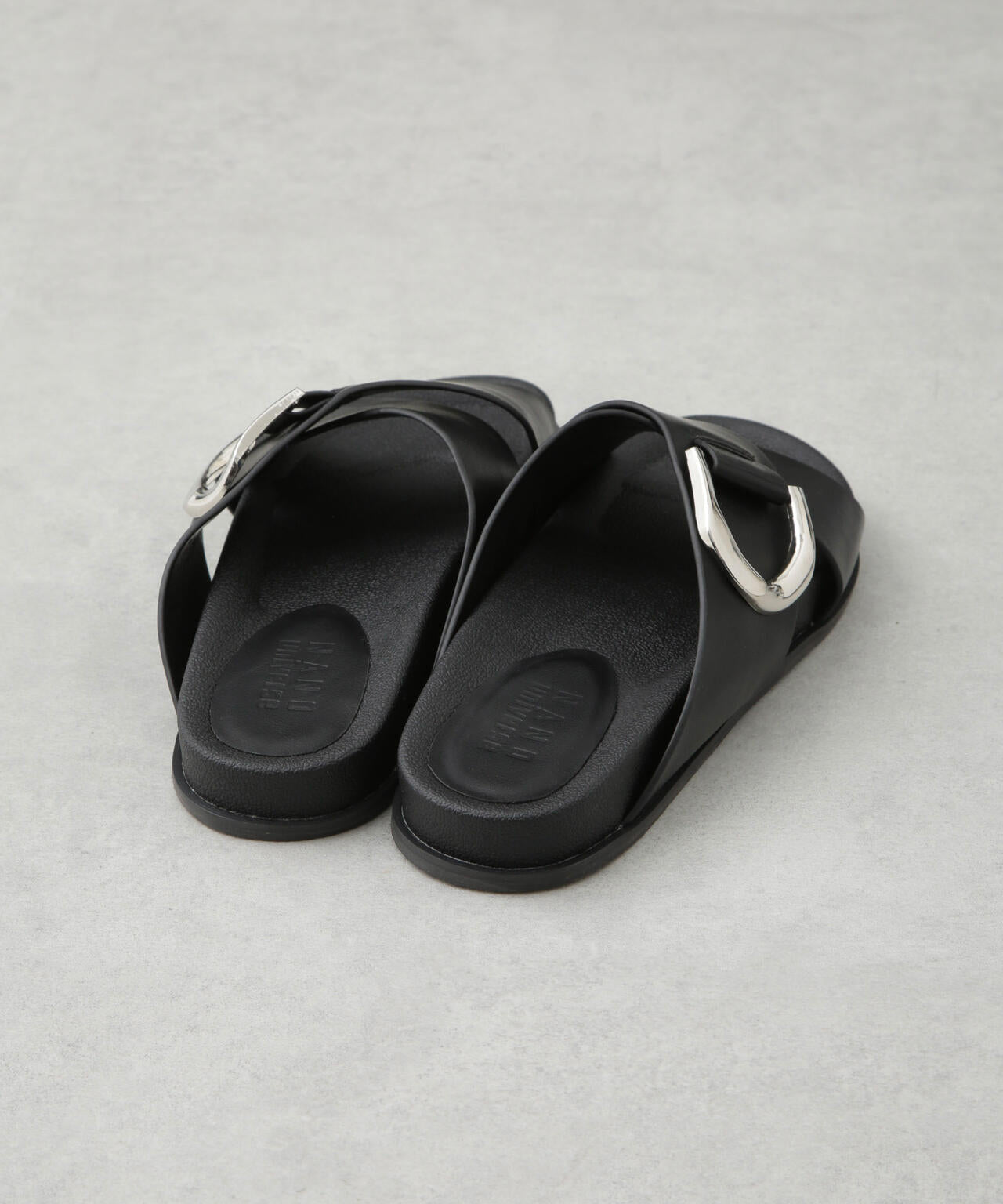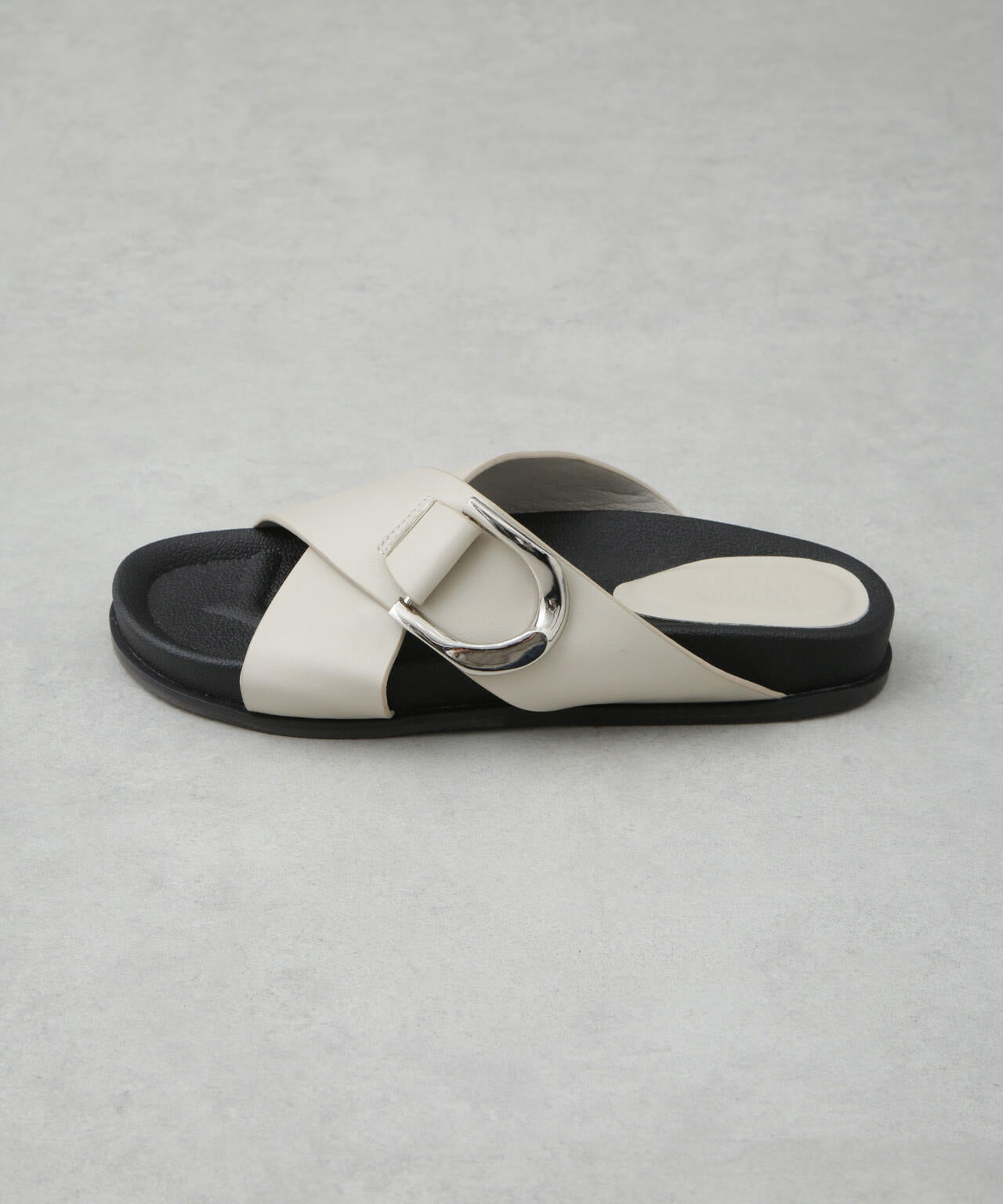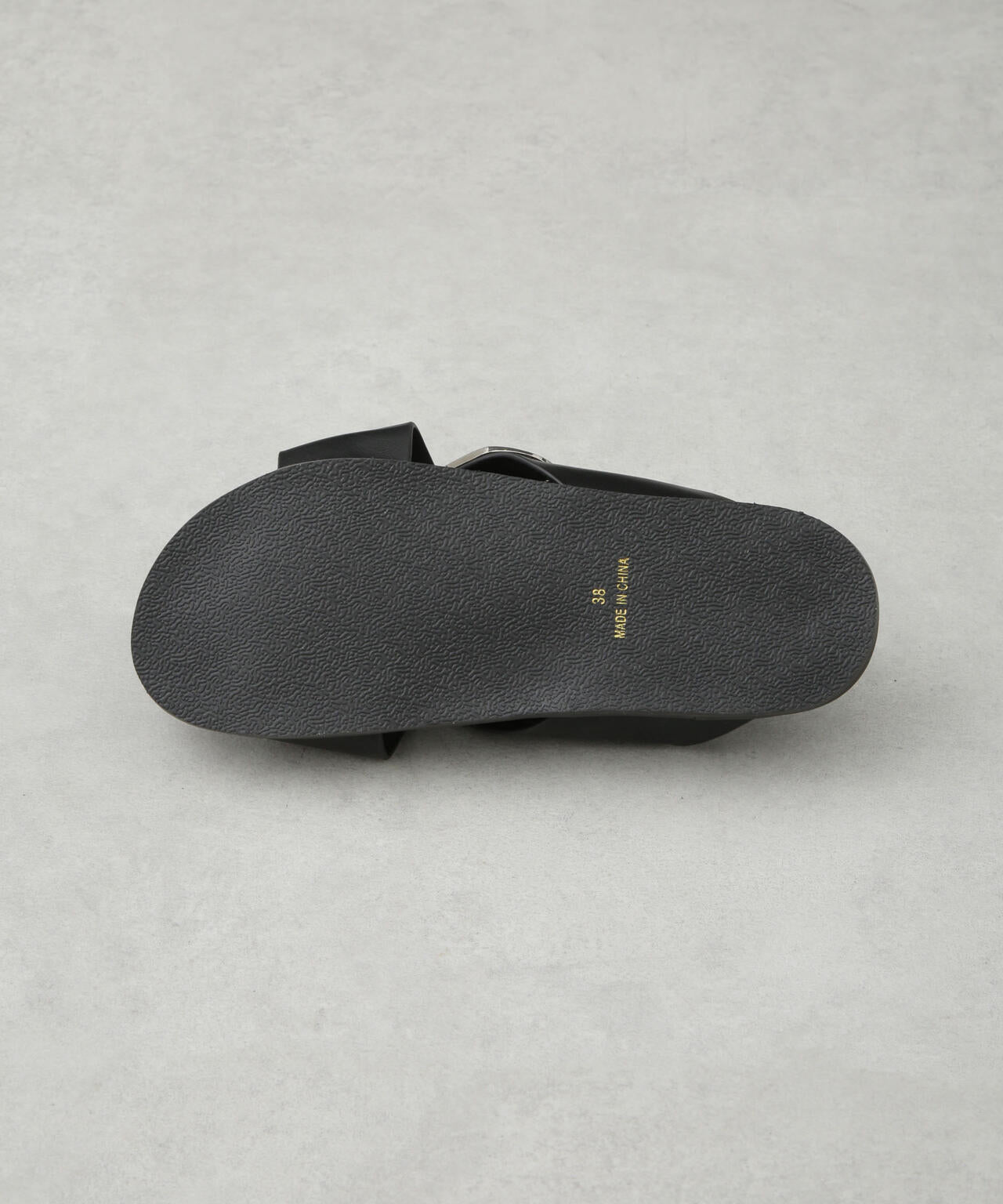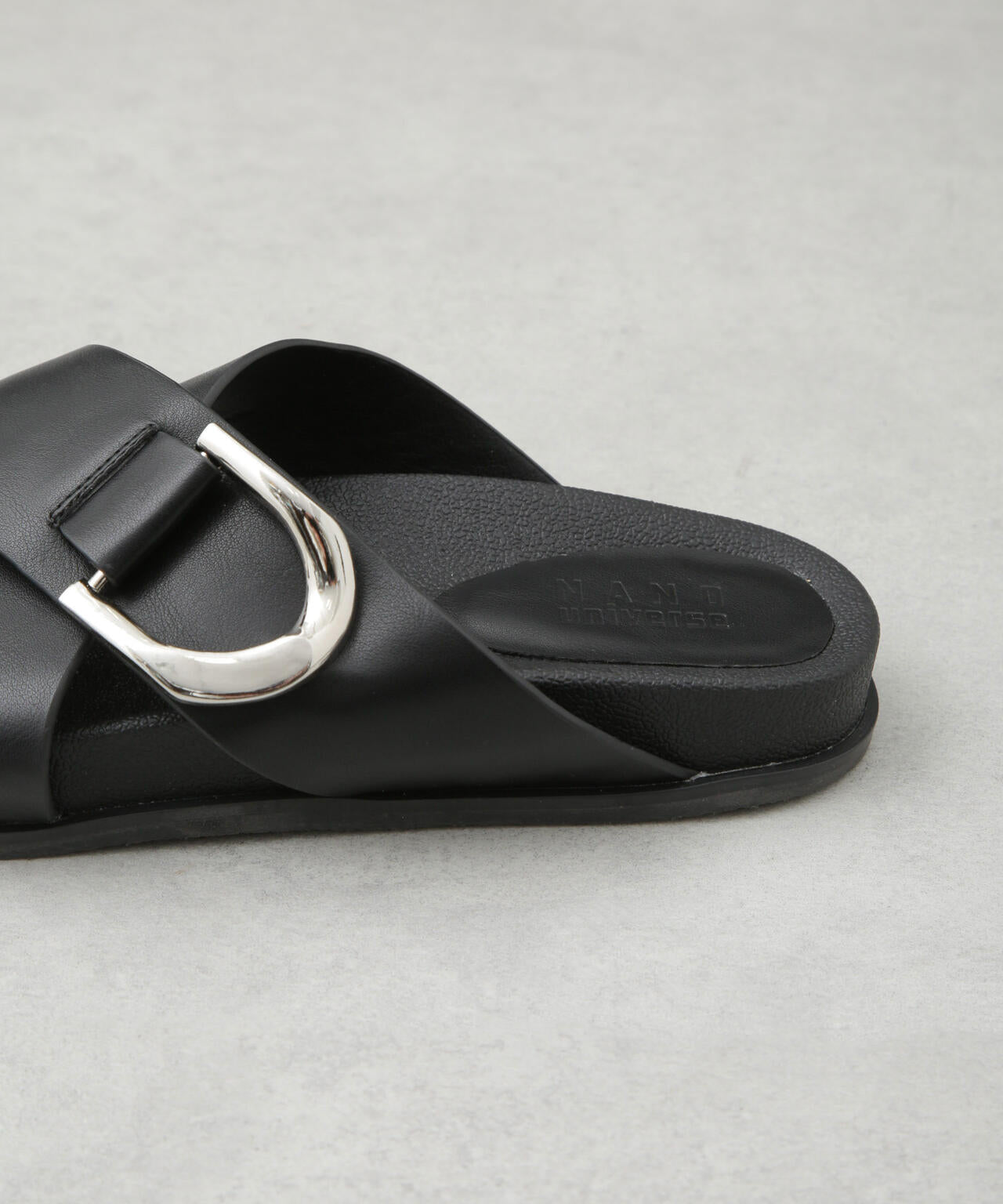 大きめのメタルバックルがアクセントを効かせるフラットサンダル。足元にボリュームが出るので全体のバランスを取りやすく、どんなスタイルにも合わせやすい万能アイテムです。