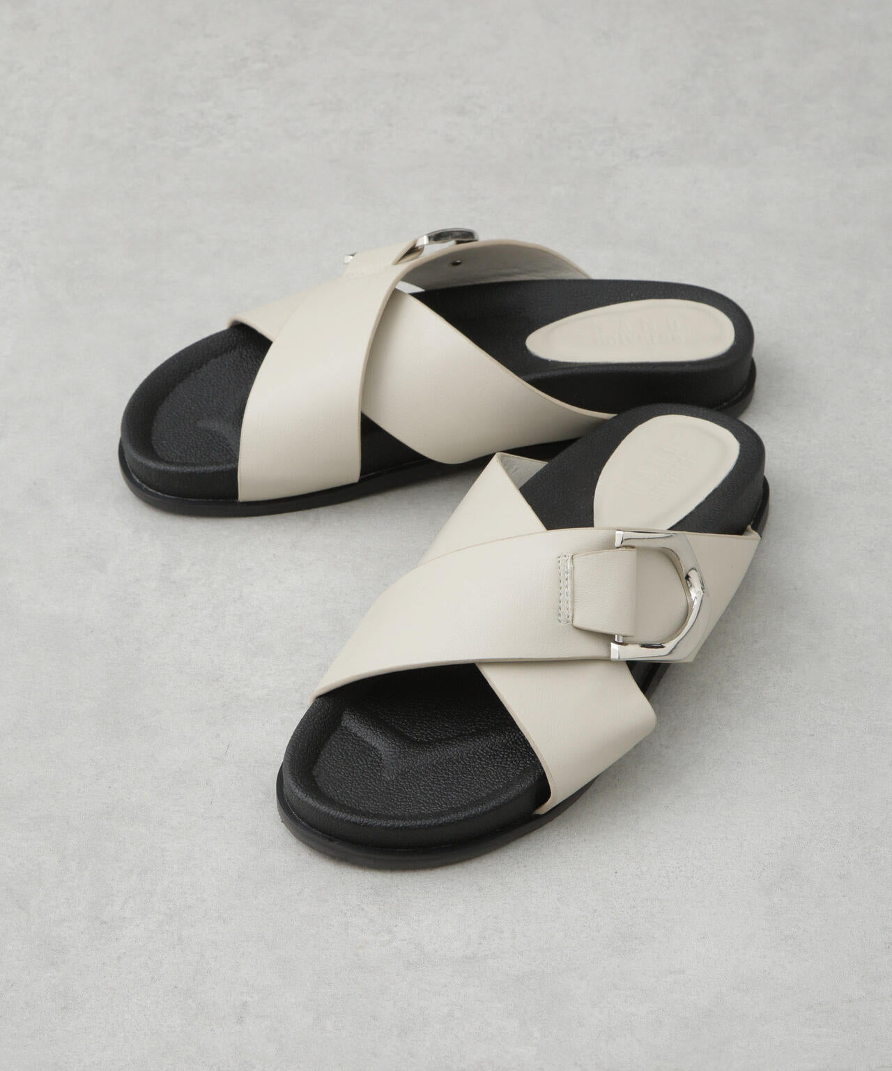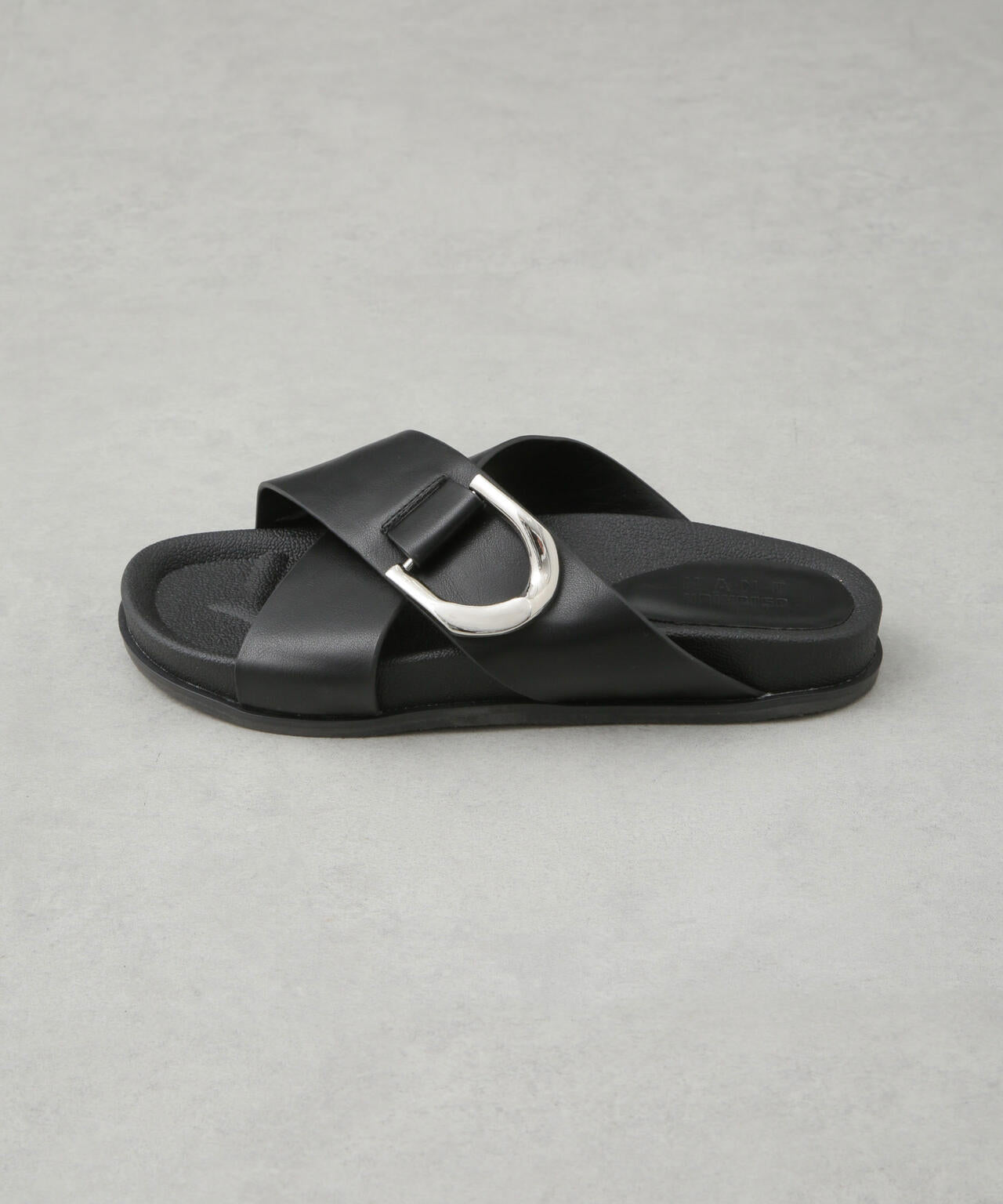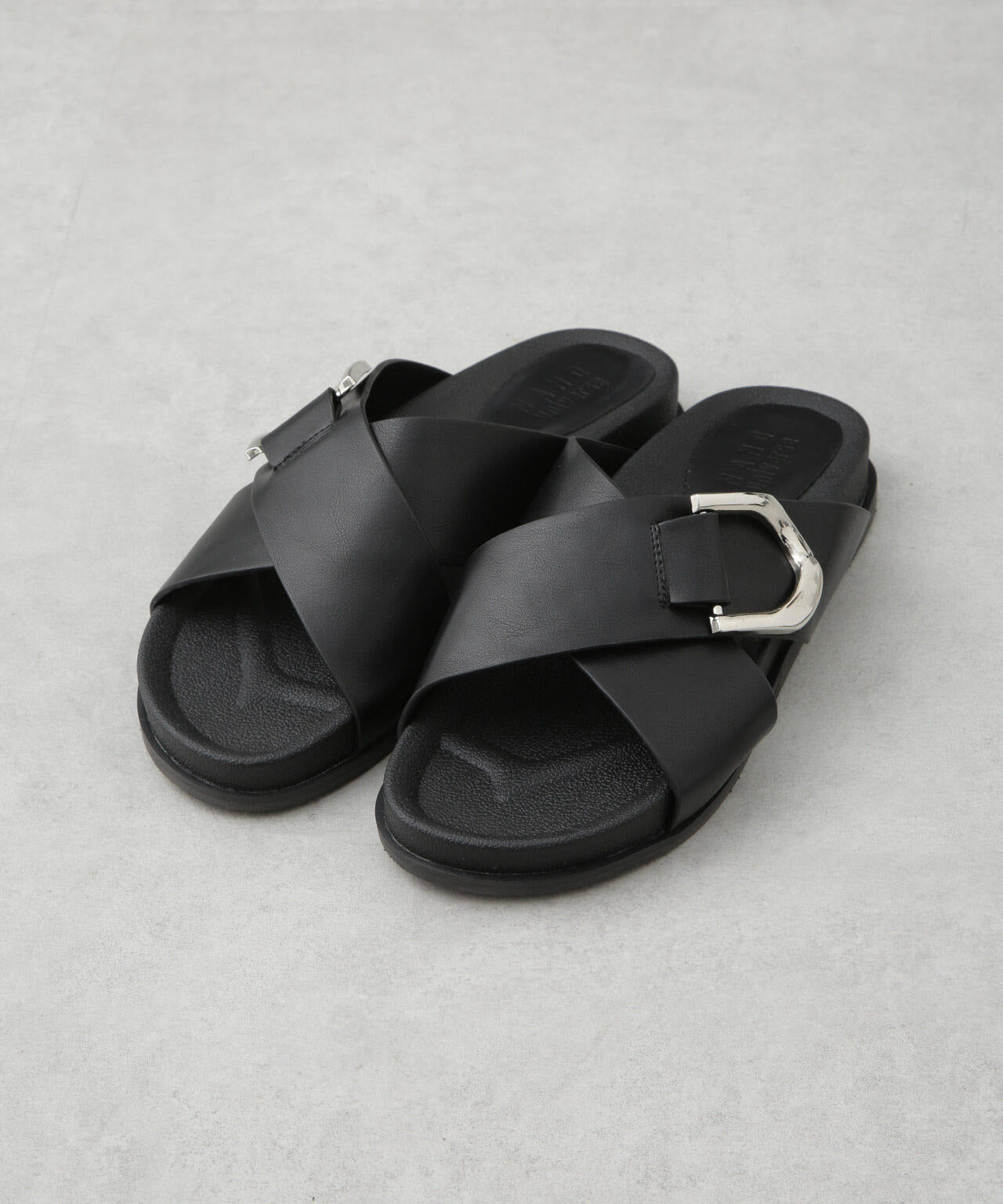 大きめのメタルバックルがアクセントを効かせるフラットサンダル。足元にボリュームが出るので全体のバランスを取りやすく、どんなスタイルにも合わせやすい万能アイテムです。