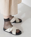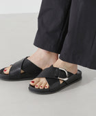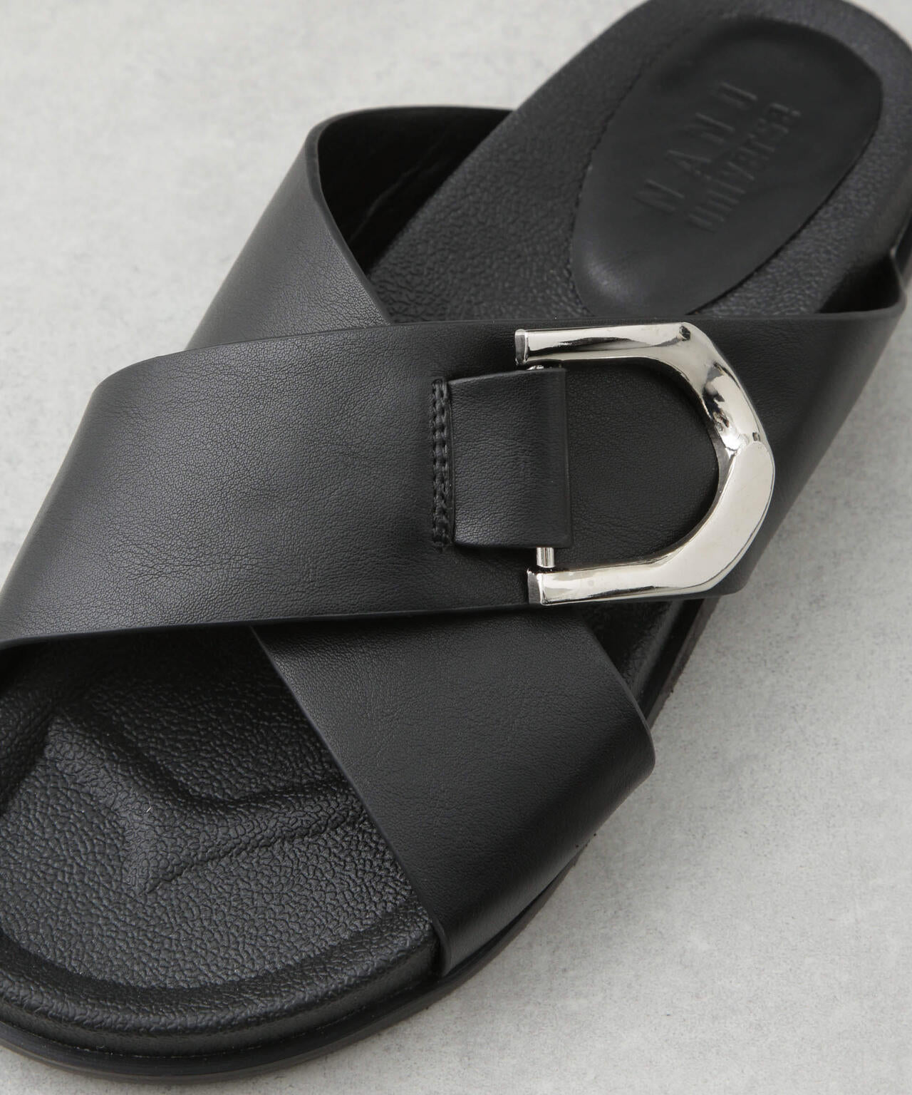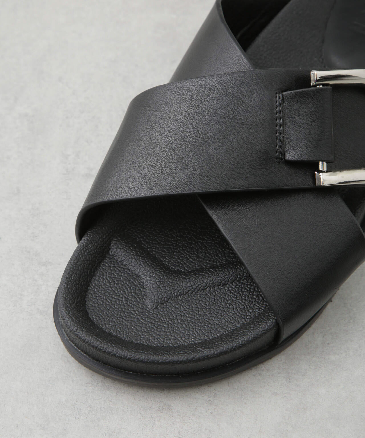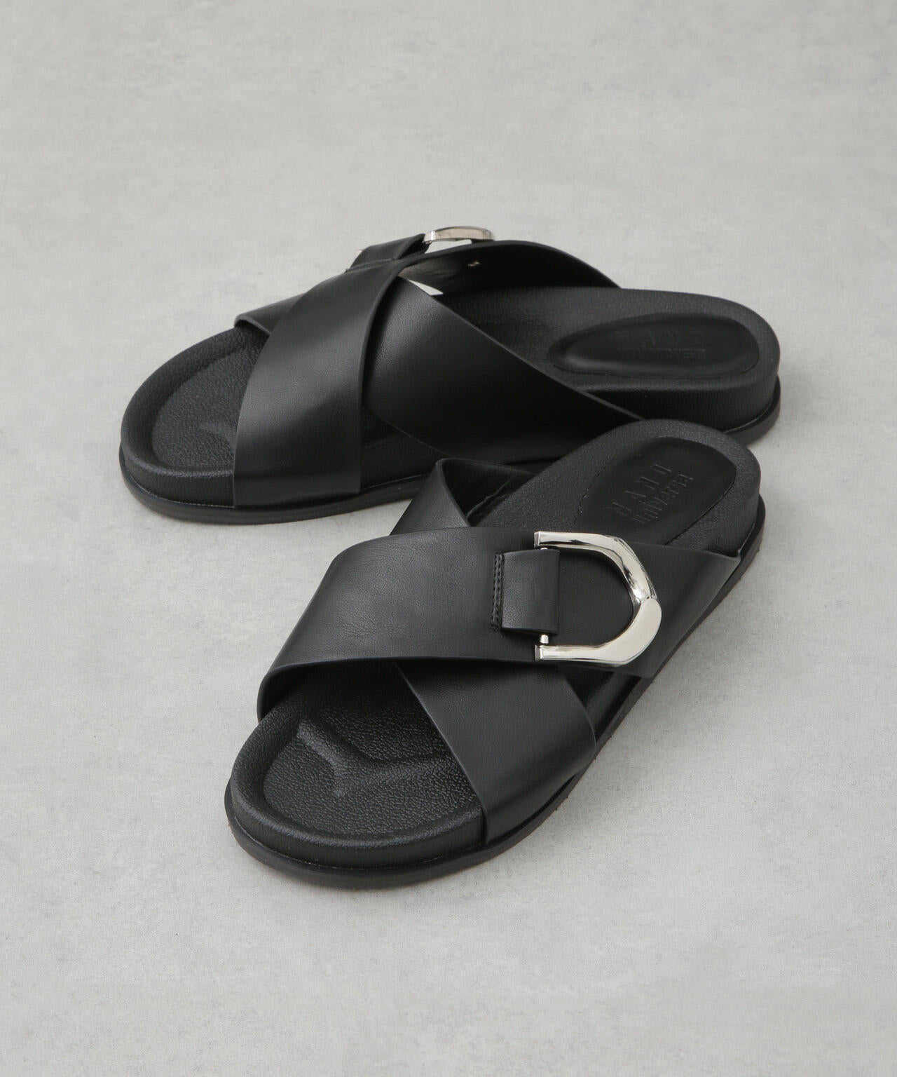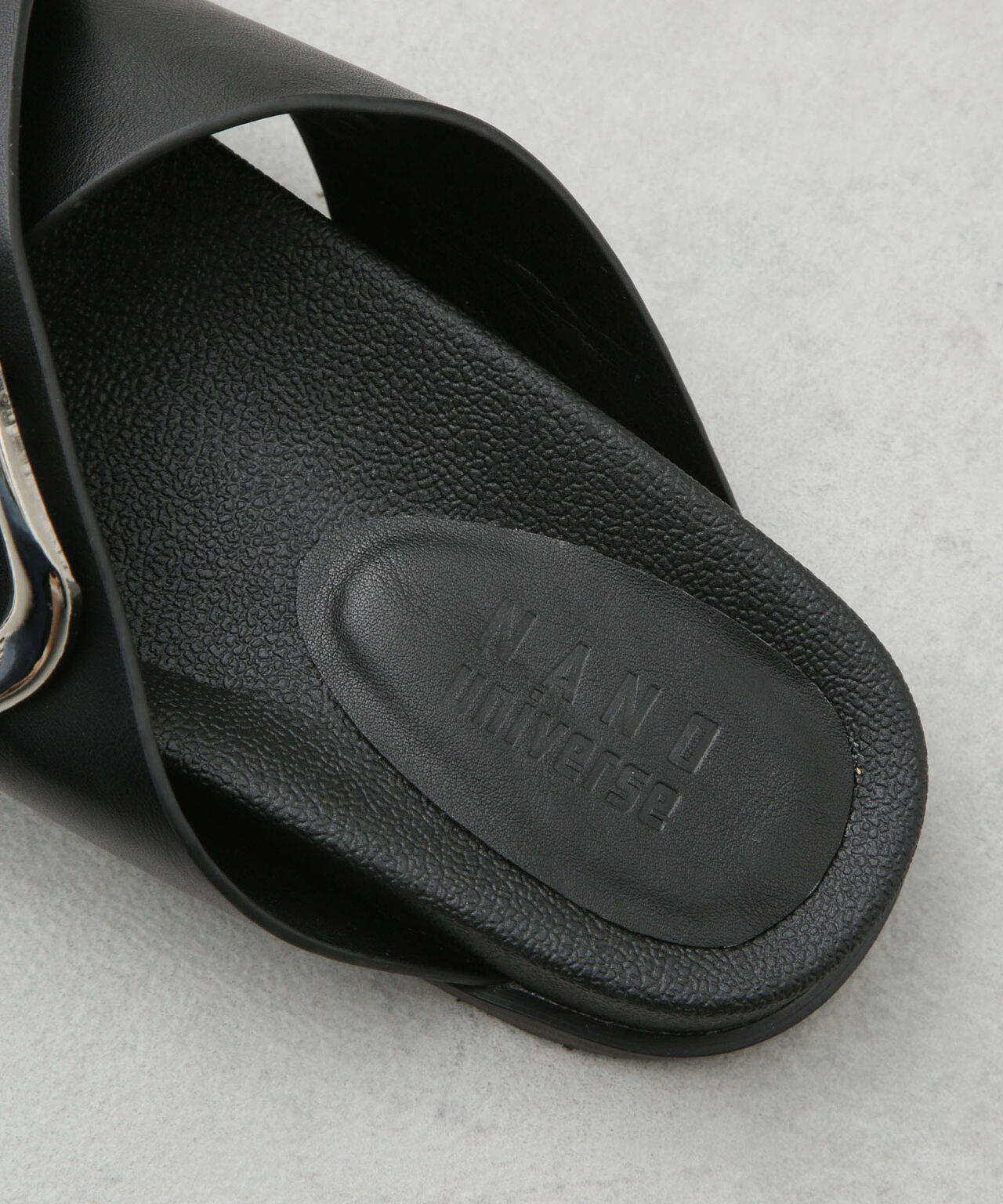 大きめのメタルバックルがアクセントを効かせるフラットサンダル。足元にボリュームが出るので全体のバランスを取りやすく、どんなスタイルにも合わせやすい万能アイテムです。