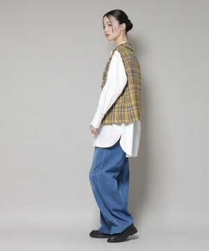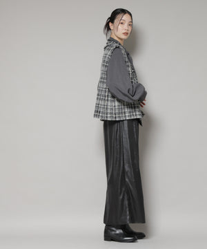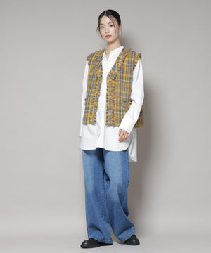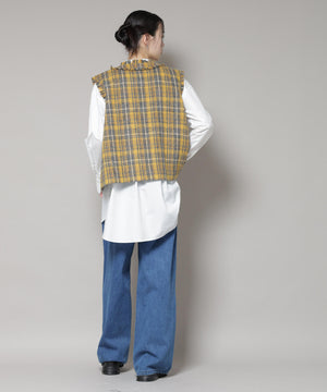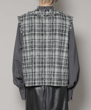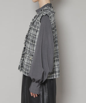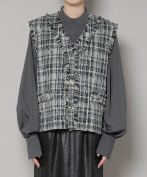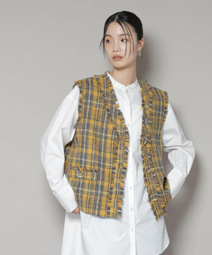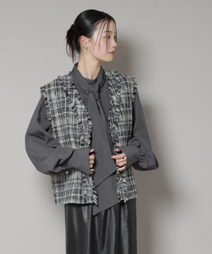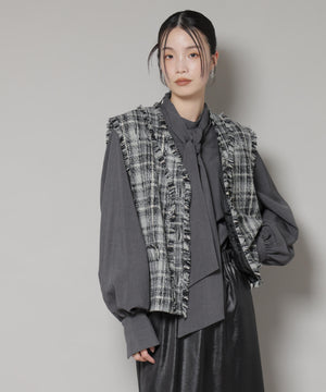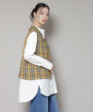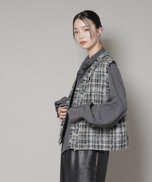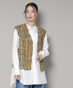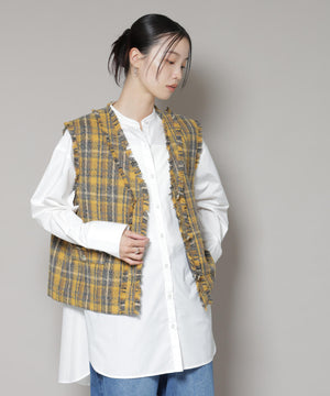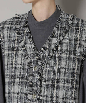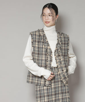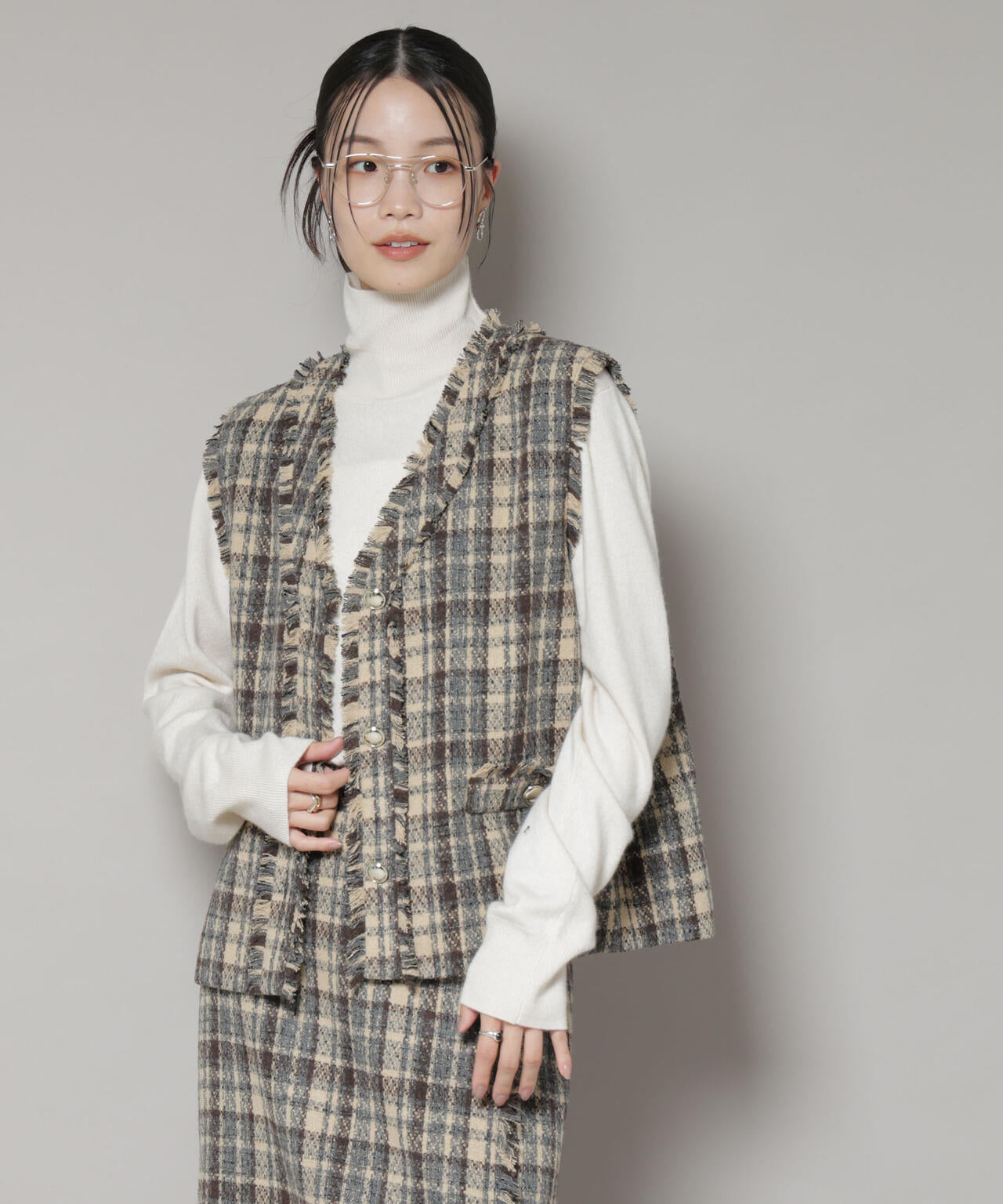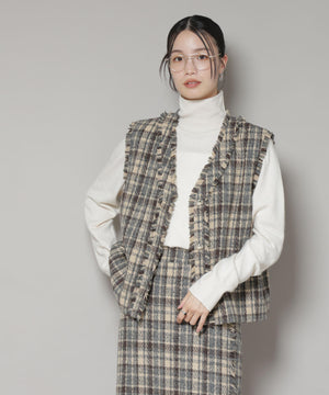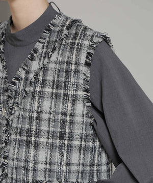 ・きれいめなチェックにフリンジをあしらったデザイン性が魅力のジレ