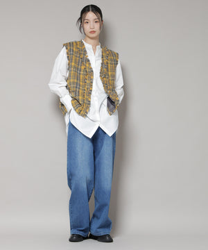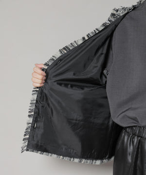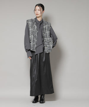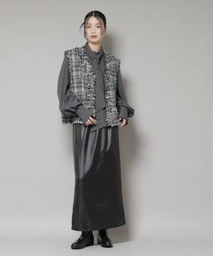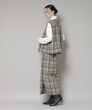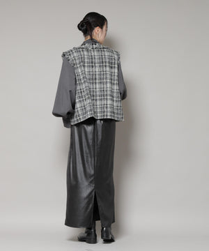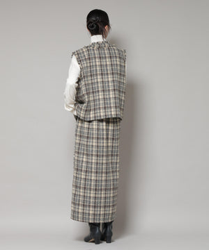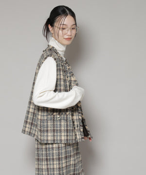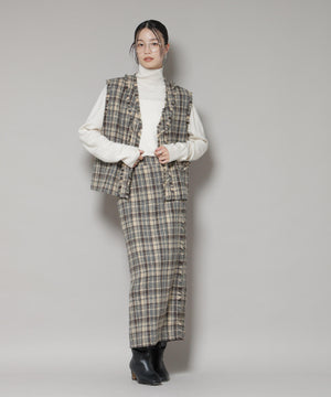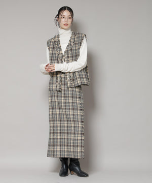 上品さのあるチェック柄とフリンジディティールが目を引くジレ。シンプルなトップスにレイヤードするだけで一気に華やかさとこなれ感をプラスしてくれる一品。同素材展開のスカートとのセットアップスタイルもおすすめです。