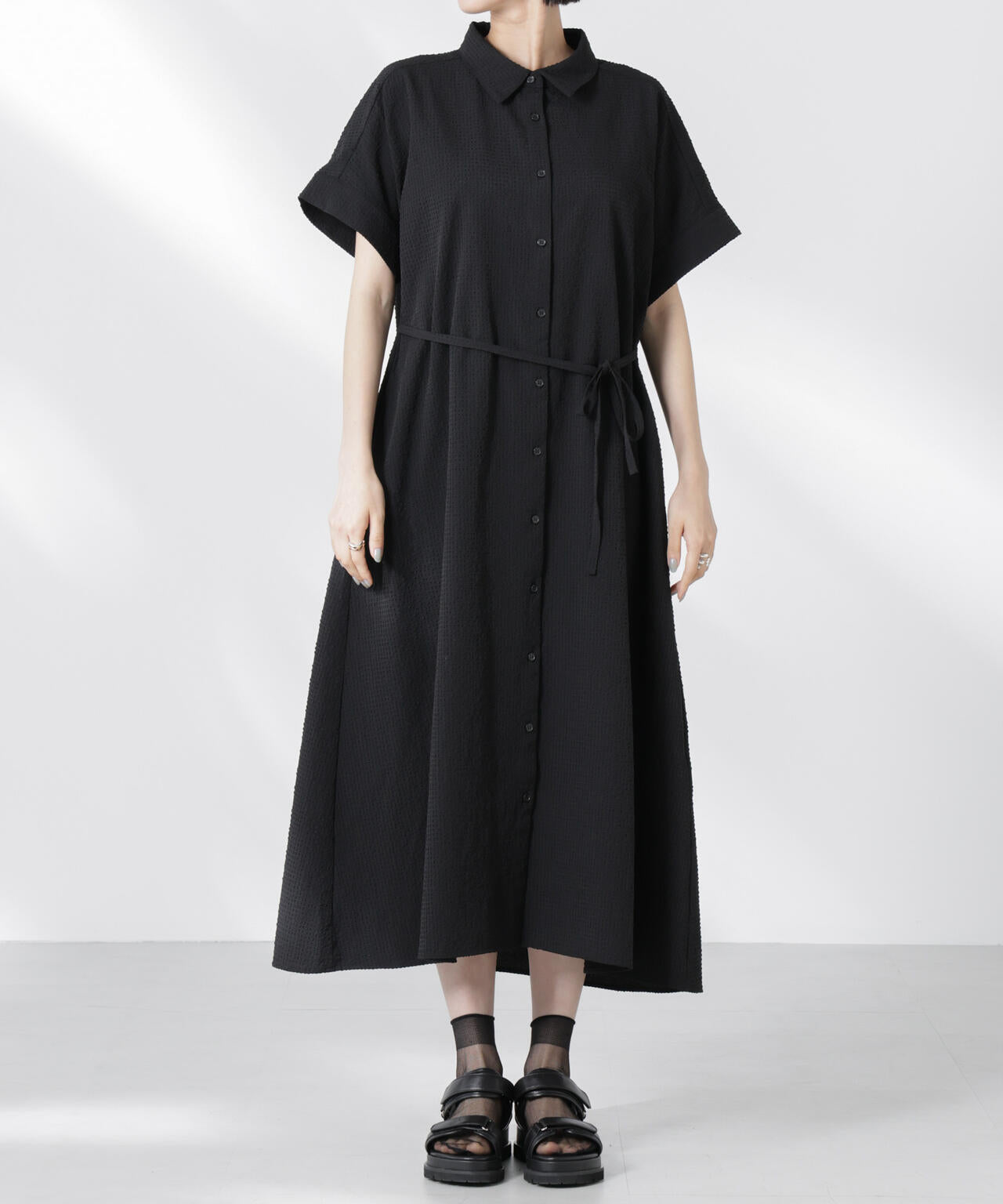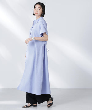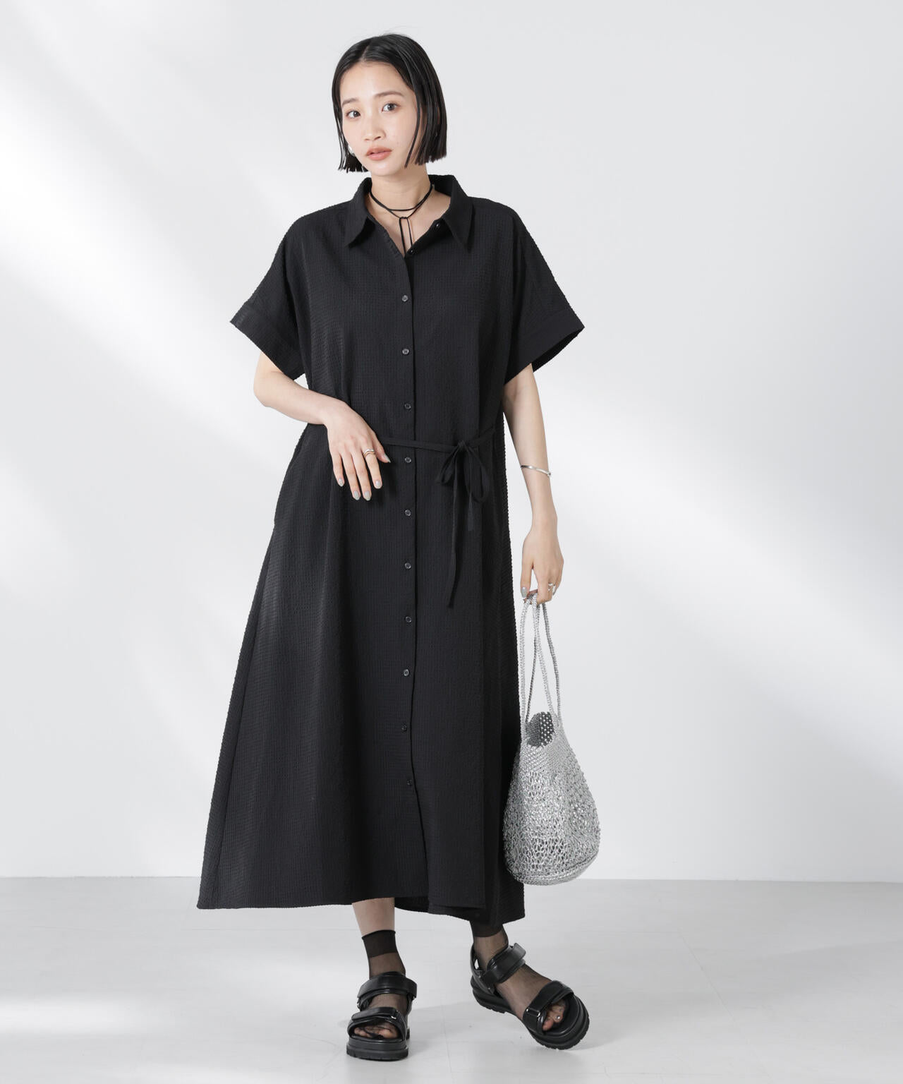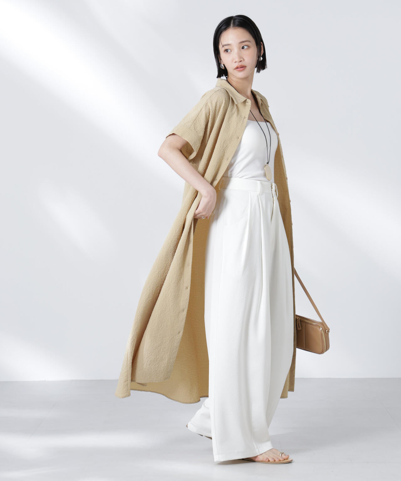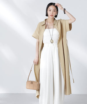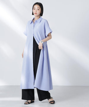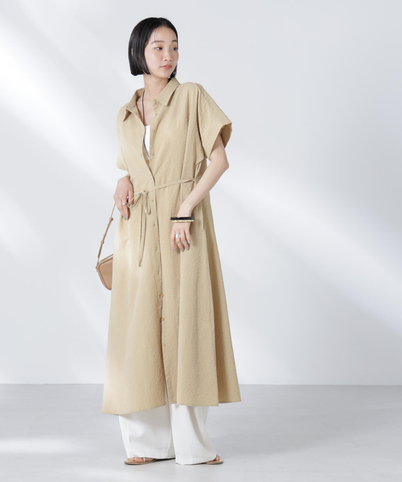 裾に広がるフレアシルエットがリラックス感漂うシャツワンピース。前の釦を閉めてウエストベルトを合わせたり、釦を開けて羽織にしたりとアレンジも可能。シワになりにくくお手入れしやすい素材なのでデイリーユースにピッタリの一枚です。