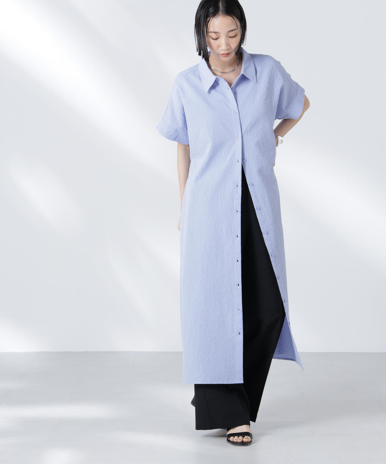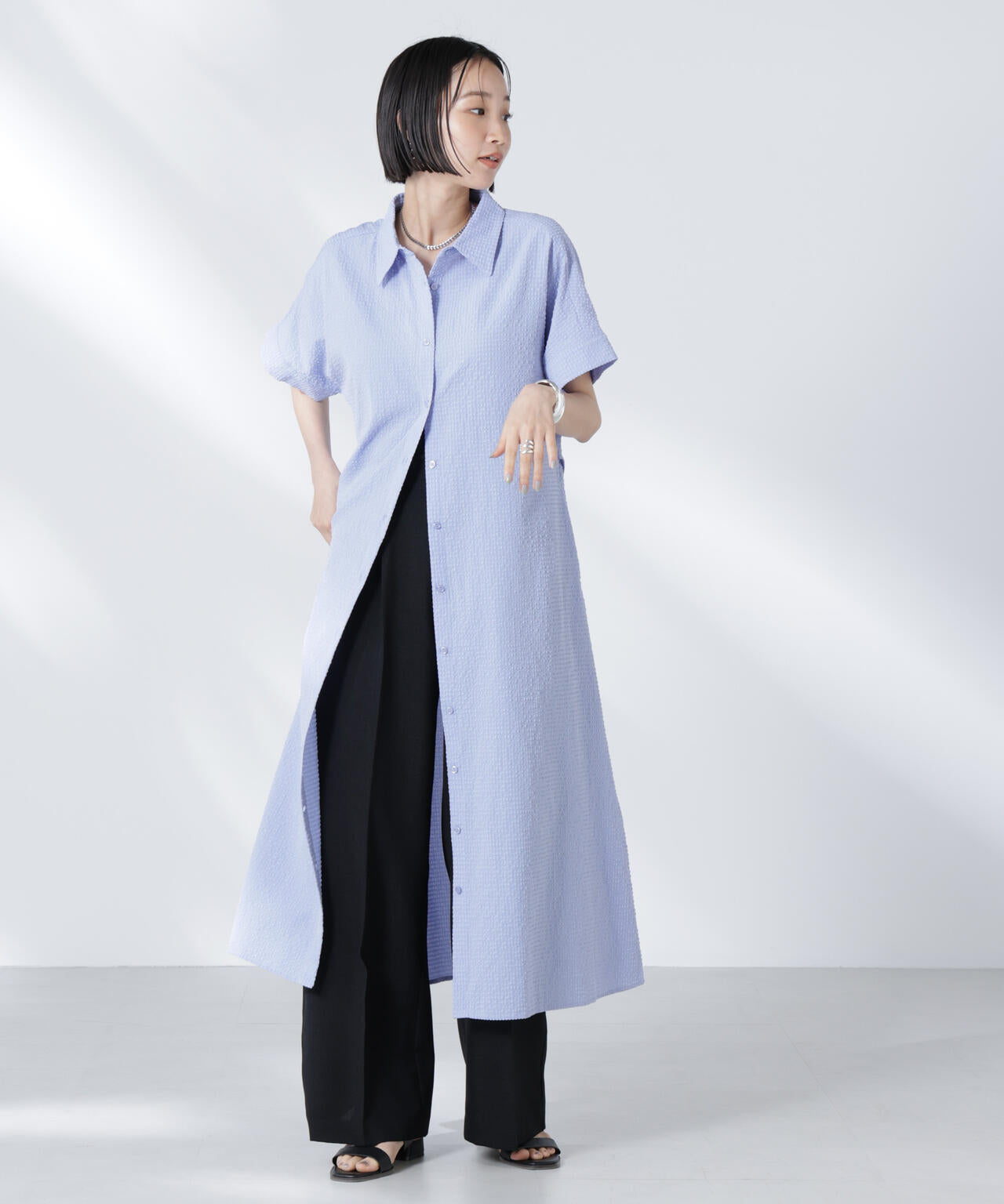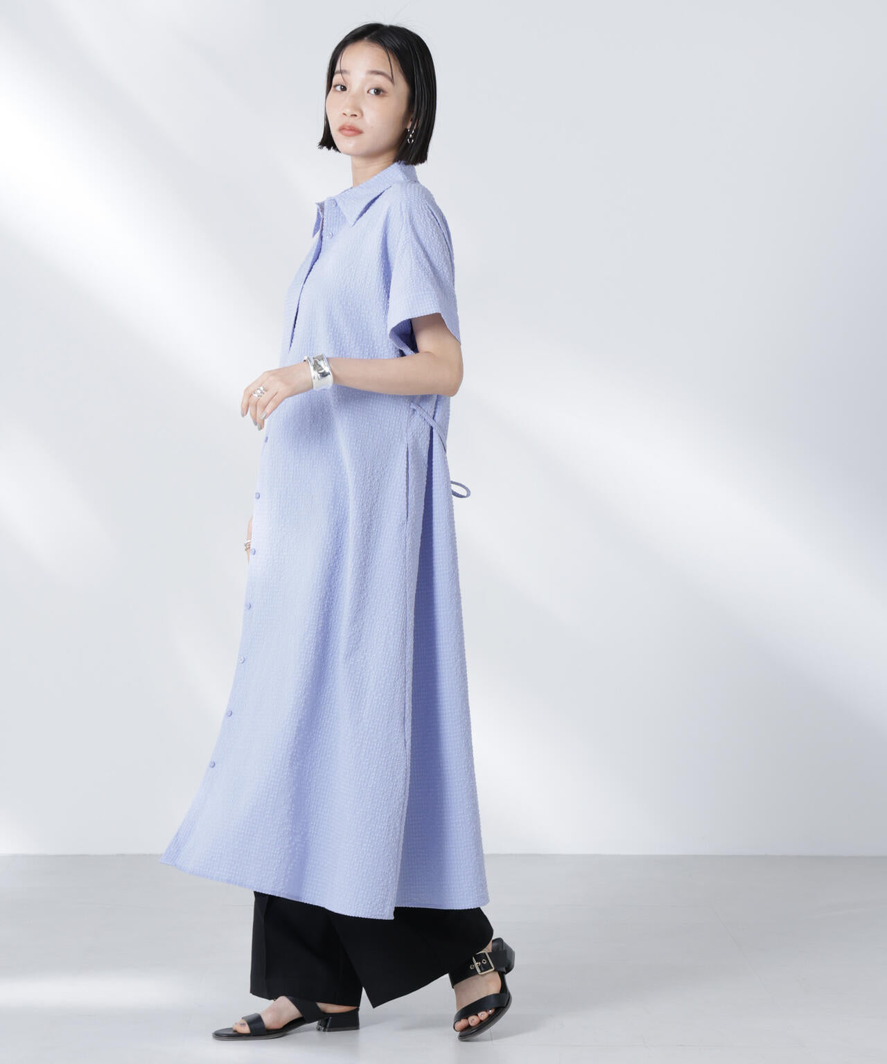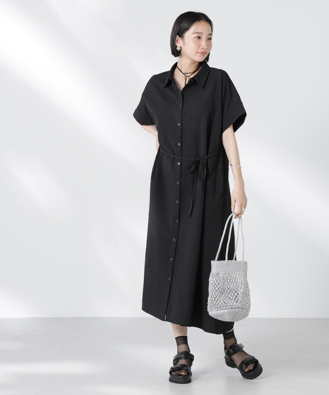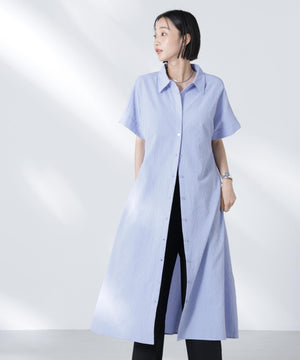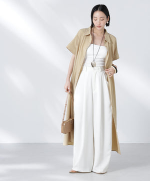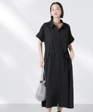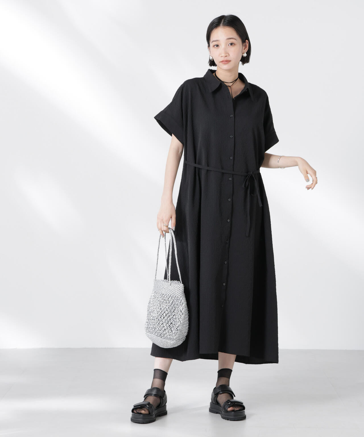 裾に広がるフレアシルエットがリラックス感漂うシャツワンピース。前の釦を閉めてウエストベルトを合わせたり、釦を開けて羽織にしたりとアレンジも可能。シワになりにくくお手入れしやすい素材なのでデイリーユースにピッタリの一枚です。