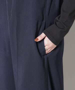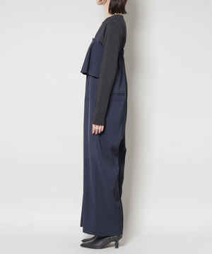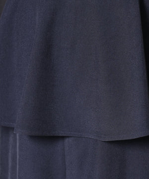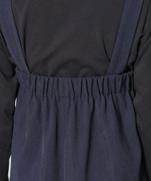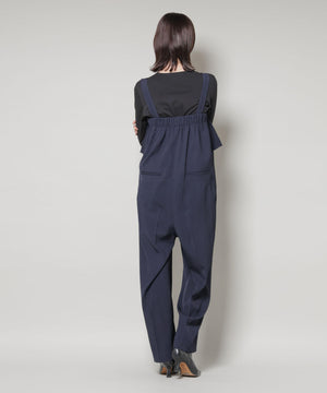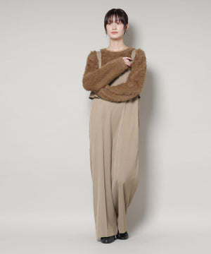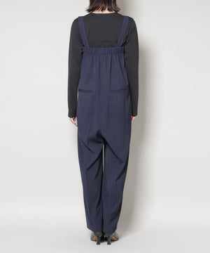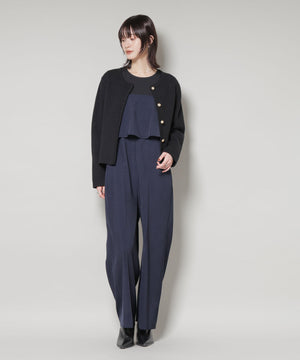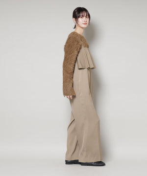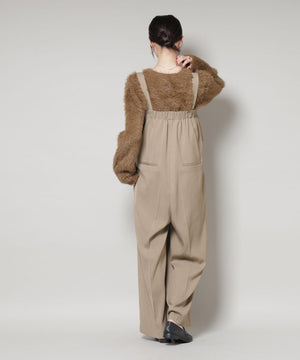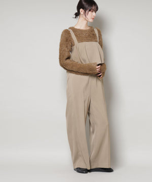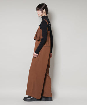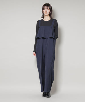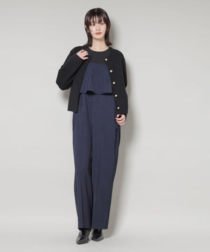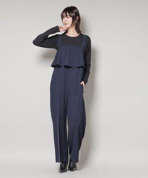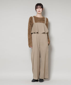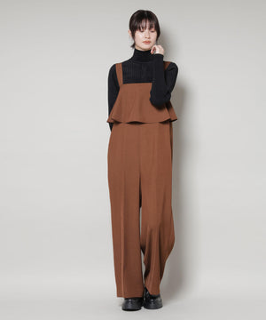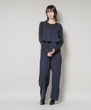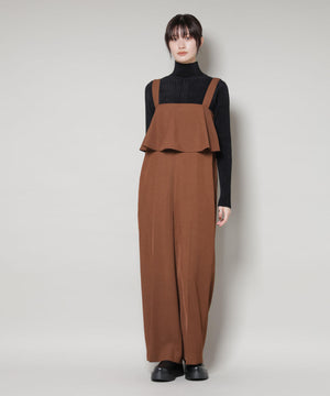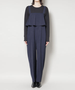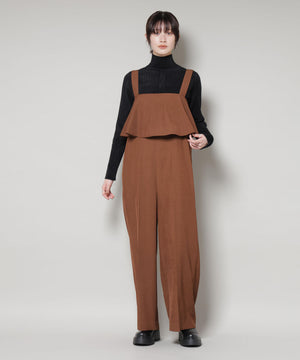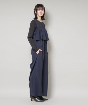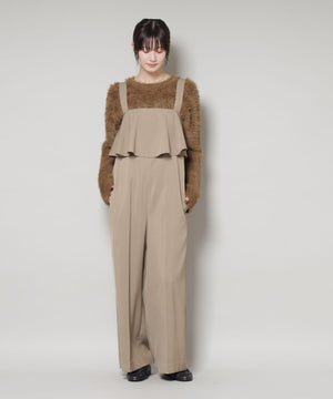 胸元のフリルデザインが女性らしいサロペットパンツ。身体のラインを拾わないややゆとりのあるシルエットで、リラックス感のある一着。インナーにリブニットやタートルトップス、上からカーディガンやジャケットを羽織ったりと、カジュアルから通勤まで幅広いスタイリングを楽しめます。