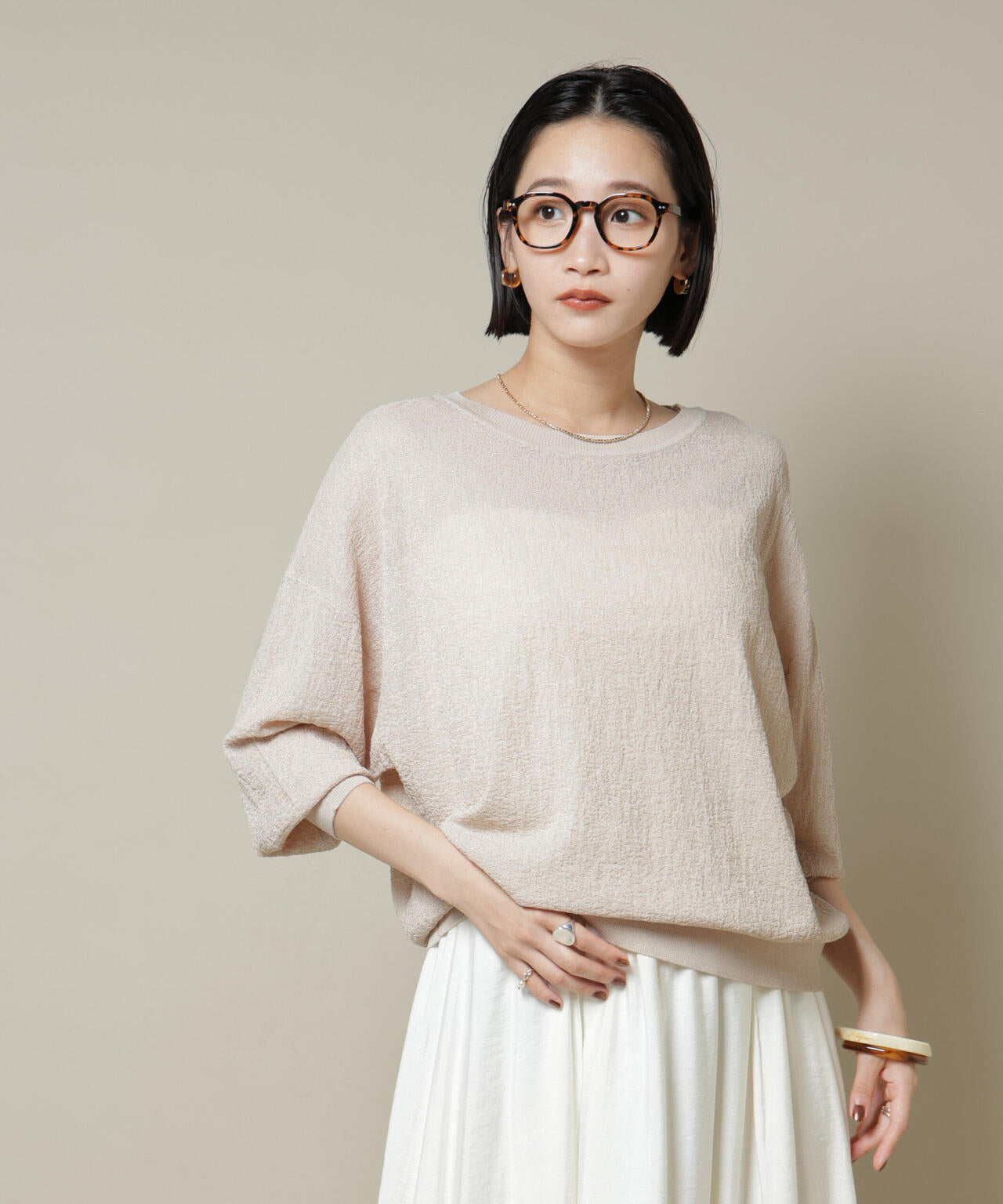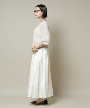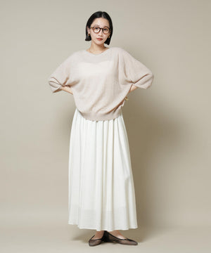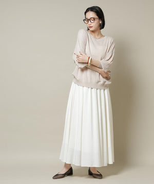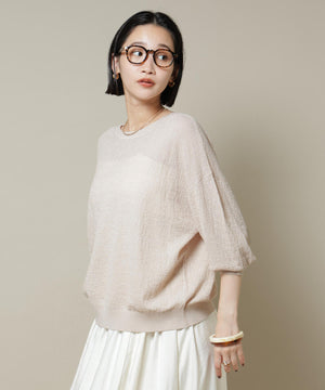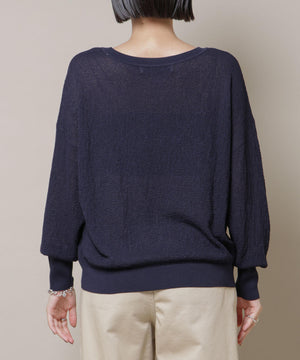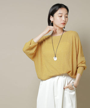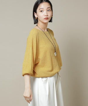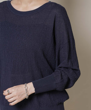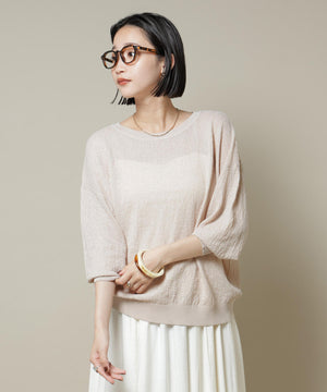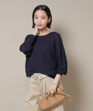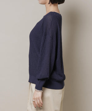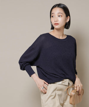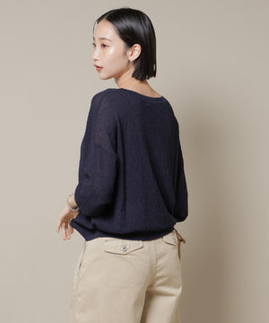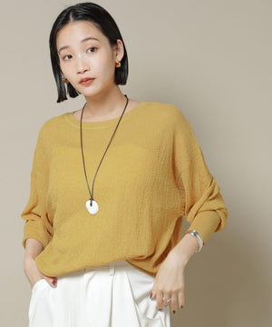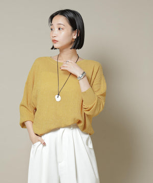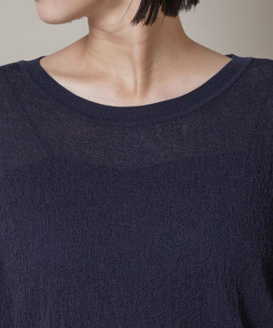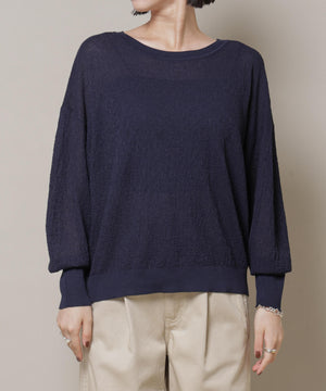 柔らかく通気性があり、着心地の良い編地で仕立てたボートネックニット。ほんのり透けるシアー感と凹凸感のある梨地編みが、シンプルながらも様になるアイテムです。