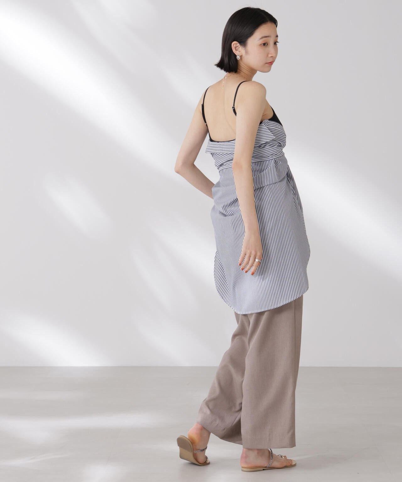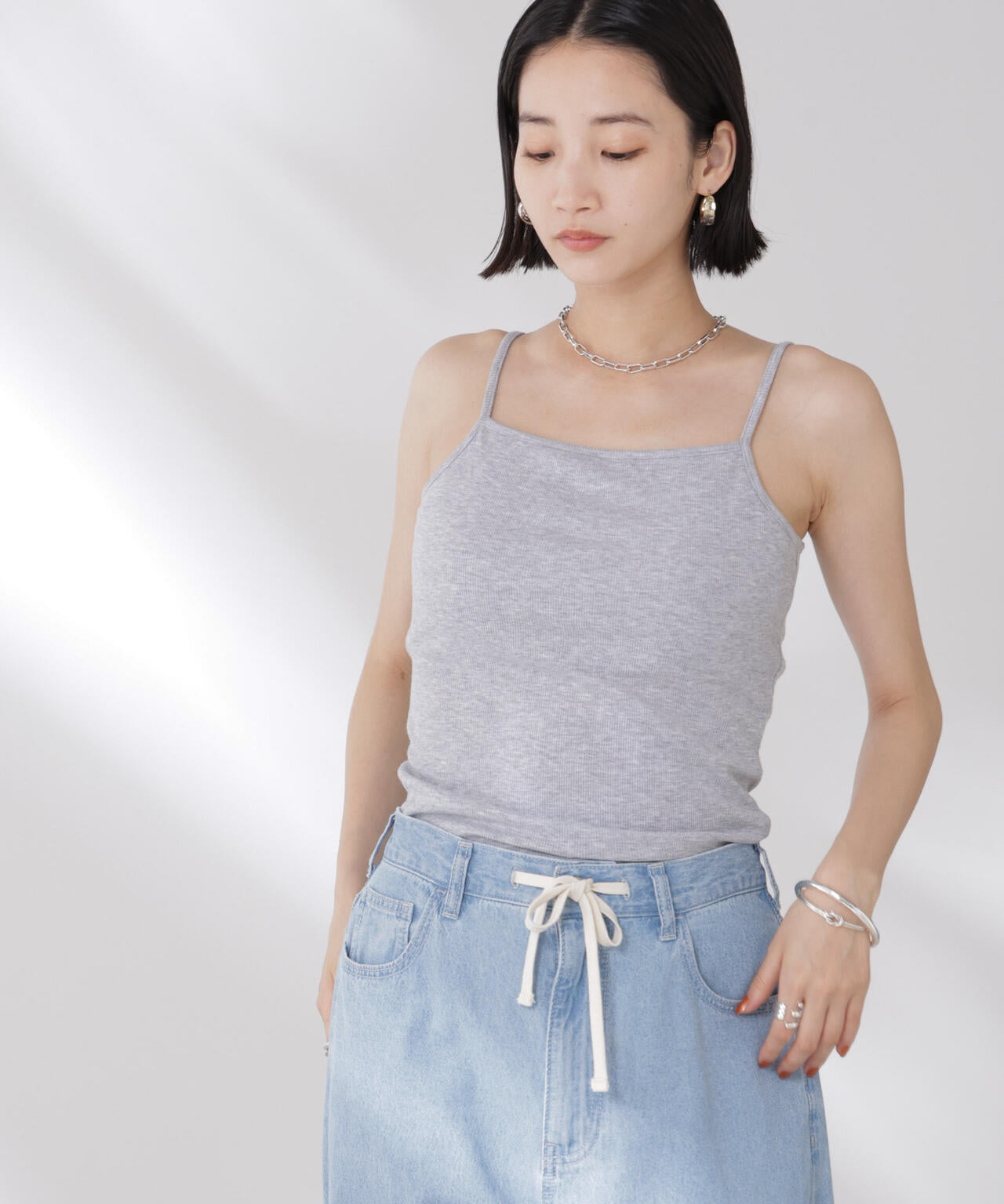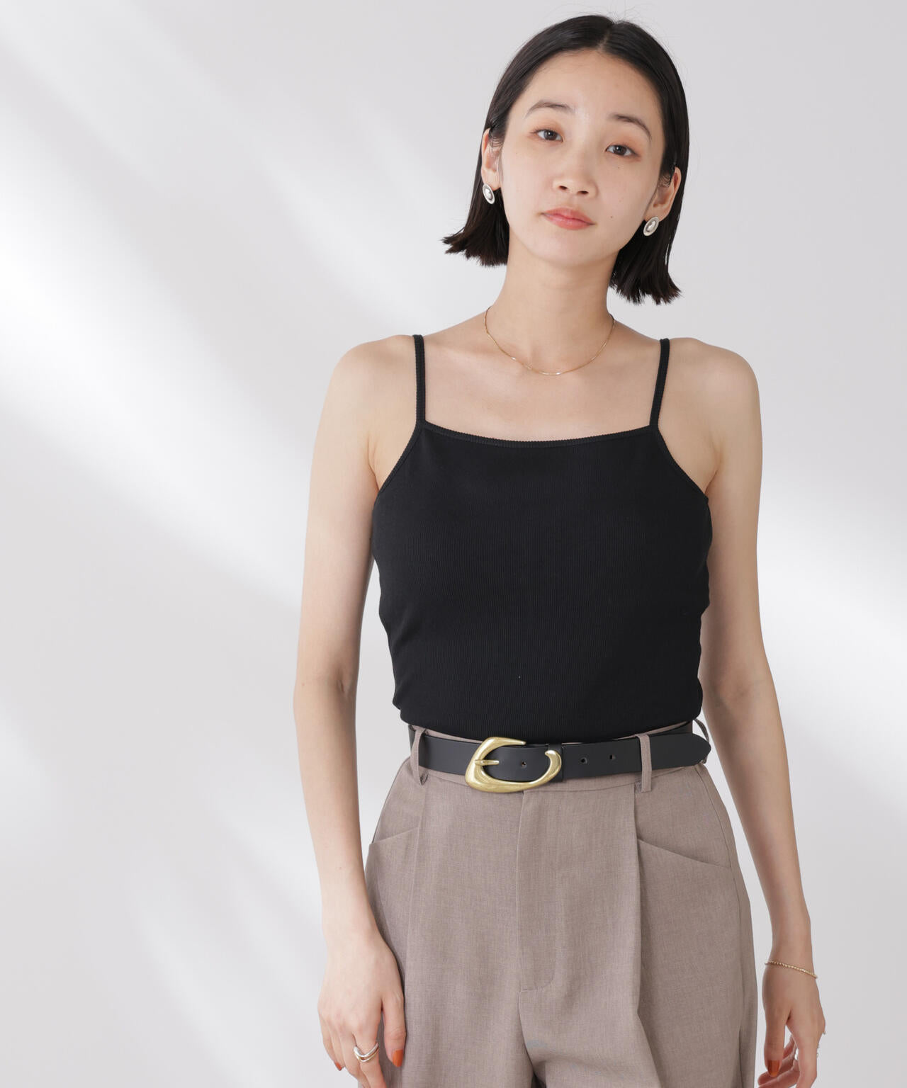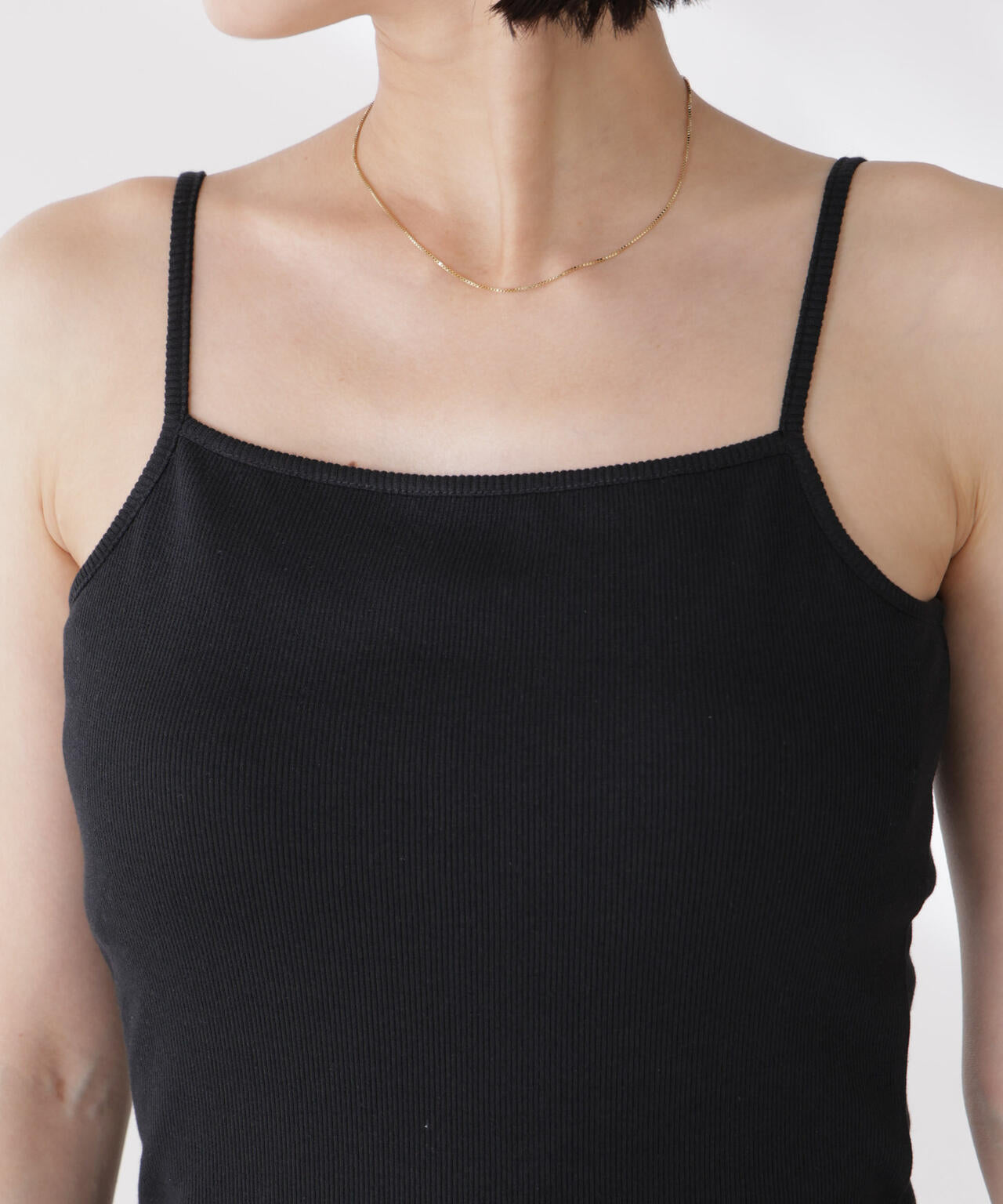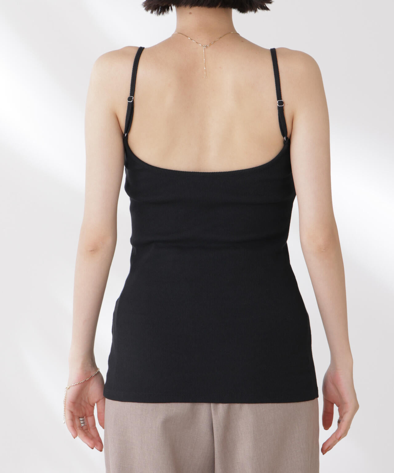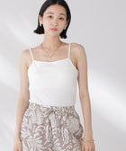 シンプルでどんなコーディネートにも取り入れやすい多機能性素材のカップ付きキャミソール。シャツやジャケット、ニットなどのインナーとしてオールシーズン着回せるので、ワードローブに備えておくと重宝します。
