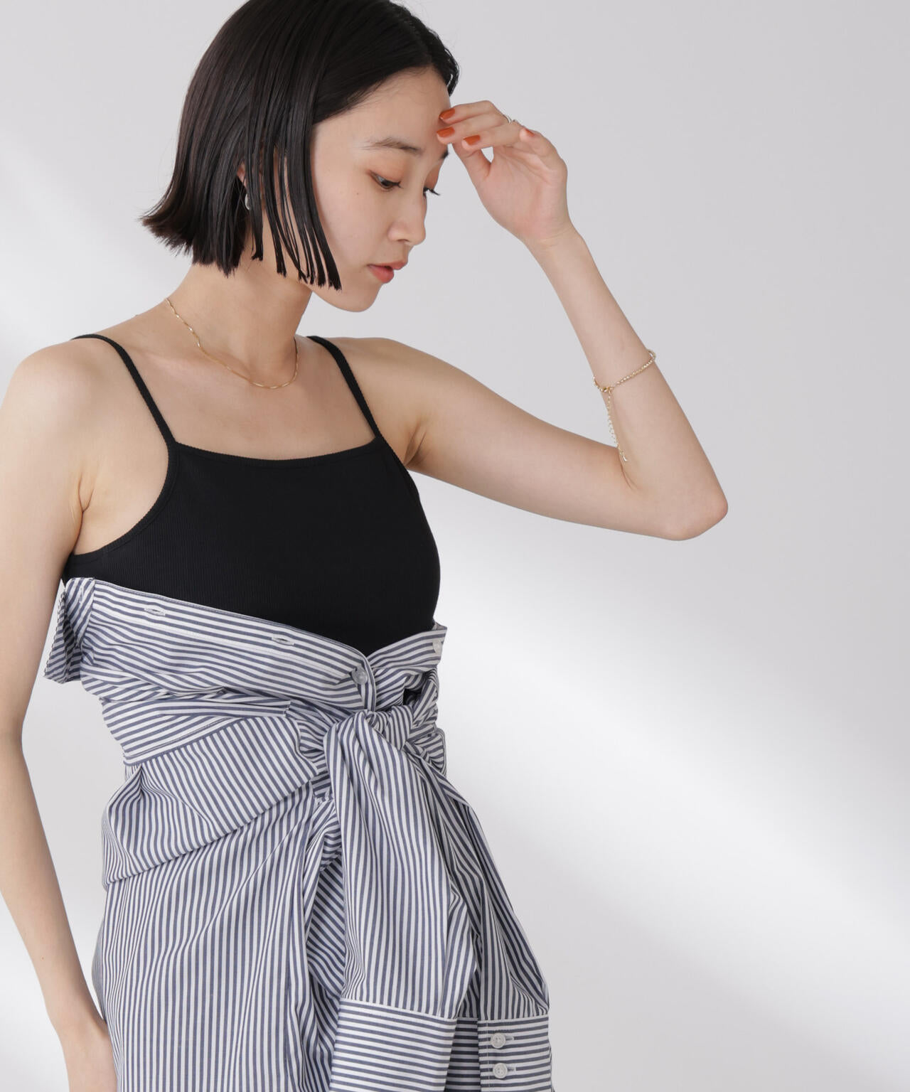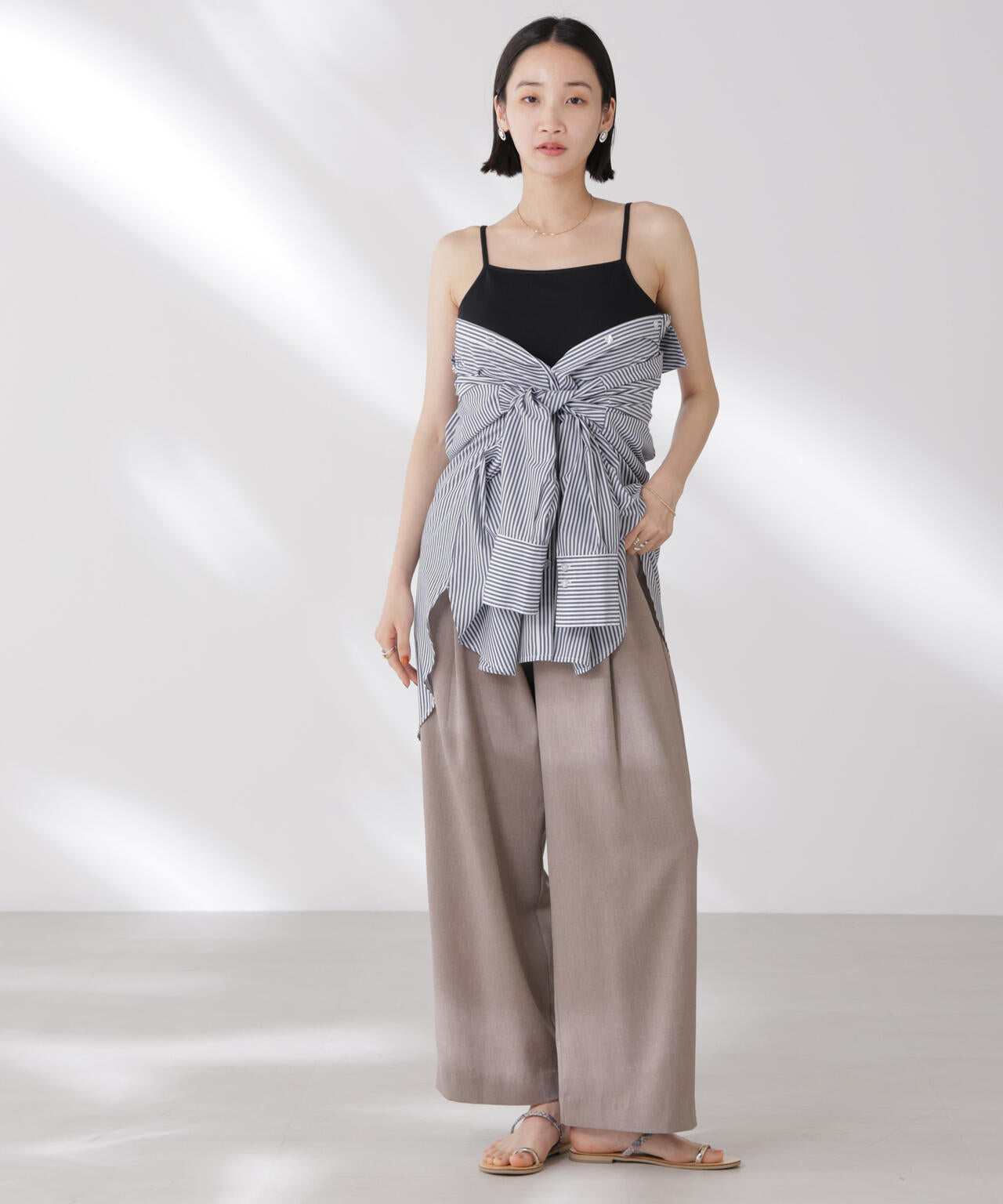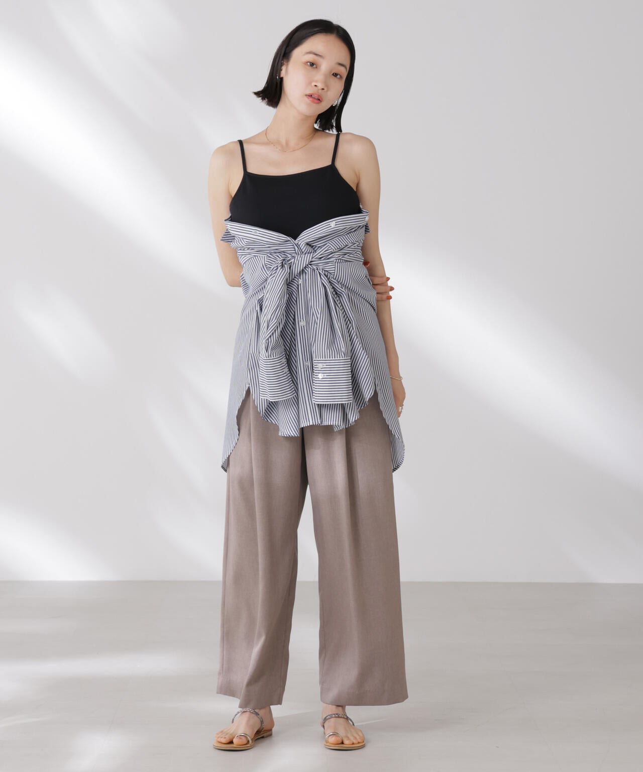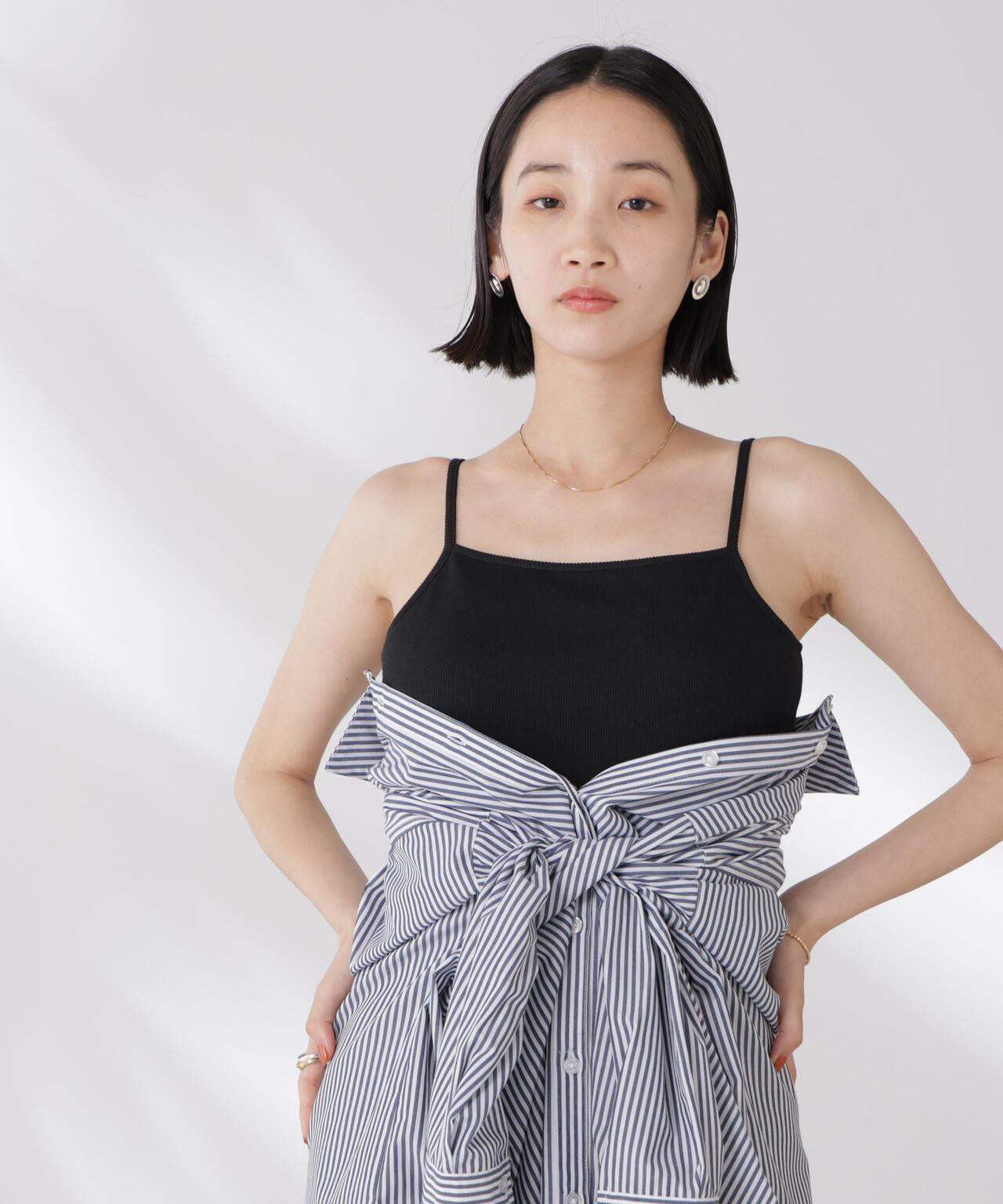 シンプルでどんなコーディネートにも取り入れやすい多機能性素材のカップ付きキャミソール。シャツやジャケット、ニットなどのインナーとしてオールシーズン着回せるので、ワードローブに備えておくと重宝します。