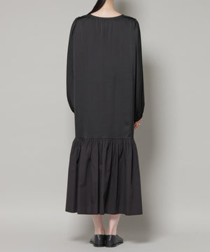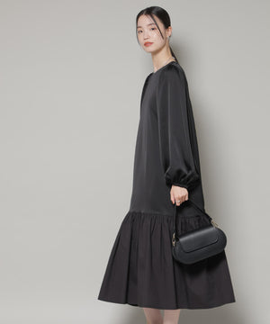 上品な光沢のサテン素材とハリのある素材を組み合わせた、ギャザー切り替えのドッキングワンピース。着るだけで華やかな印象に仕上げてくれるので、オケージョンシーンからオフィスでの普段使いまで幅広いシーンに活躍します。