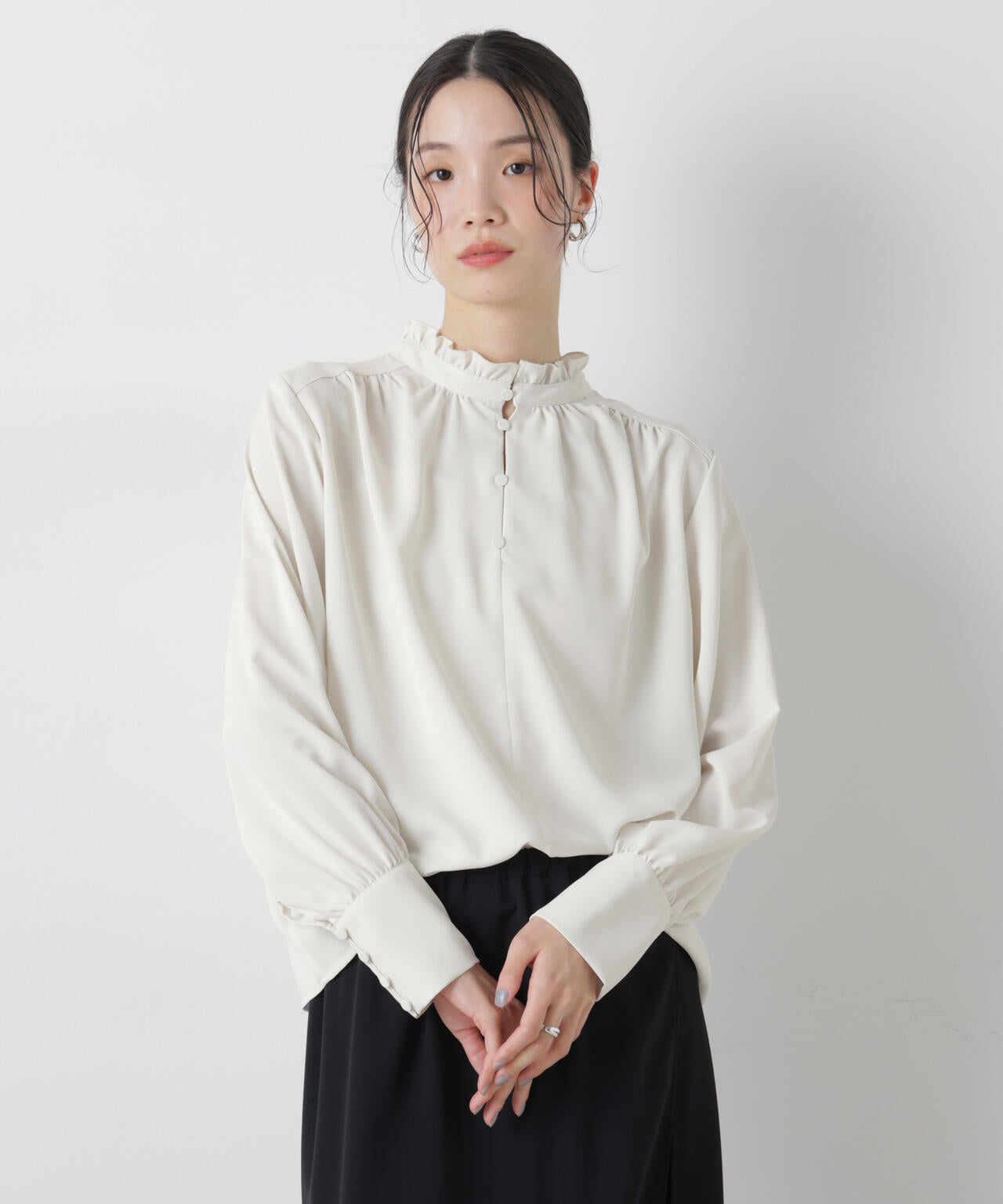 ・定番人気の大人フェミニンなスタンドカラーギャザーブラウス