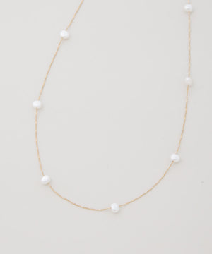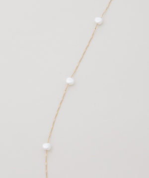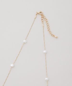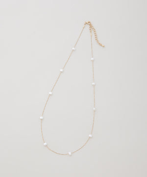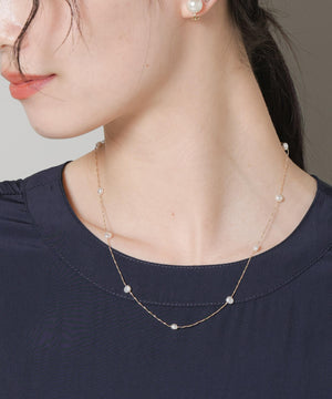 小ぶりのイミテーションパールと、華奢なチェーンのコンビが女性らしく映えるネックレス。重ね付けもしやすく、お手持ちのロングネックレスと合わせたり、パールネックレスと重ねたり、アレンジ次第で雰囲気のチェンジを楽しめます。