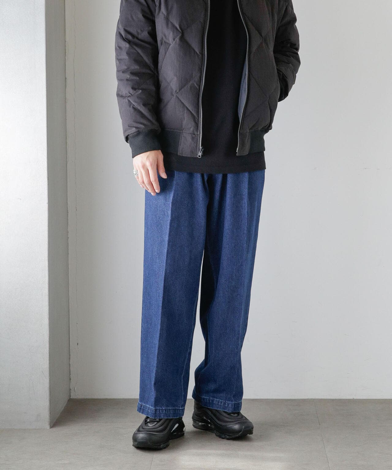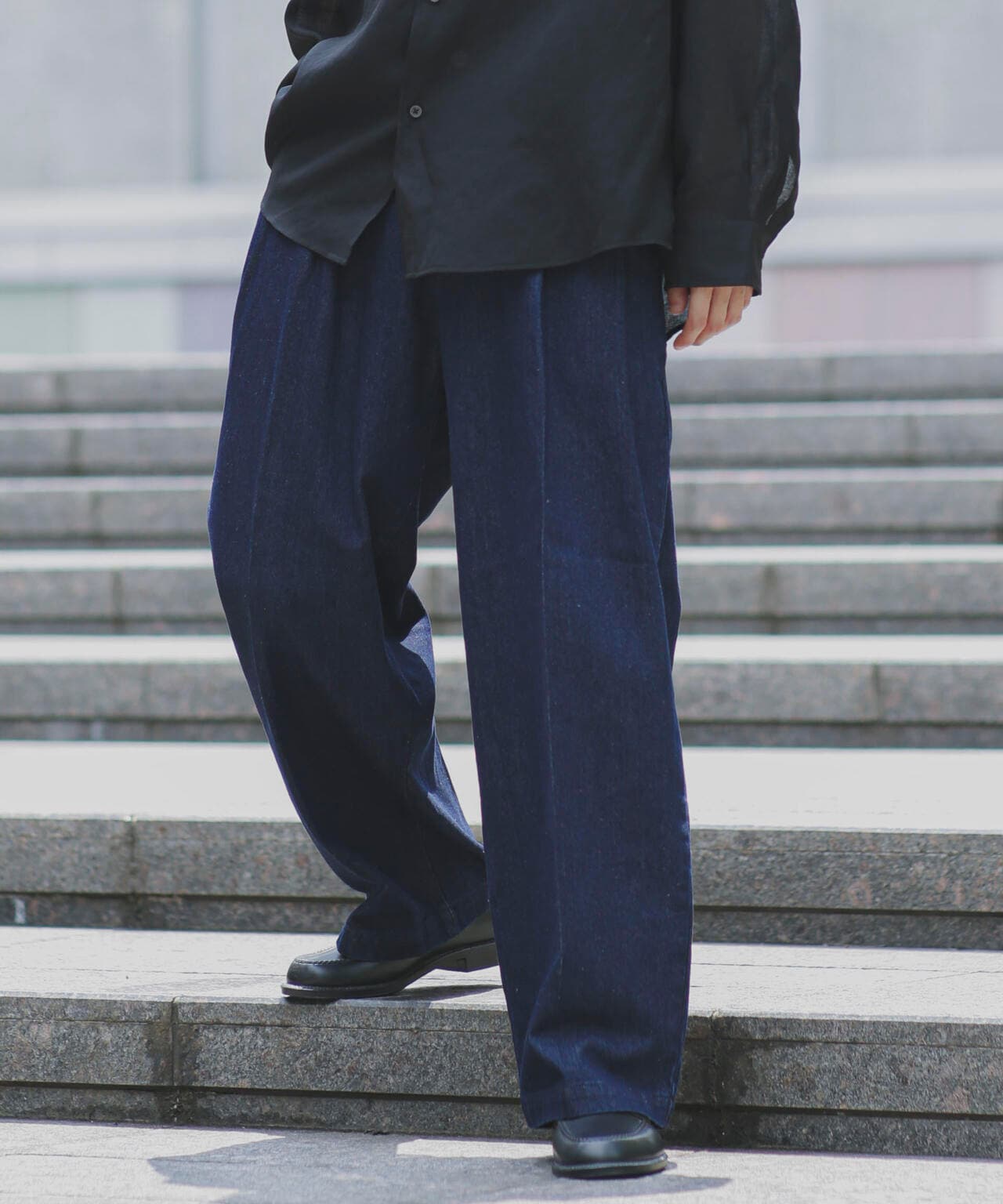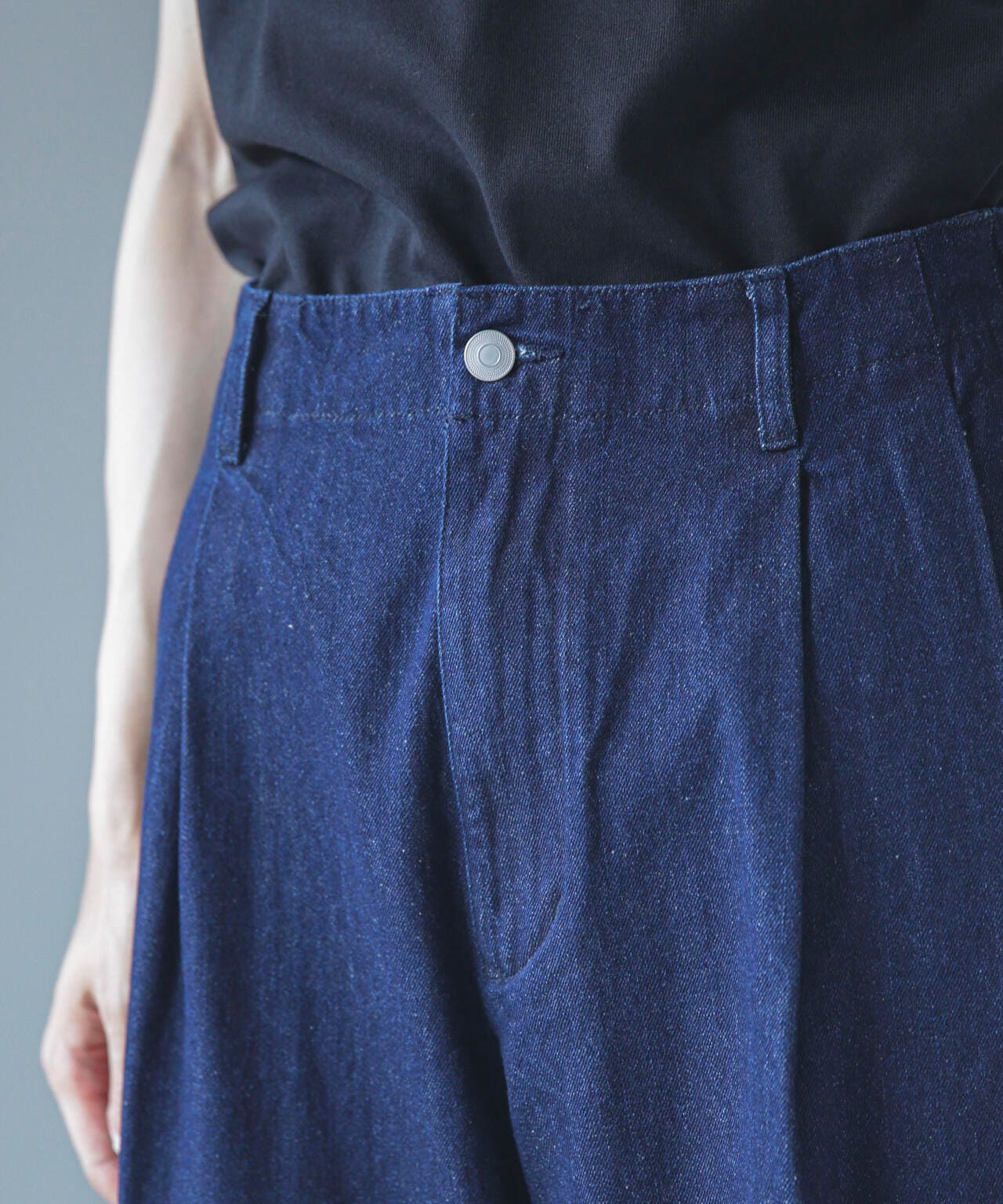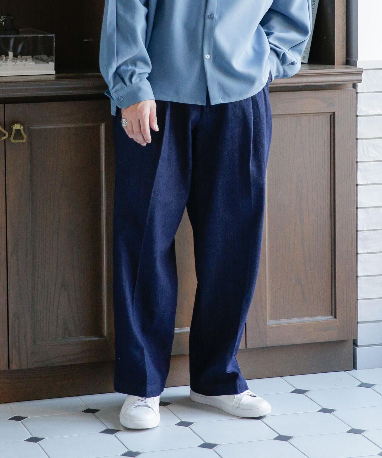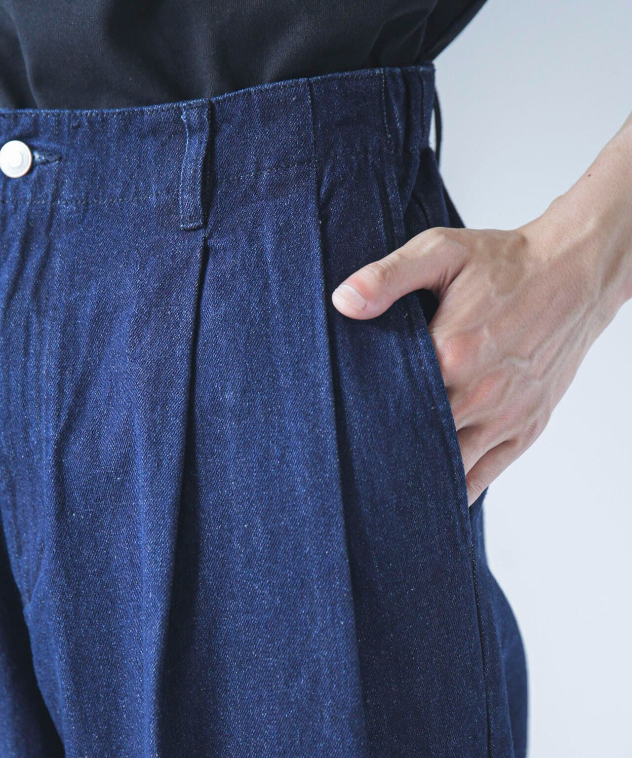 程よい肉感のデニムに2タックを施し腰、ヒップ回りにゆとりを持たせたワイドシルエット。