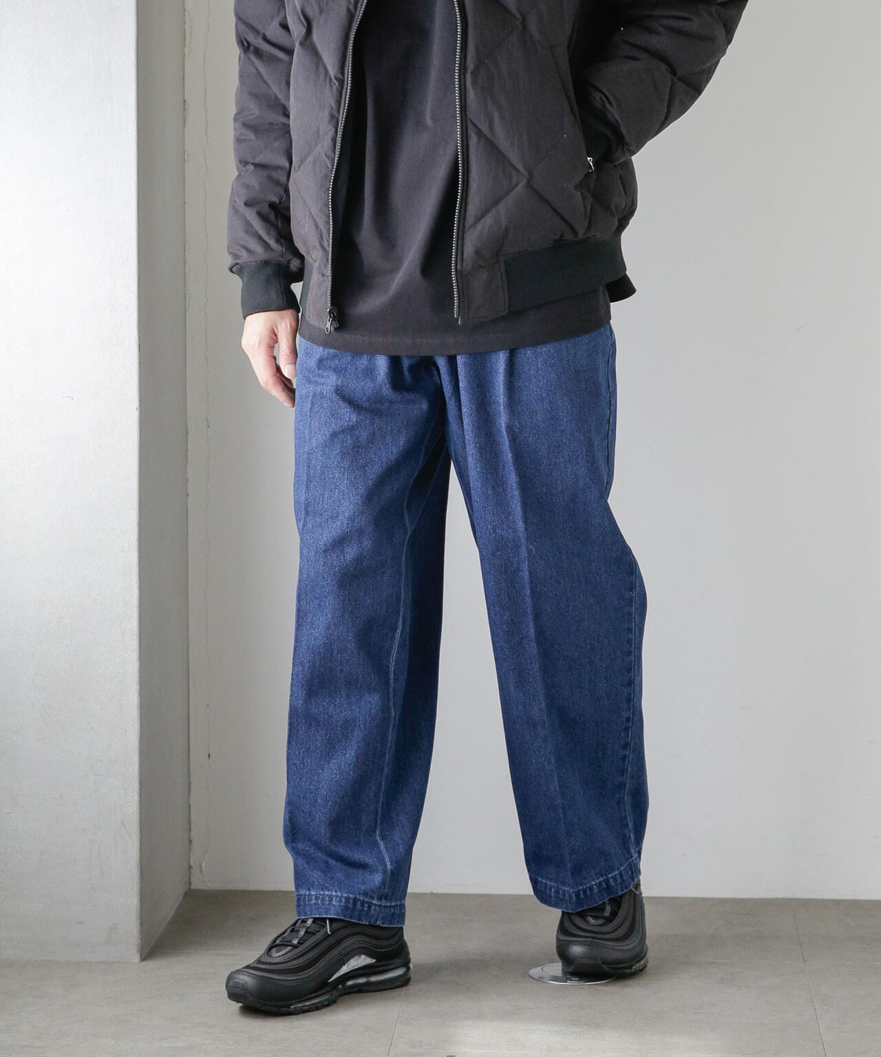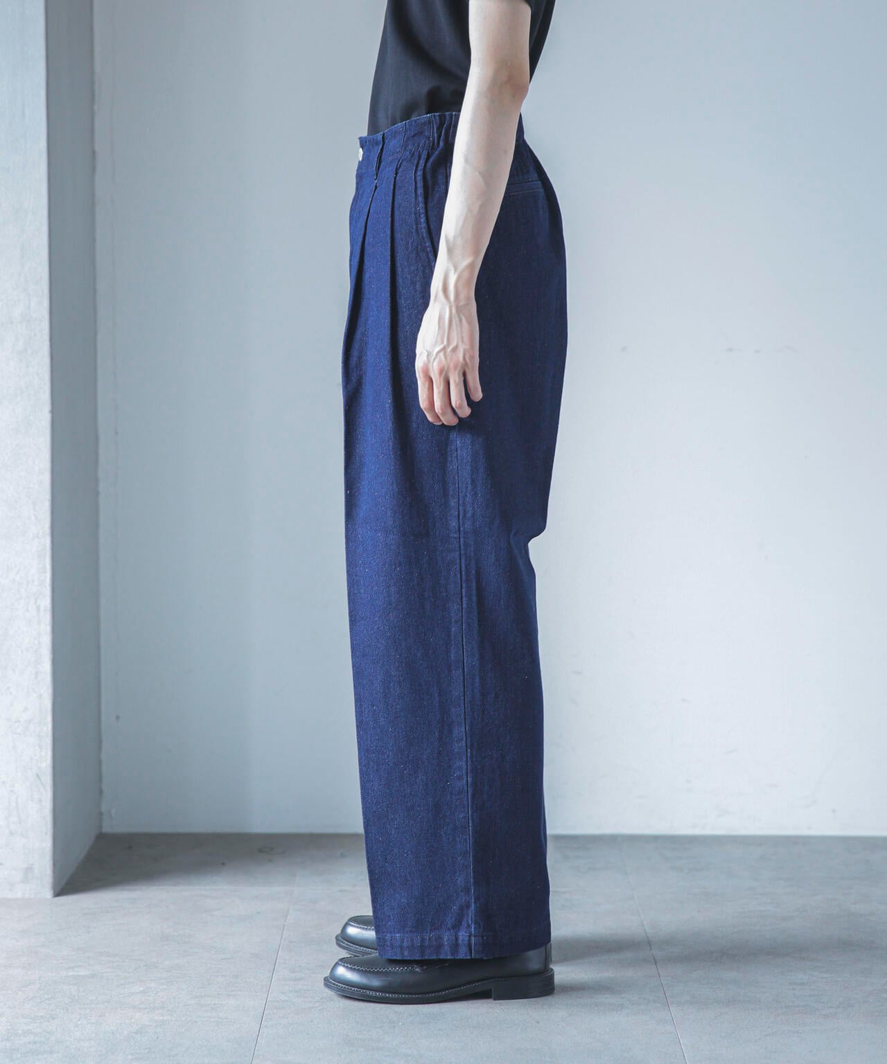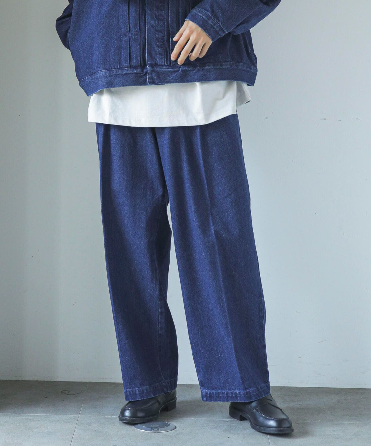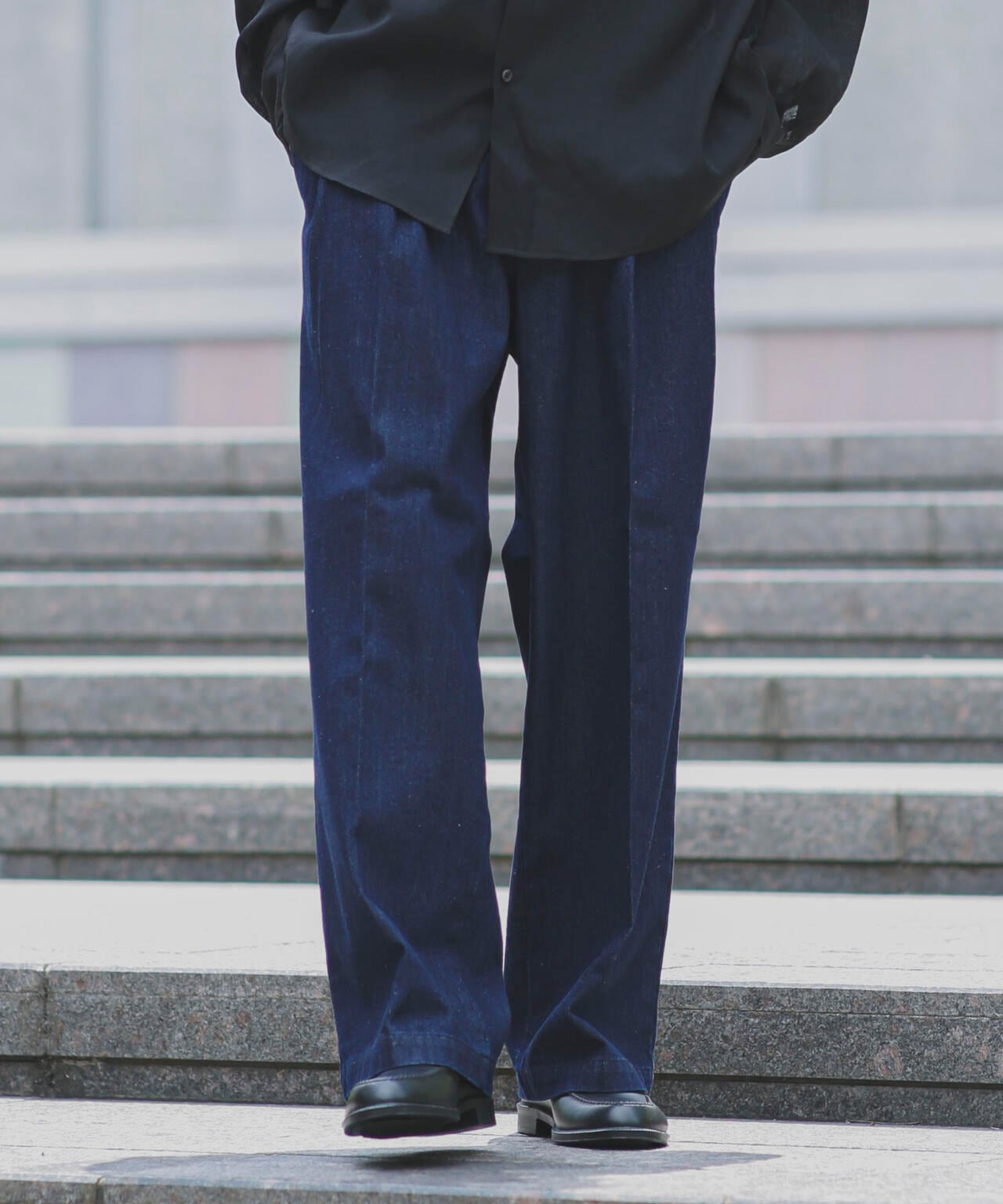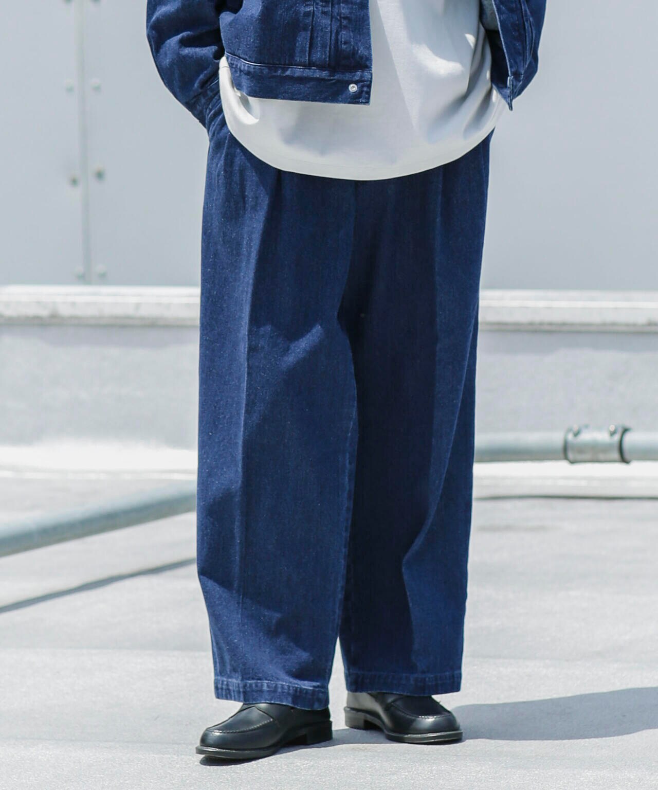 程よい肉感のデニムに2タックを施し腰、ヒップ回りにゆとりを持たせたワイドシルエット。
