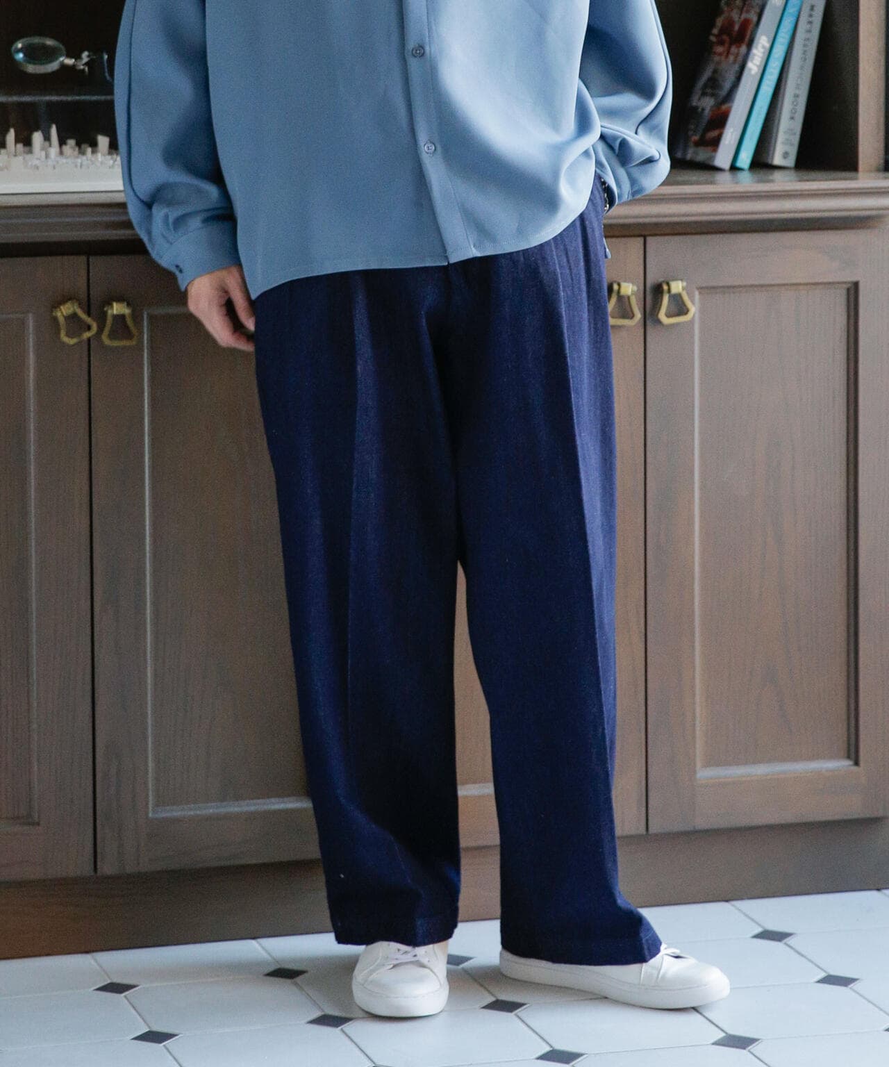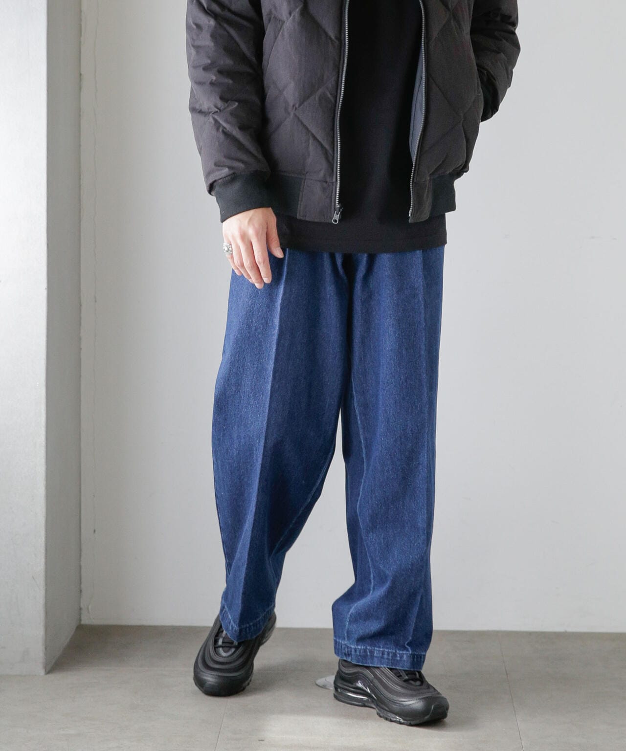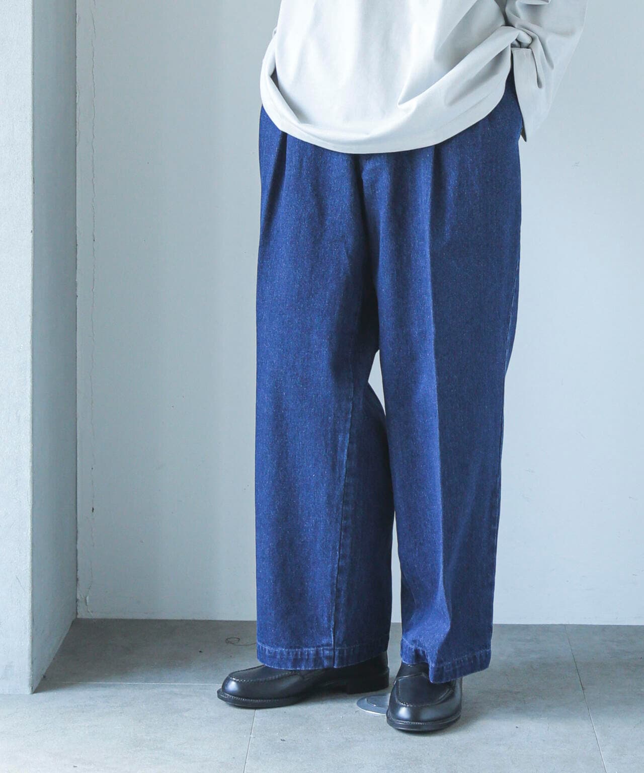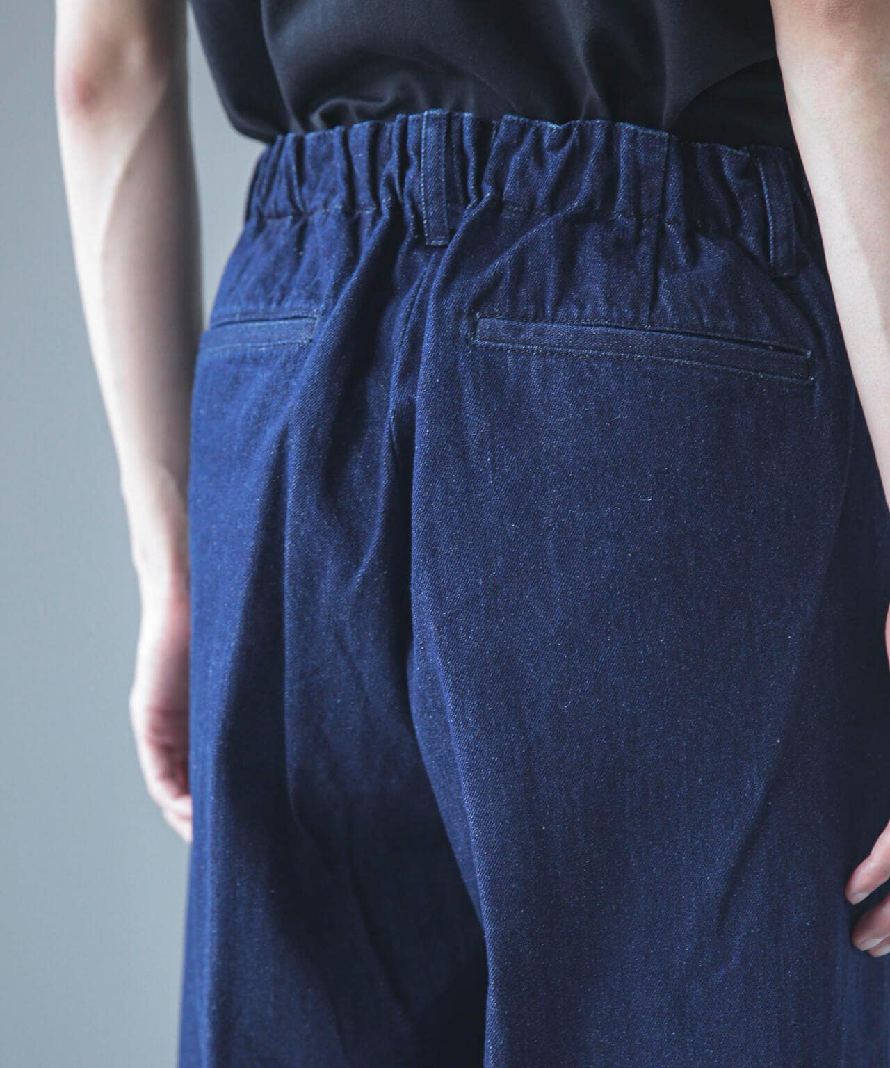 程よい肉感のデニムに2タックを施し腰、ヒップ回りにゆとりを持たせたワイドシルエット。