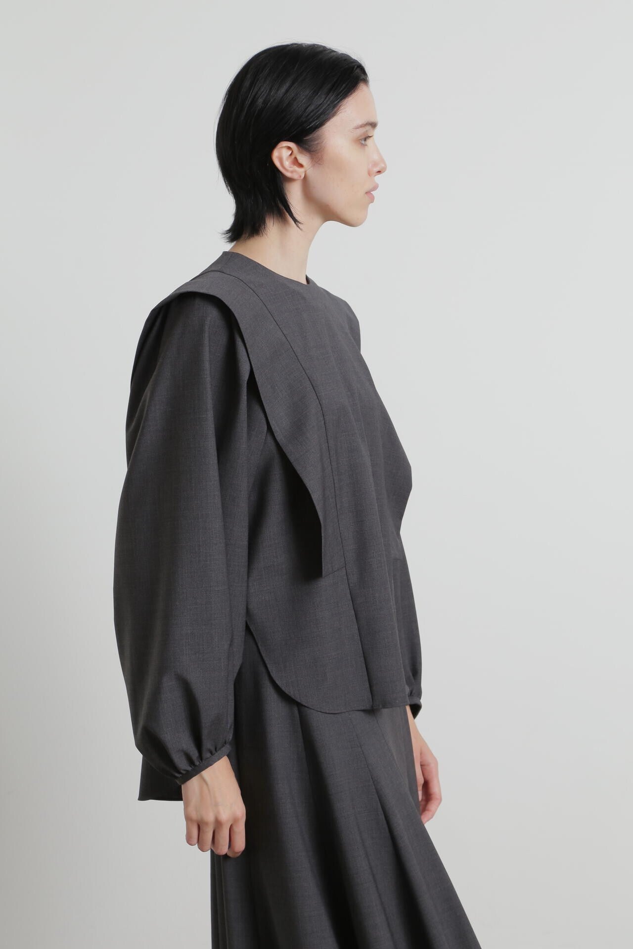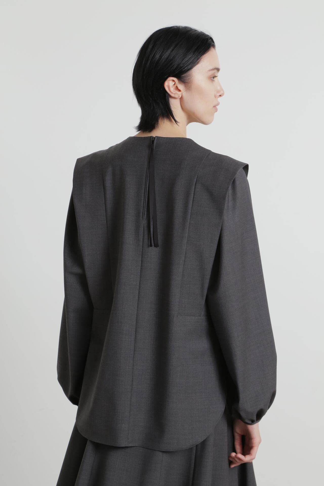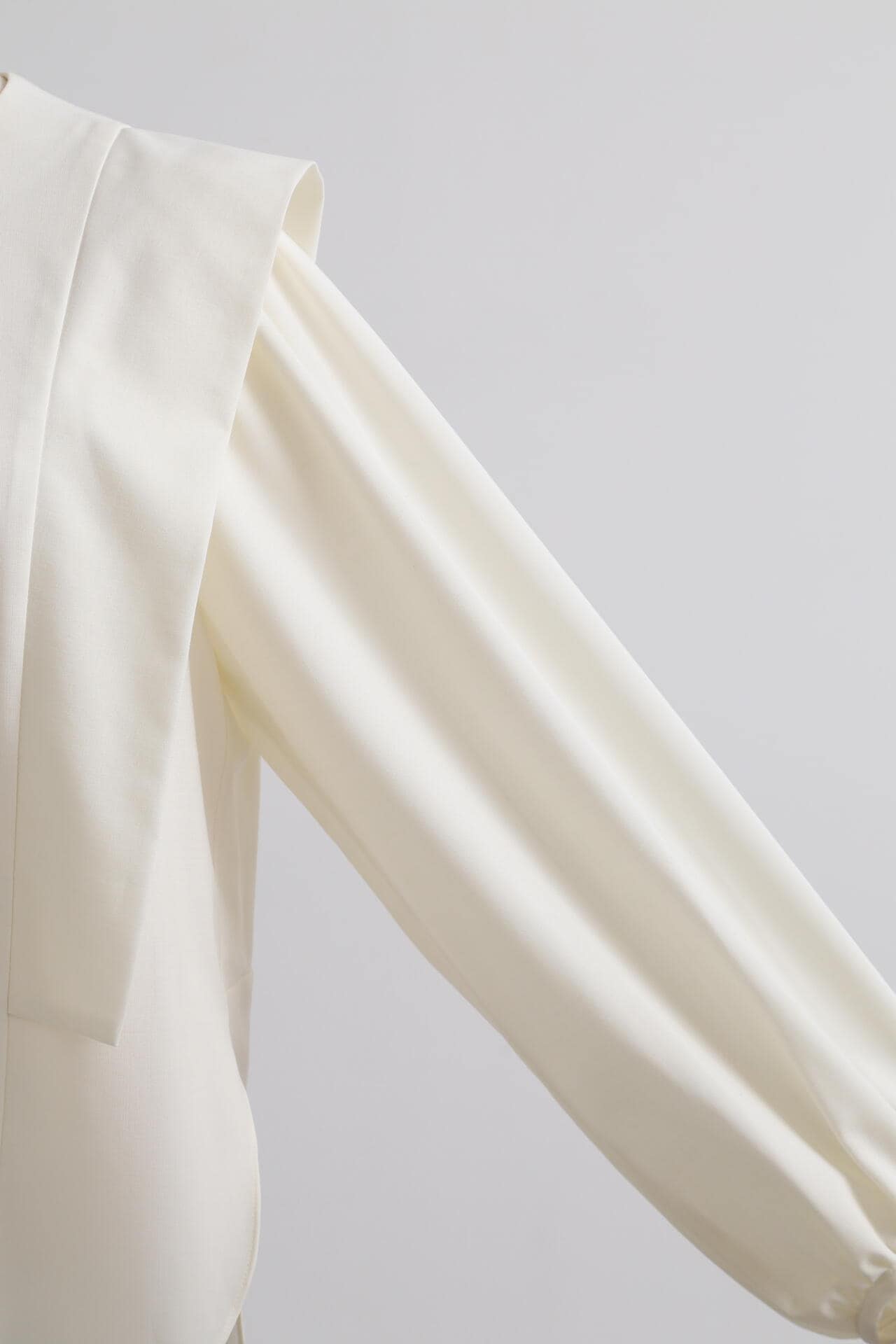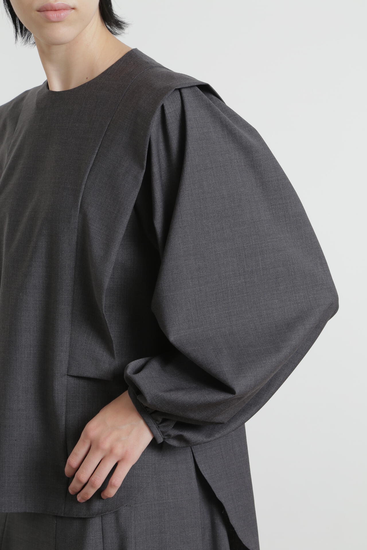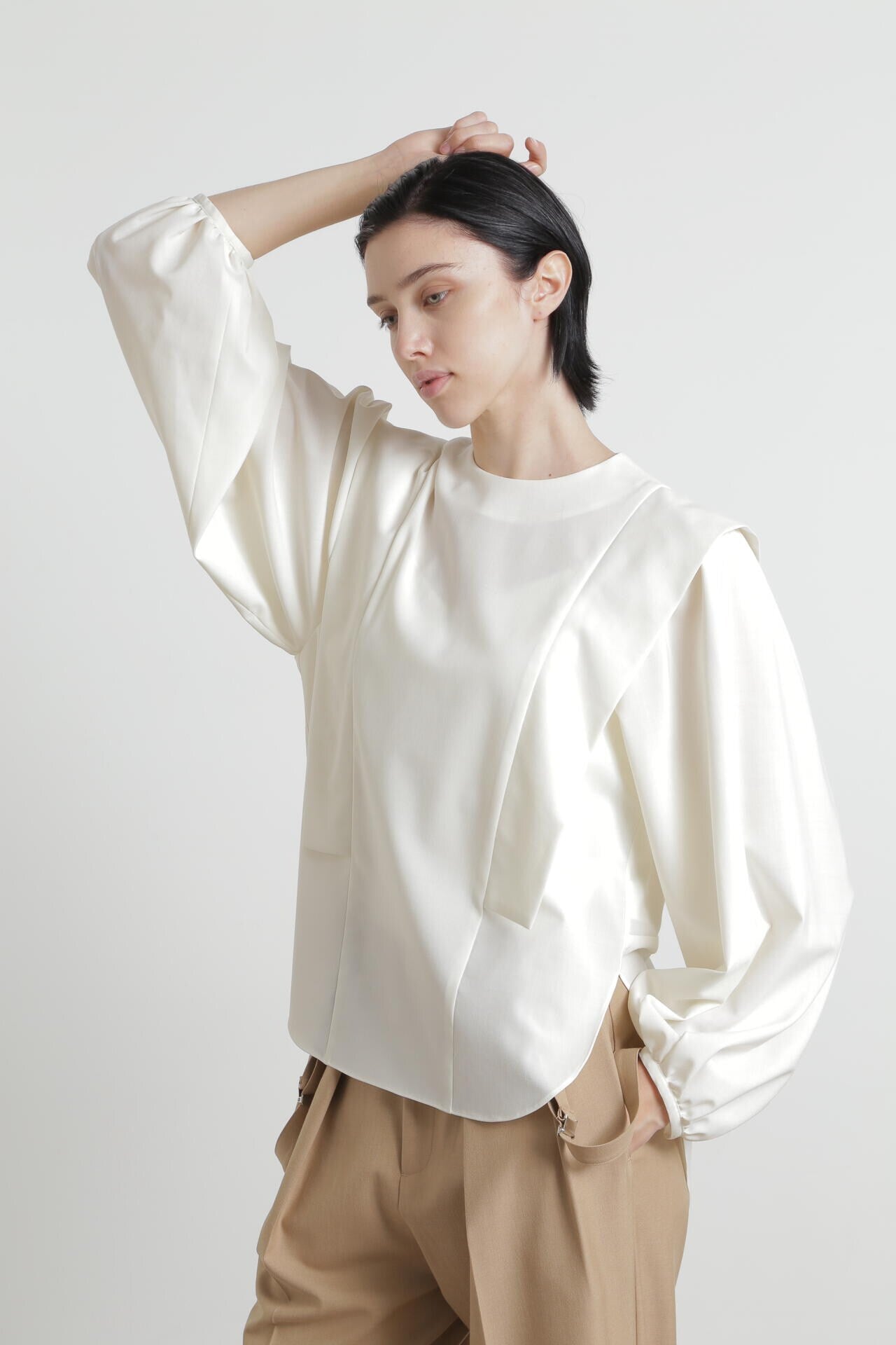 クールな表情を醸し出すショルダータックと、ボリュームスリーブが着映えするブラウス。