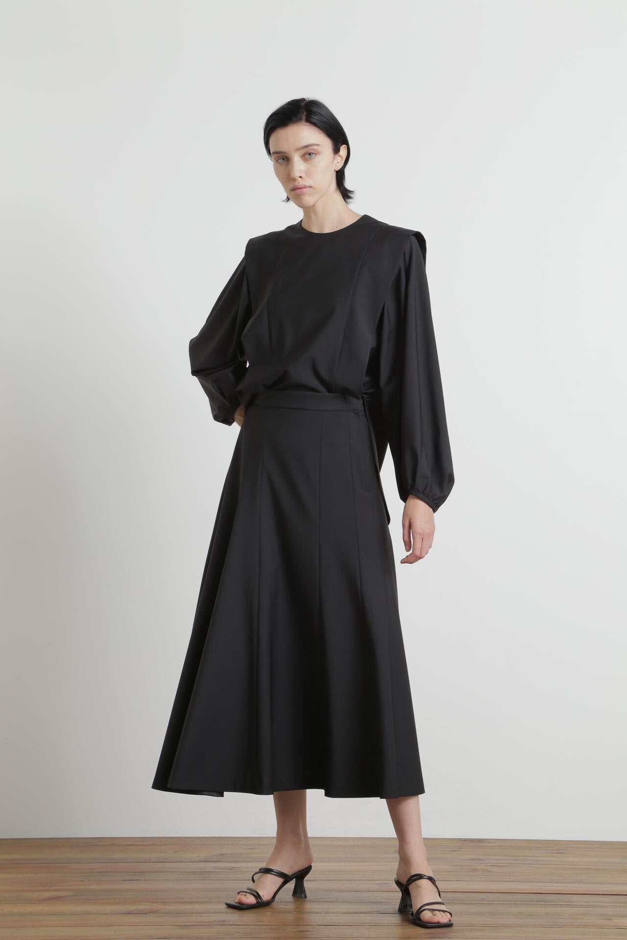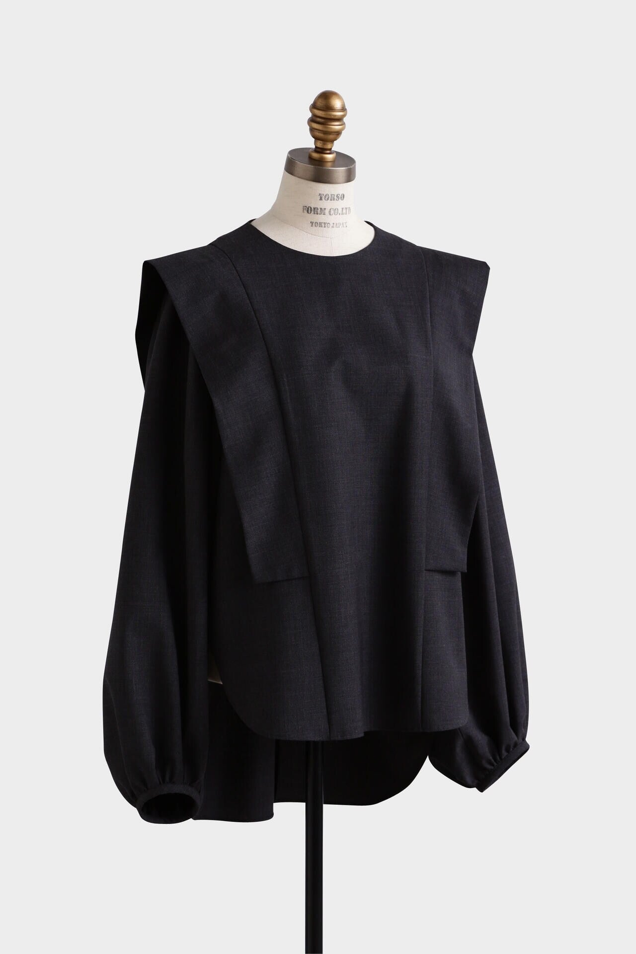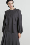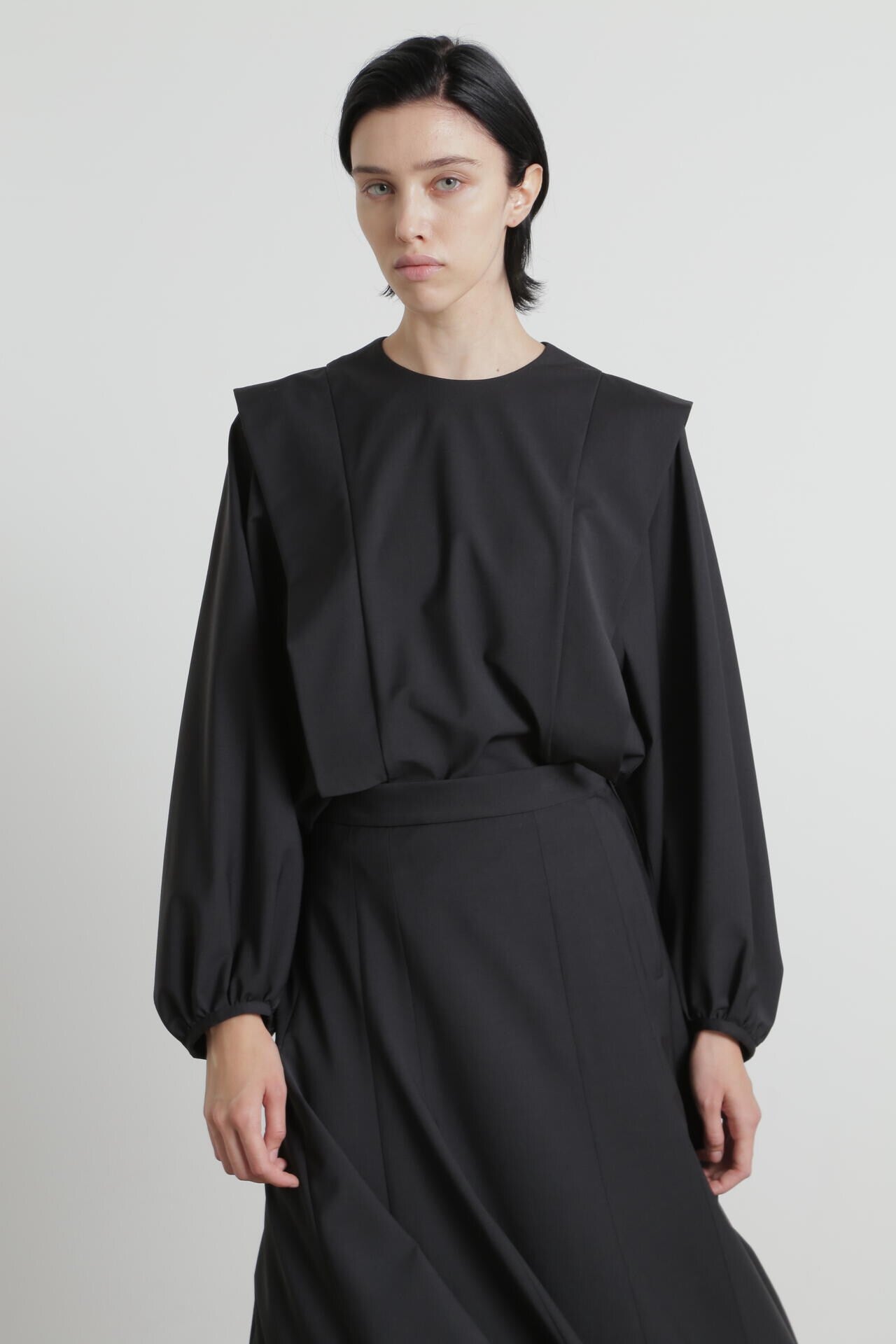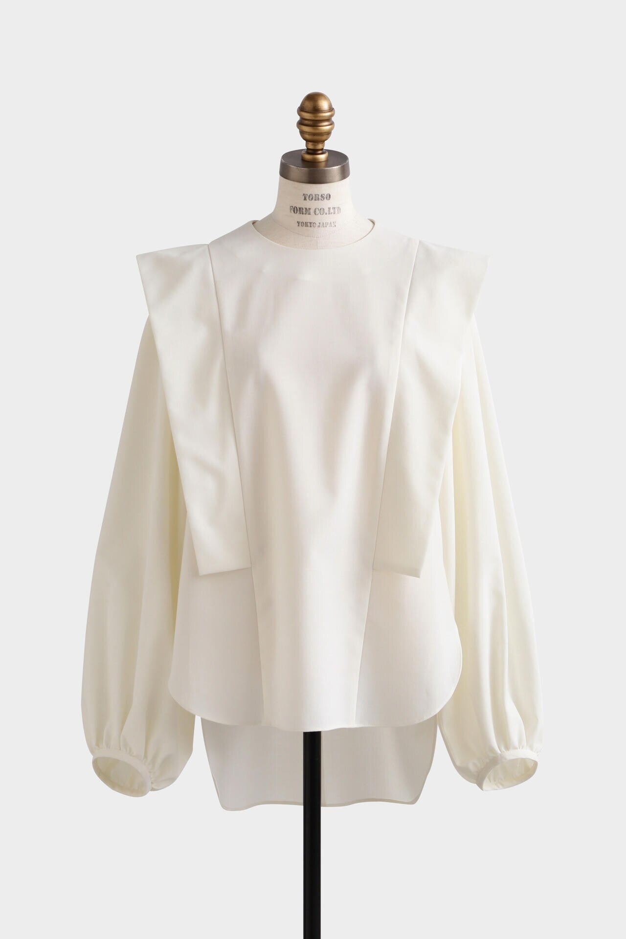 クールな表情を醸し出すショルダータックと、ボリュームスリーブが着映えするブラウス。
