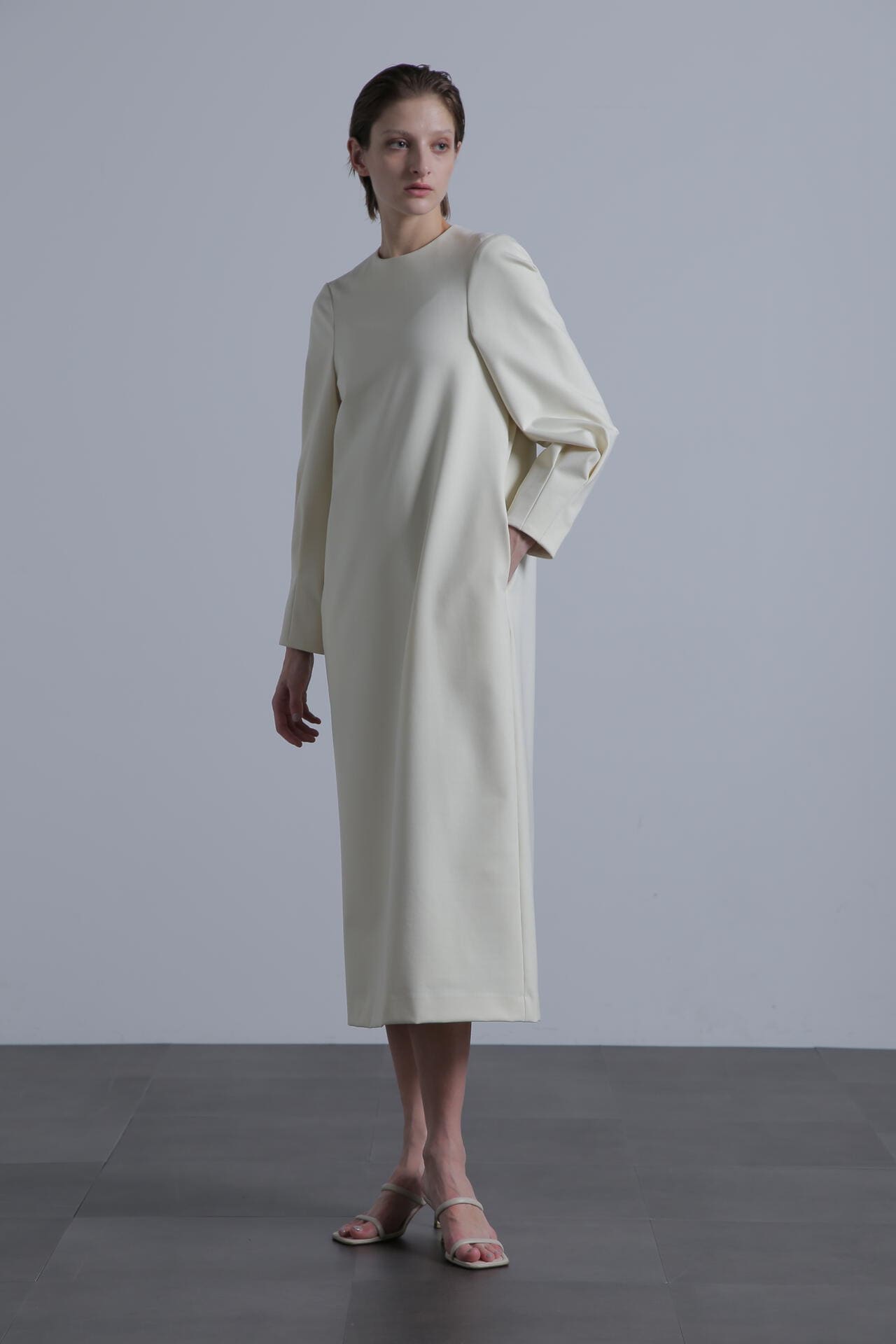 オンシーンにも活躍する適度なハリとふくらみ、ナチュラルな光沢があるのあるポンチ素材を使用し、クリーンな印象に仕上げました。立体的な袖のフォルムでさりげなくモードさを加えたシックなドレス。バックのリボンがアクセントに。
