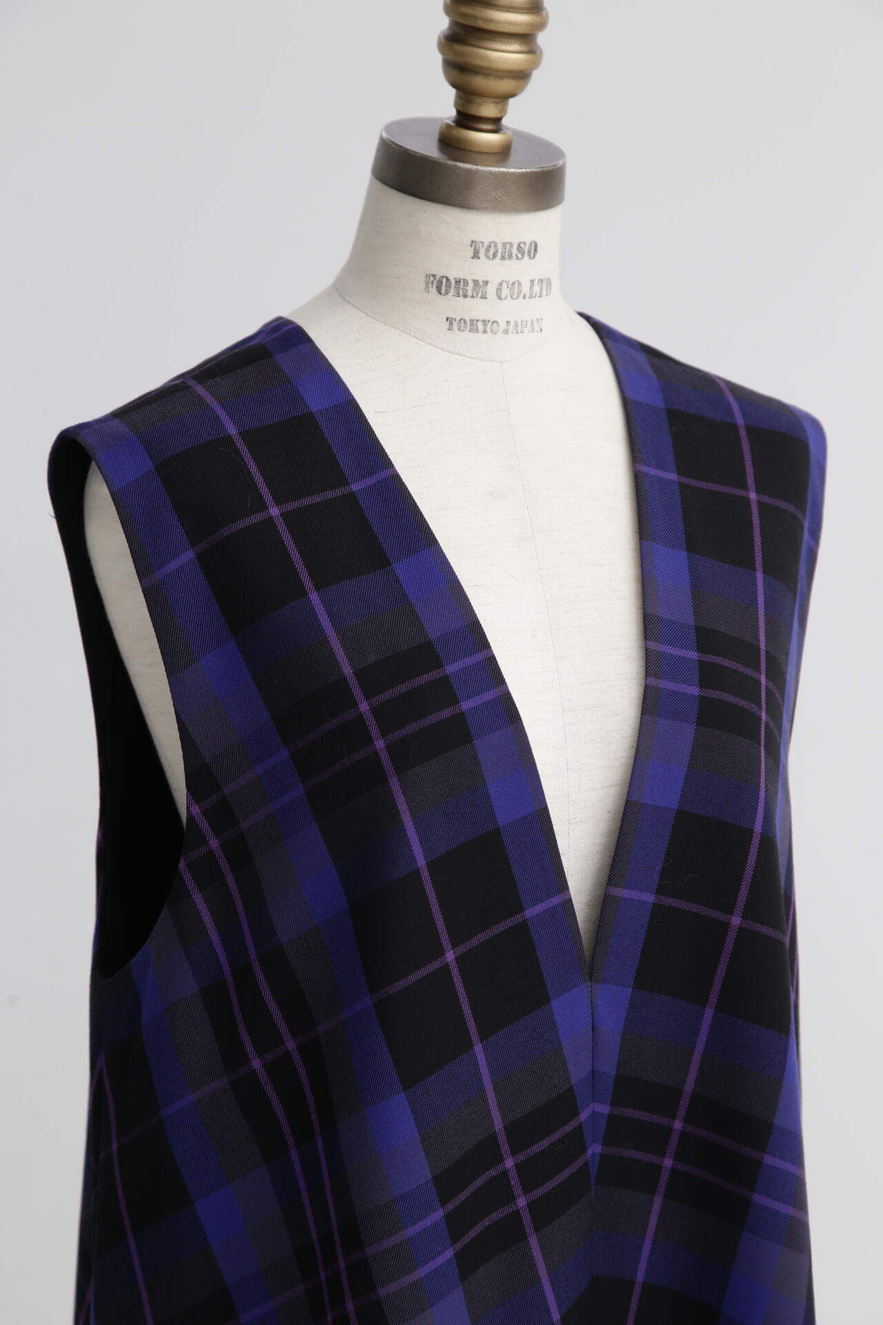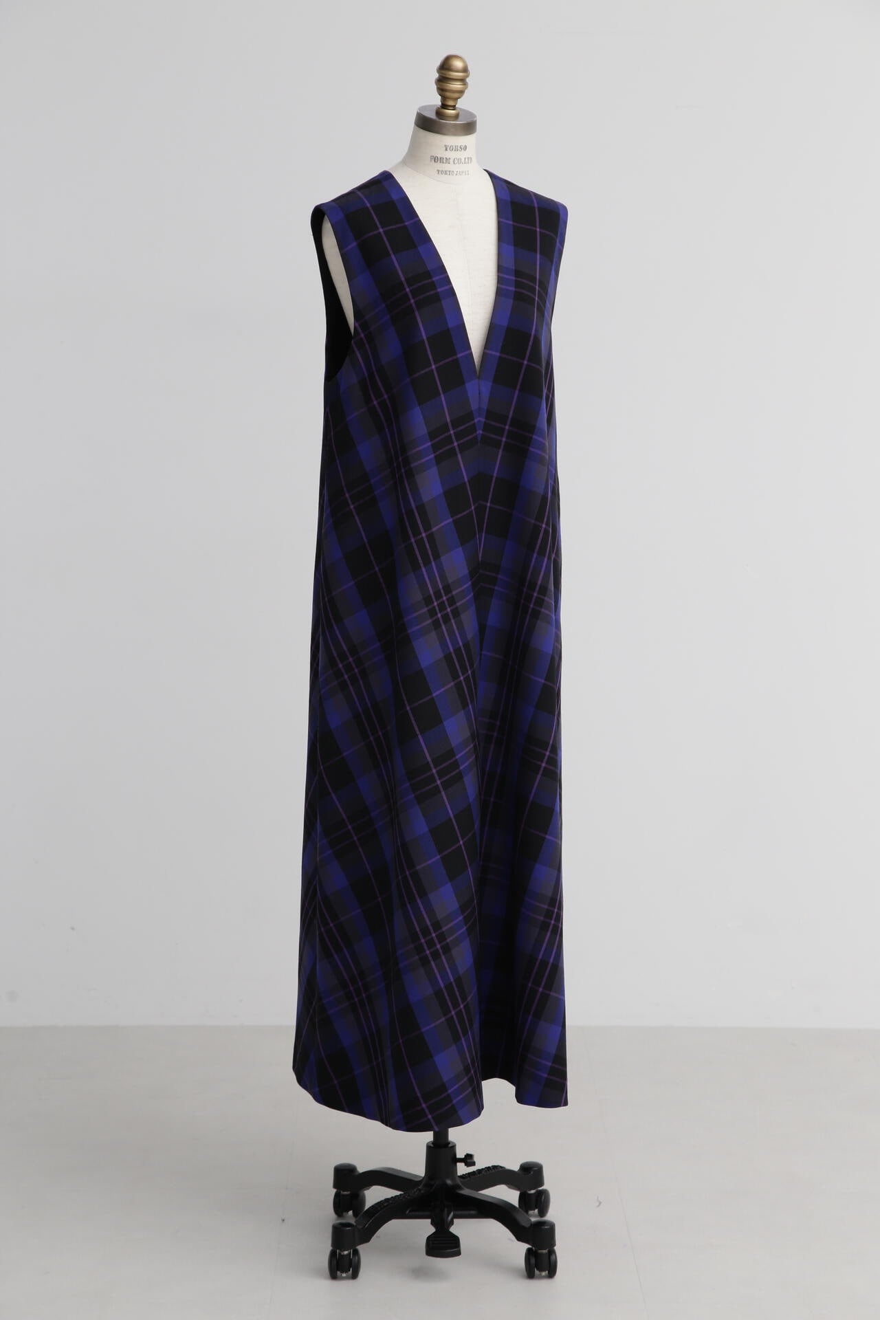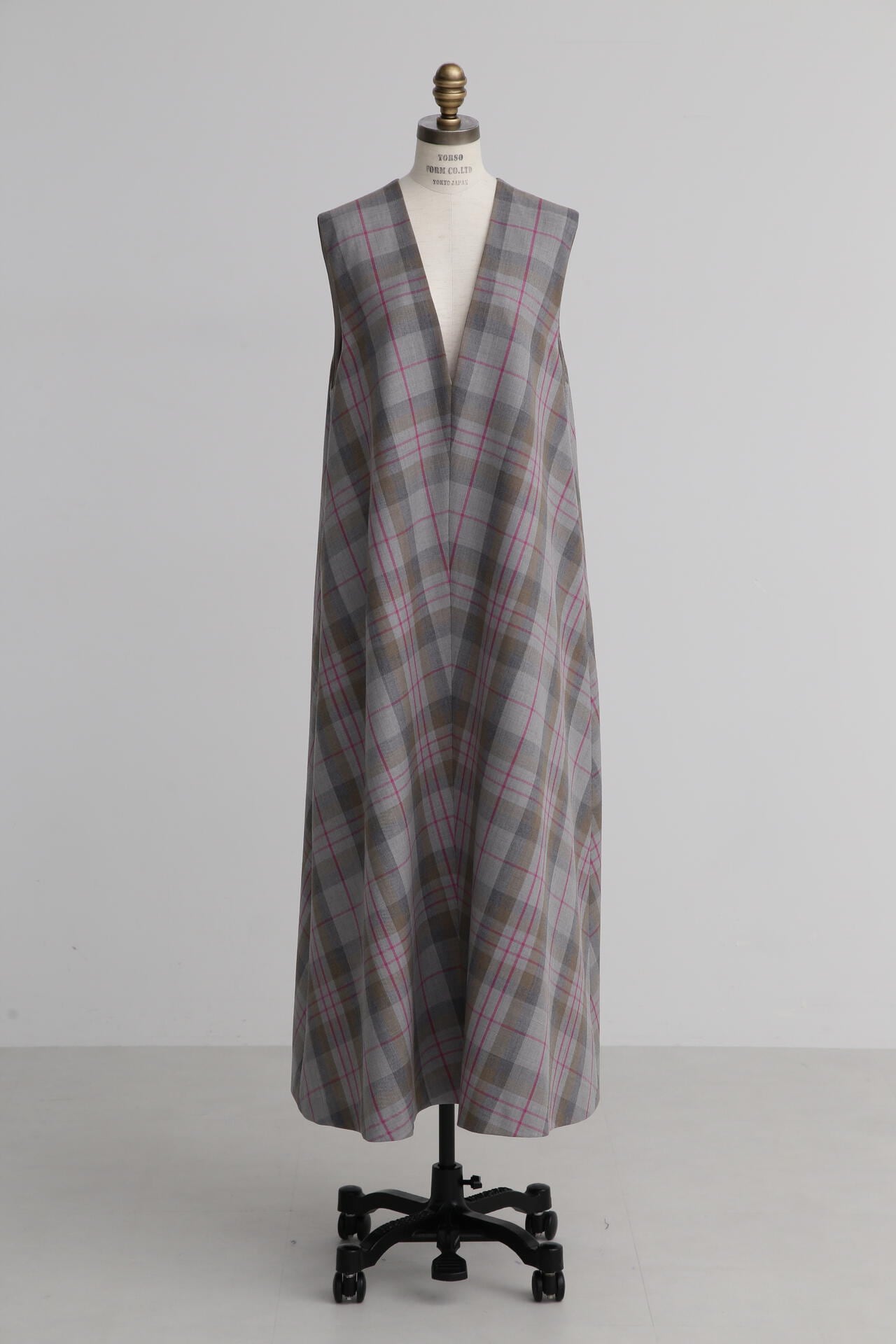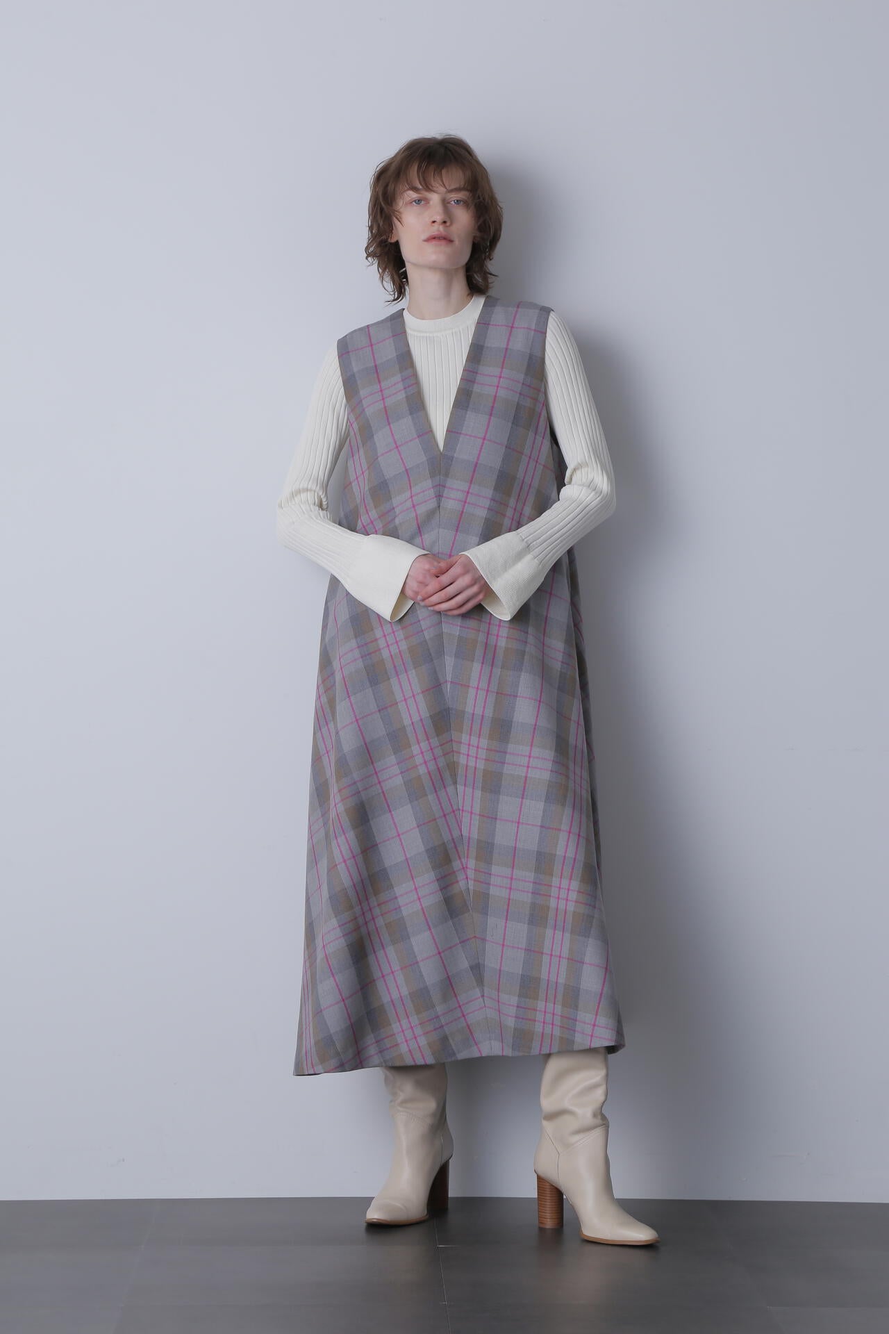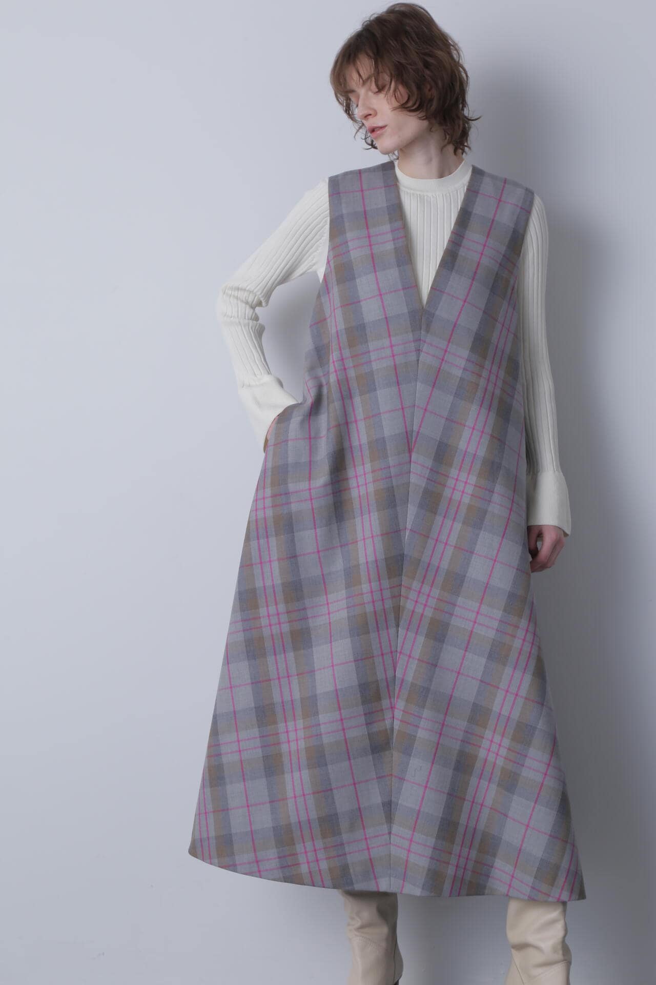 ピンクのアクセントカラーを加えた、トラッドとは一線を画す大柄チェックのDRESS。深めのシャープなVネックと、エレガントなラウンドネックの2WAYでご着用頂けます。2/48のウール素材を国内の尾州の産地でコンパクトなサージに織り上げ、さらにハリ感を持たせる仕上げを施したオリジナルのチェック柄素材を使用しています。