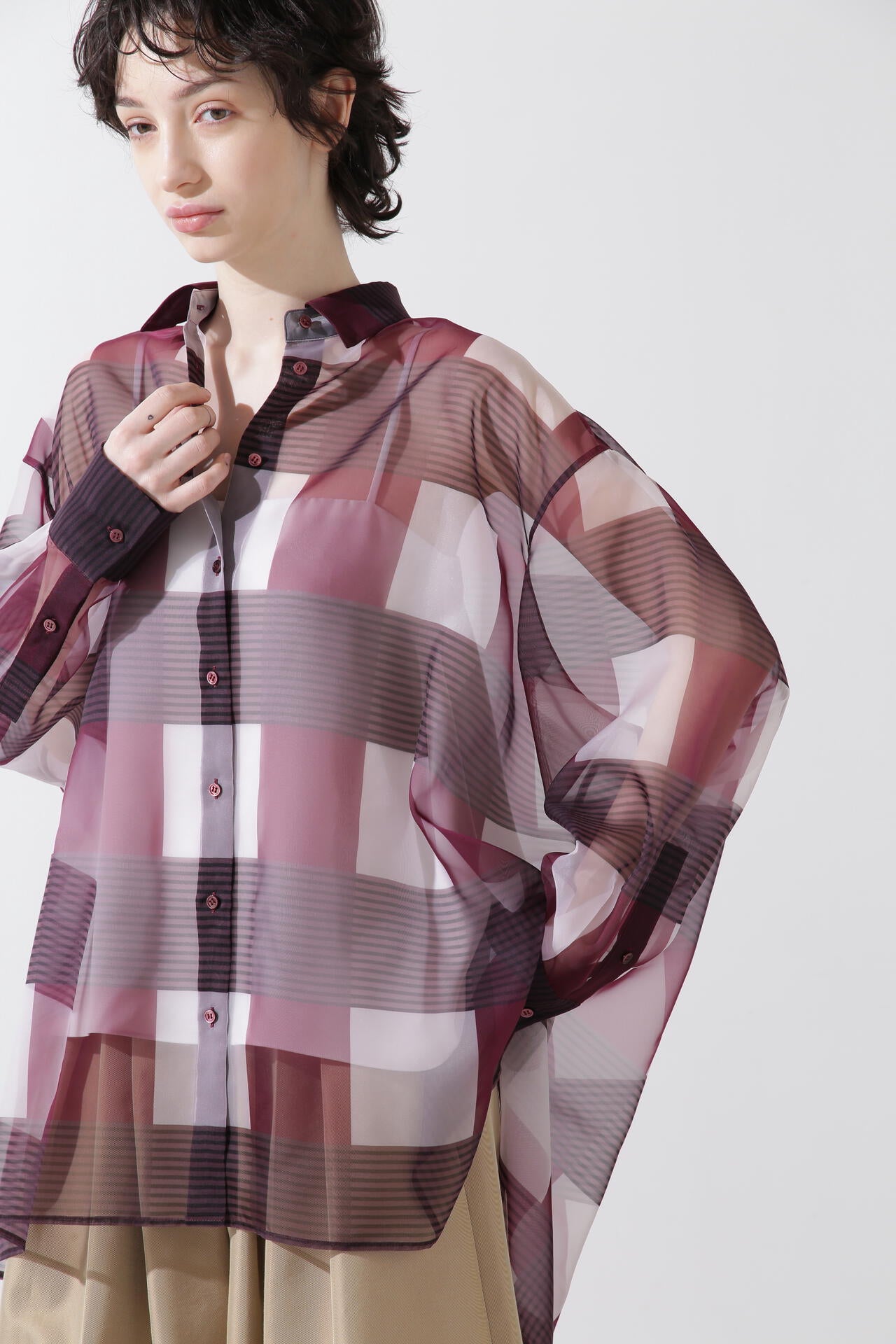 オリジナルプリントの大胆なブロックチェックをオーガンジーに乗せたシアーブラウス。グラフィカルな大柄ながらも、すっきりとまとめたカラーでシックに着用頂けます。リラクシーなフォルムは、さらりと羽織風に着れるオーバーシャツとして。