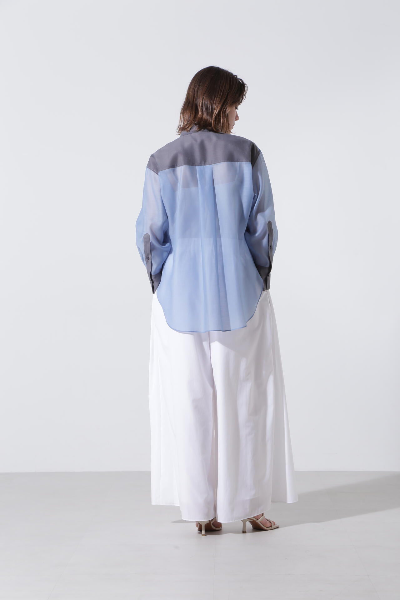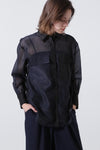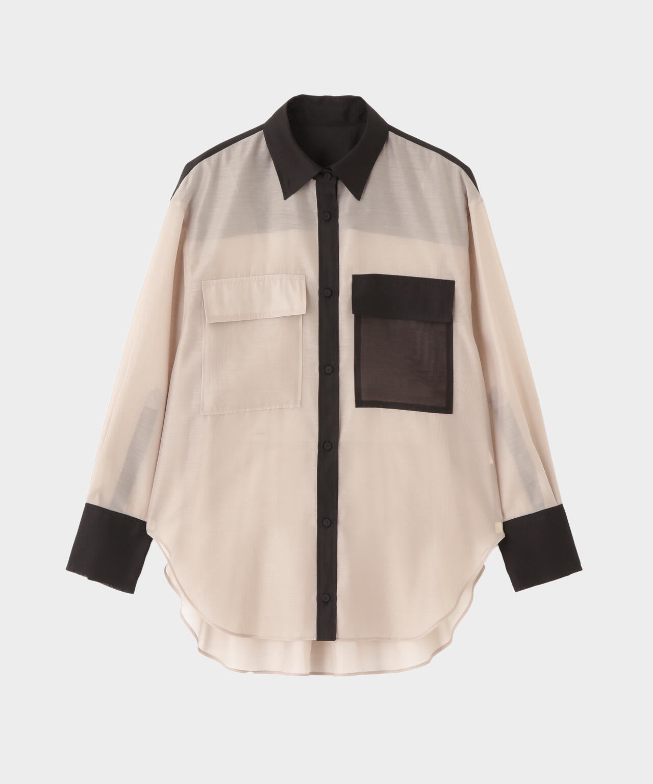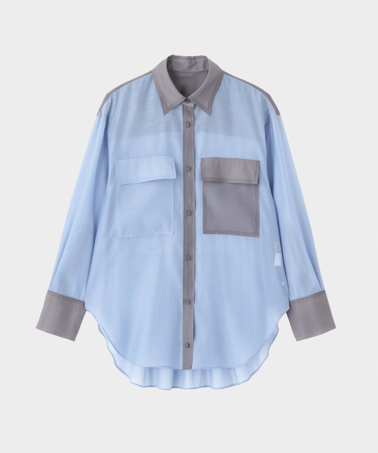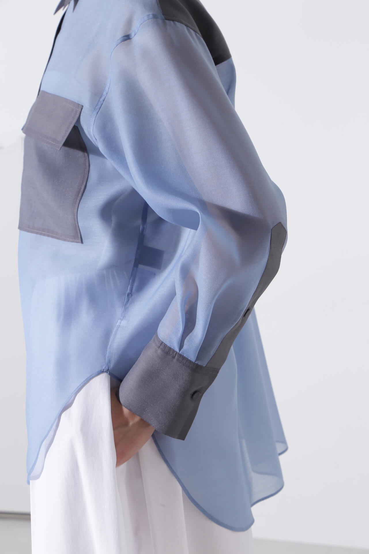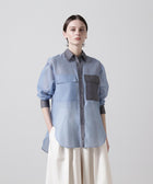 ポリエステルのマットなオーガンザ のミニマルなブラウスを、カラーブロッキングで仕上げたデザインブラウス。インナーにキャミをレイヤードして1枚着として、また夏のライトな羽織りとしても活躍するシアーブラウスです。しなやかさと適度なハリが美しいマテリアルを使用しました。