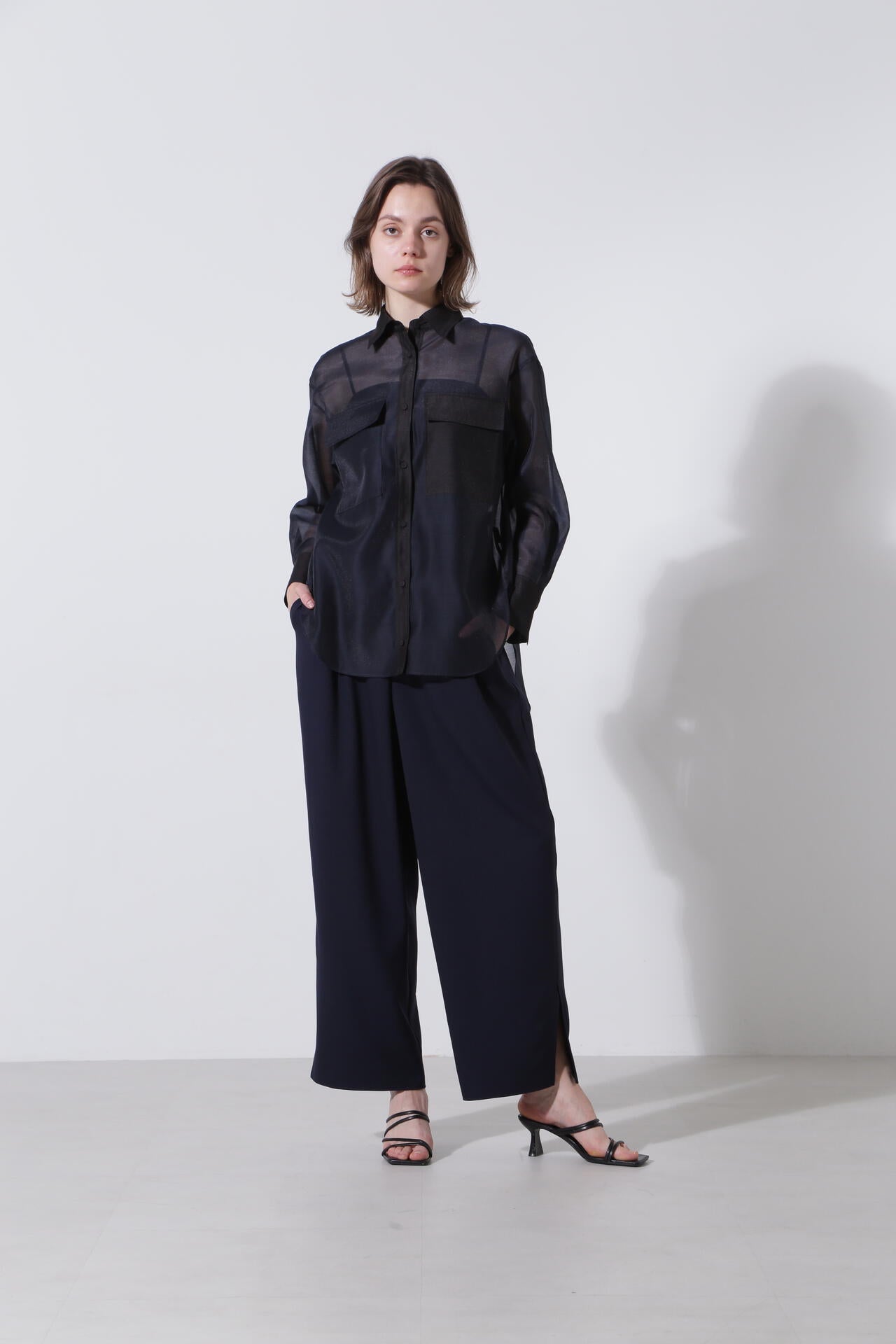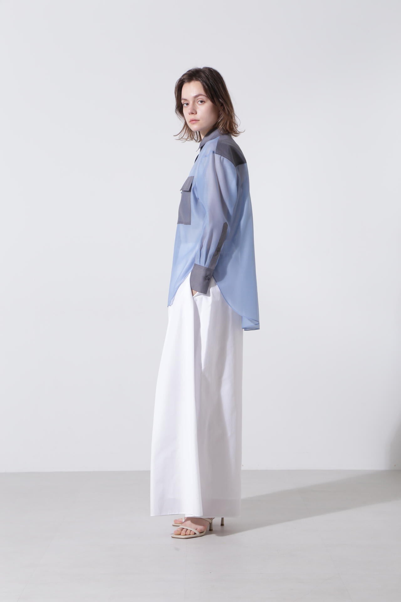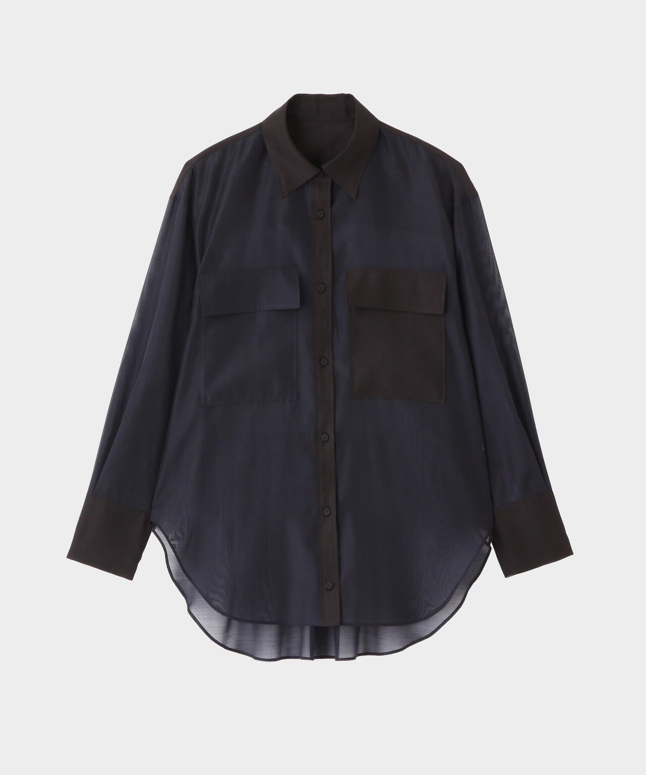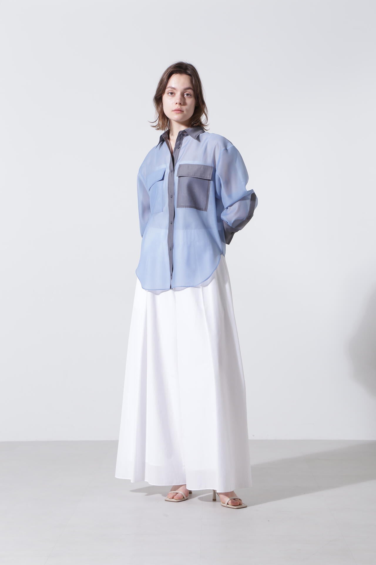 ポリエステルのマットなオーガンザ のミニマルなブラウスを、カラーブロッキングで仕上げたデザインブラウス。インナーにキャミをレイヤードして1枚着として、また夏のライトな羽織りとしても活躍するシアーブラウスです。しなやかさと適度なハリが美しいマテリアルを使用しました。
