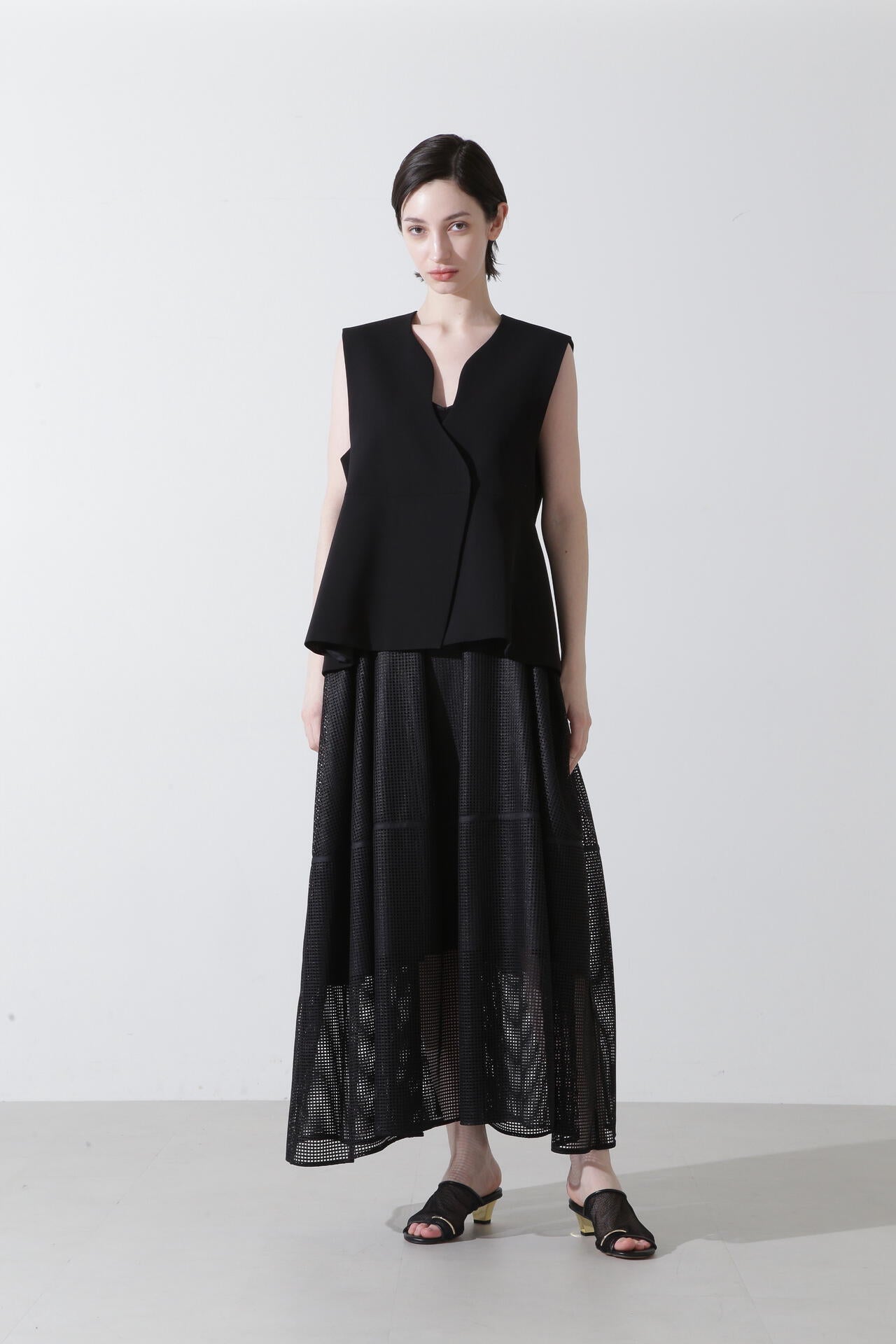 シンプルなコーディネートをアップデートしてくれるメッシュレースのスカート。メッシュ素材に樹脂コーティング加工を施し、ハリとツヤを加えた素材がトレンド感たっぷりのタックスカートです。ポリエステルタフタとの2重構造により、透けずにボリュームを持たせました。