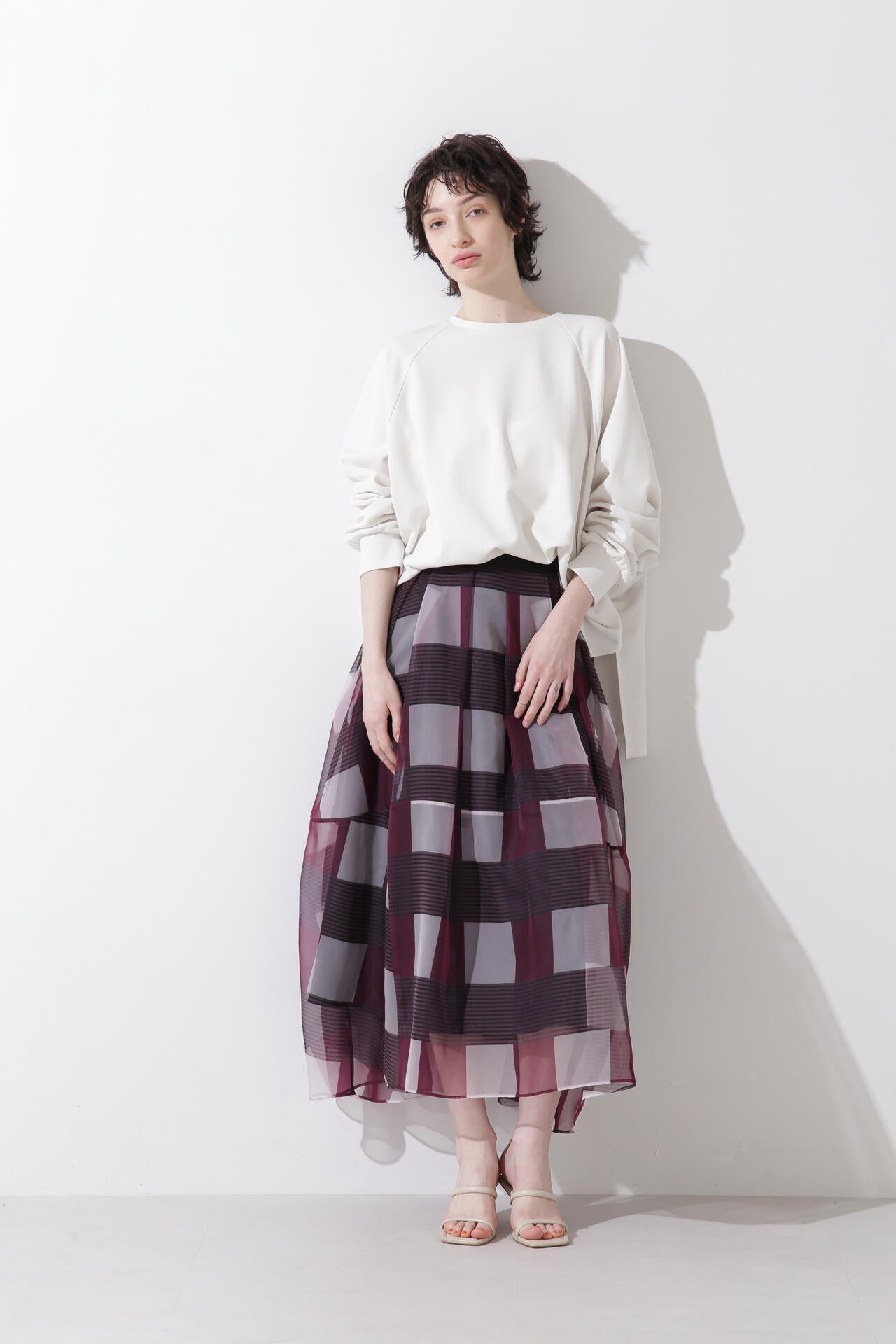 オリジナルプリントの大胆なブロックチェックをパネルでグラフィカルにアレンジをしたシアースカート。グラフィカルな大柄ながらも、すっきりとまとめたカラーでシックに着用頂けます。